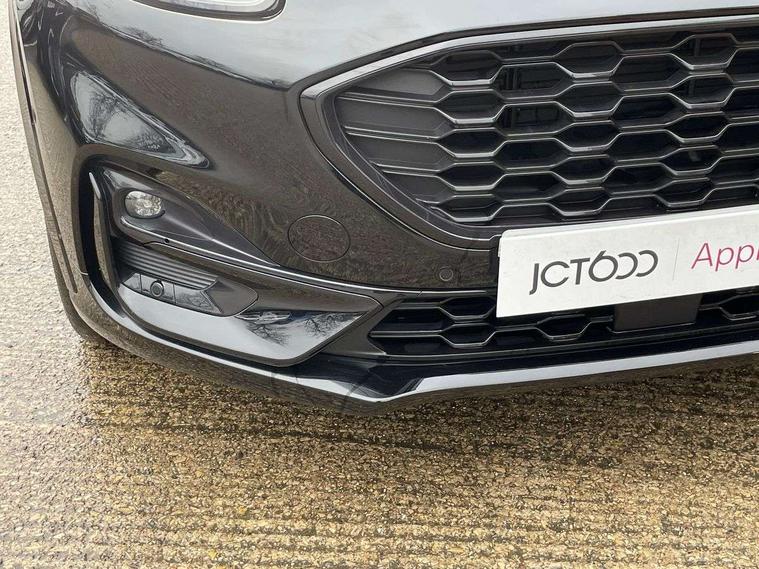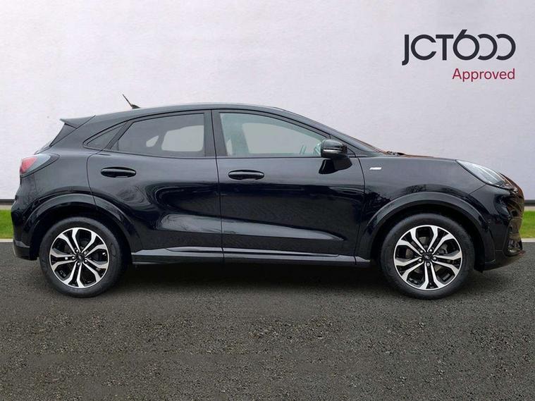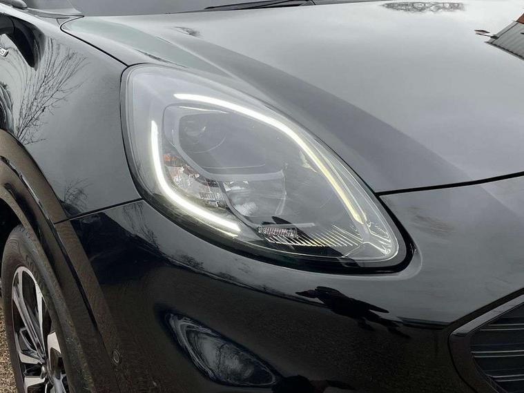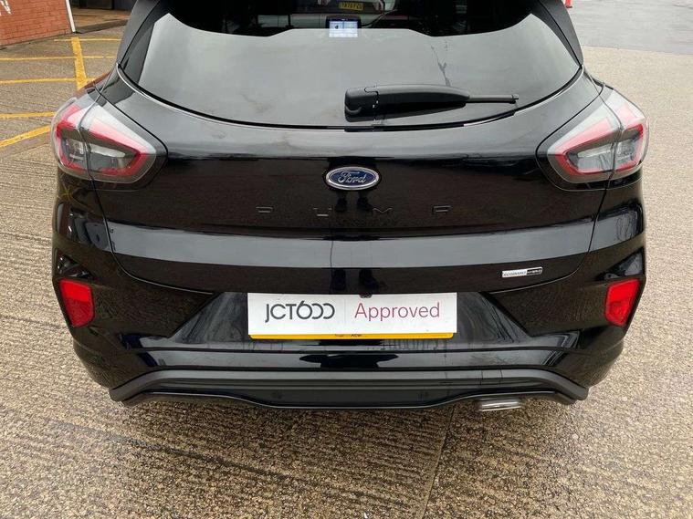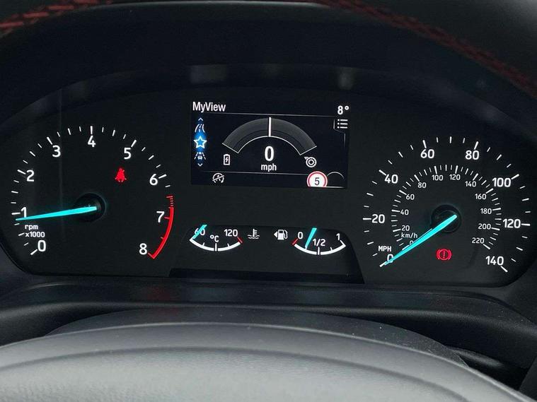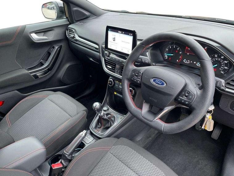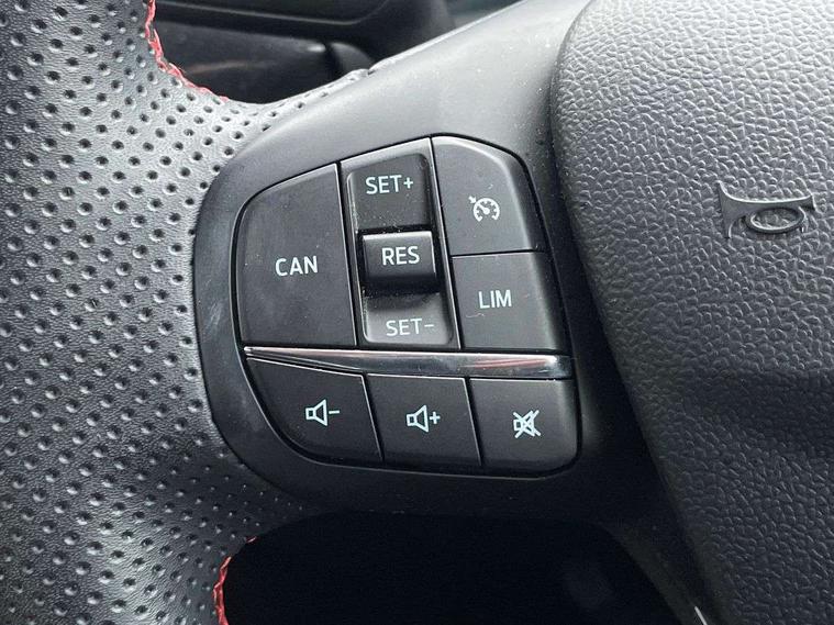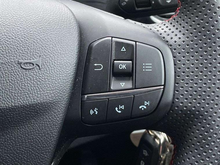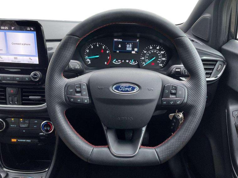 Driver impairment monitor, Emergency call service, Ford easy fuel, Full digital 12.3" instrument cluster, Lane keeping aid with lane departure warning, Power assist steering, Power start button, Rear parking sensor, Selectable drive modes(Normal, Eco, Sport, Slippery and Trail), Speed sign recognition, Sport suspension, Automatic headlights with auto high beam, Automatic rain sensing wipers, LED rear lamps, Power foldable heated door mirrors with puddle lamps, Projector headlamps with LED day time running lights and front fog lamps, Quickclear heated windscreen, Rear side wing doors, Rear wiper, ST-Line body styling kit with unique grille and large body colour rear spoiler, Third brake light, 3 seat bench in 2nd row, Centre console with armrest and stowage, Ford megabox extended bootspace, Front and rear head restraints, Front floor mats, Manual 2 way passenger seat adjustment, Manual 4 way driver seat adjust with lumbar adjustment, Single front passenger seat, ST- Line cloth trim with red stitching, ST-Line flat bottomed sensico leather steering wheel with leather handbrake and aluminium gear knob, Ford SYNC 3 navigation pack - Puma, 3 rear seatbelts, Child safety lock, Electronic stability control (ESC) and hill start assist, Pedestrian/cyclist detection & post-collision braking, Pre collision assist system, Tyre pressure monitoring system (TPMS), Thatcham alarm,