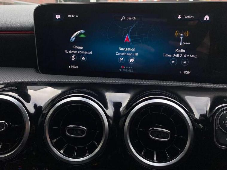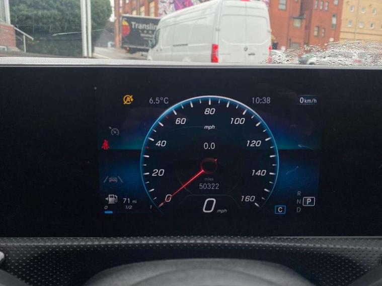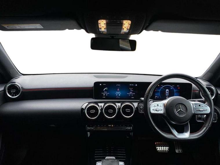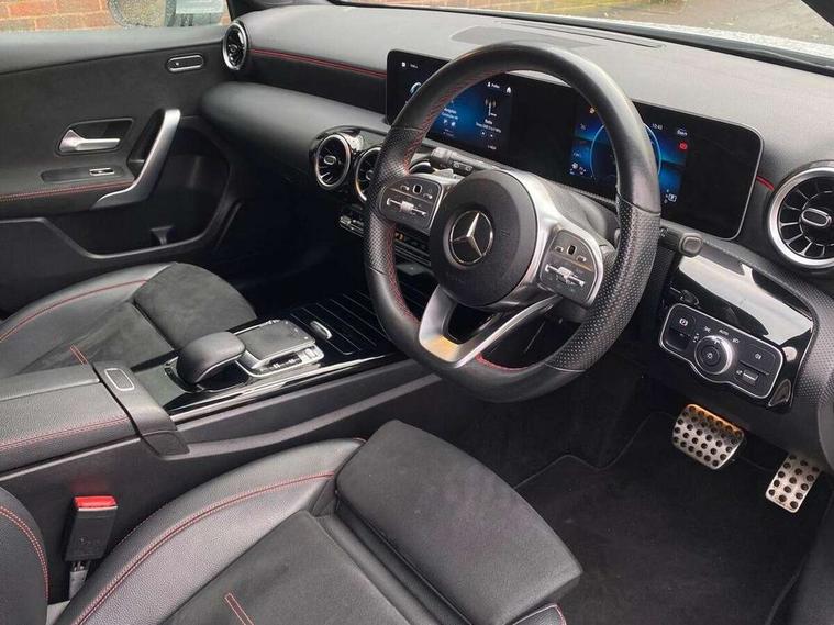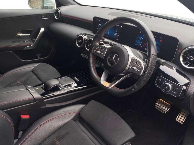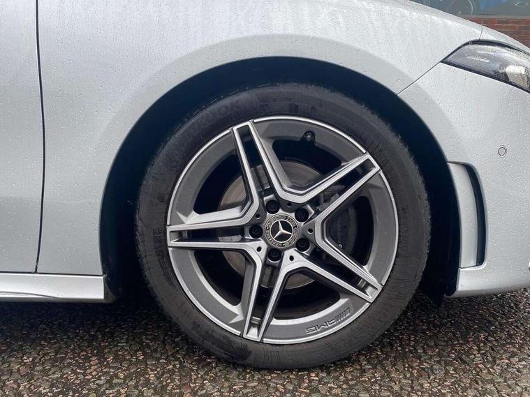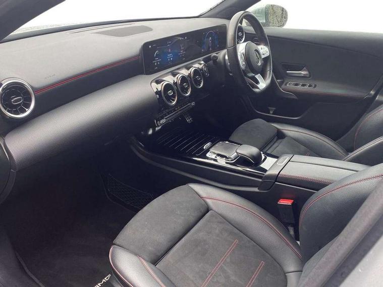 180 degree rear view camera with parking guidelines, 7" colour screen in instrument panel, Active lane keep assist, Active park assist with parktronic system including front and rear parking sensors, Attention assist, Brake pad wear indicator warning light, Direct steering, Dual bluetooth interfaces, DYNAMIC SELECT with a choice of driving modes (ECO, Comfort, Sport and Individual), ECO start/stop function, Fluid level warning indicator for fuel, oil, coolant and washer fluid, Hard-disk navigation, Hey Mercedes Voice activation, Lamp failure indicator, Mercedes me connect including emergency call system, accident recovery, breakdown management and maintenance, Outside temperature gauge, Owners manual in English, Radio aerial integrated into roof spoiler, Service indicator (ASSYST), Speed sensitive power steering, Trip computer, Lowered comfort suspension, 2 USB ports (type C) in rear stowage compartment and one in front of center console, DAB Digital radio, MBUX multimedia system with DAB digital radio and touchpad including satellite navigation, Mercedes-Benz sound system - 100W, 4 Electric Front and Rear windows, Adaptive brake lights, AMG bodystyling - Front apron with splitter in chrome, rear apron with chrome trim and chrome visible trim elements in tailpipe, Body colour bumpers, Body colour door handles, Body colour side skirt, Body coloured door mirrors, Chrome beltline trim, Diamond radiator grille with chrome pins and silver louvre + chrome insert, Electric adjustable and heated door mirrors with integrated LED side indicators, Exhaust system - Twin visible tailpipes in polished stainless steel, Headlamp assist automatic headlamp activation, Heated glass rear windscreen + timer control, LED high performance headlamps with integrated LED daytime running lights, LED tail lamp, LED third brake light, Privacy glass, Rain sensing windscreen wipers with two sensitivity settings, Rear fog lights, Rear wiper, Window line trim strip in chrome, 3 Spoke flat bottom leather multi function steering wheel with perforated leather in grip area, 40:20:40 split folding rear seats, Artico man-made leather/Microfibre Dinamica upholstery with red contrast stitching, Auto Mercedes-Benz child seat recognition sensor, Black air vents with surround in silver chrome, Black roof lining, Brushed stainless steel sports pedals with rubber studs, Controller on centre console with chrome surround, Floor mats with stitched edging and AMG lettering, Front centre armrest with storage compartment, Front door sills with Mercedes Benz lettering, Front seat backs luggage nets, Front seat cushion length adjustment, Gearshift paddles on steering wheel, Heated front seats, Height/reach adjustable steering column, ISOFIX and top tether child seat fixing points in two outer rear seats, Manual height adjustable front seats, Rear head restraints, Seat occupancy sensor for front passenger seat, Spectacles compartment for driver, Sports seats with integrated headrests, Stowage compartment in centre console with retractable cover, Sunvisors with illuminated vanity mirrors, Touchpad on center console, Twin front cupholders, Two zone thermotronic luxury automatic climate control, Light and sight pack - A Class, Mirror package - A Class, Seat comfort pack - A Class, 3 rear 3 point seatbelts, ABS with Brake Assist, Active bonnet, Adaptive brake assist with hold function and hill start assist, Black seatbelts, Childproof locks manually operated for rear doors and electrically operated for rear power windows, Crash responsive emergency lighting, Driver and passenger head and side airbags, Drivers knee airbag, Dual stage driver/passenger airbags, Electronic parking brake, ESP curve dynamic assist, ESP with ASR, Front and rear seatbelt reminder, Front brake callipers with Mercedes Benz lettering, Tyre pressure monitoring system, Warning triangle and first aid kit, Window airbags, Alarm system/interior protection/immobiliser, Keyless Go, Remote central locking and crash sensor with emergency opening function, 18" AMG 5 twin spoke light alloy wheels in titanium grey with highsheen finish, Summer tyres, Tirefit sealant kit,