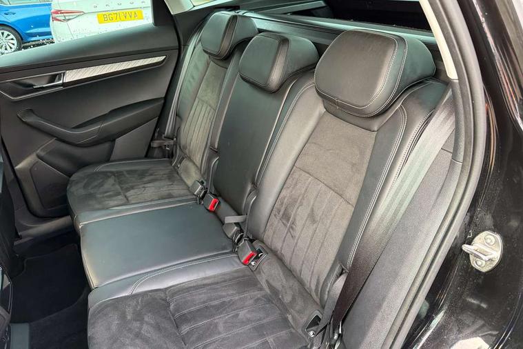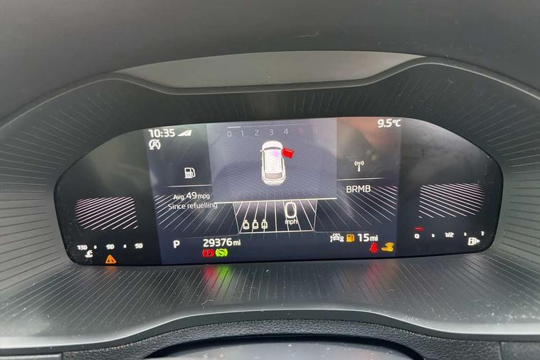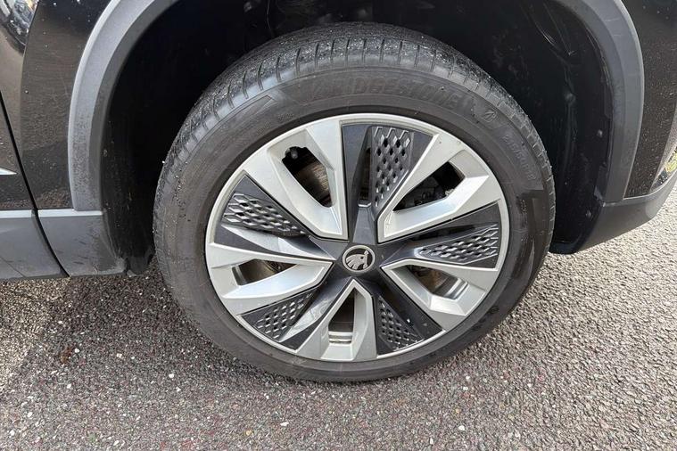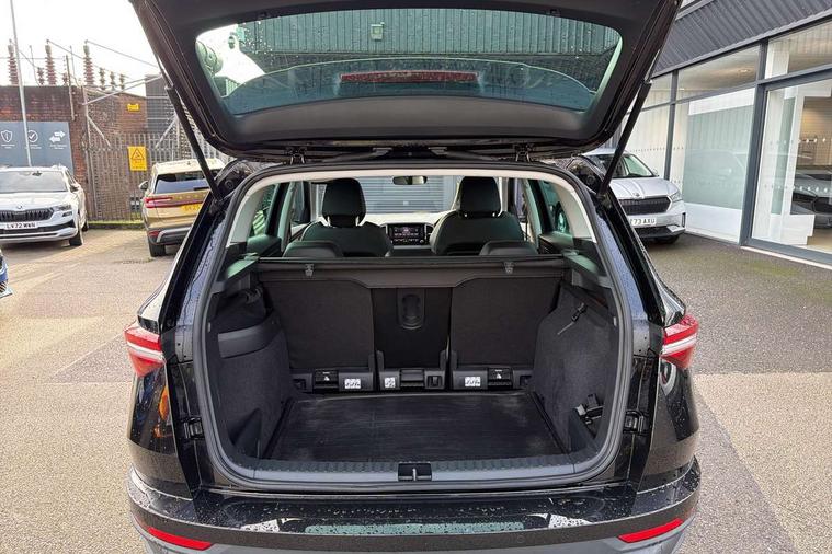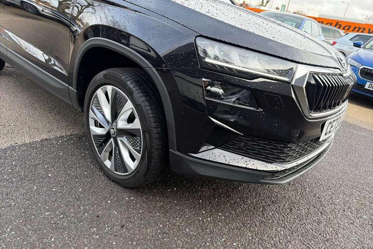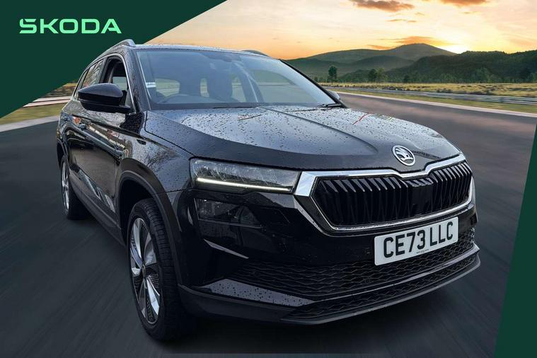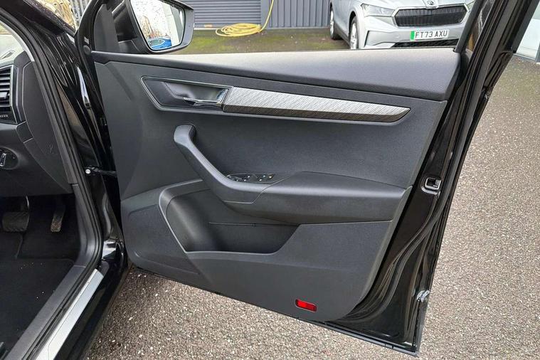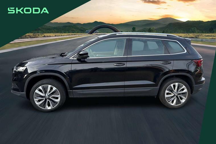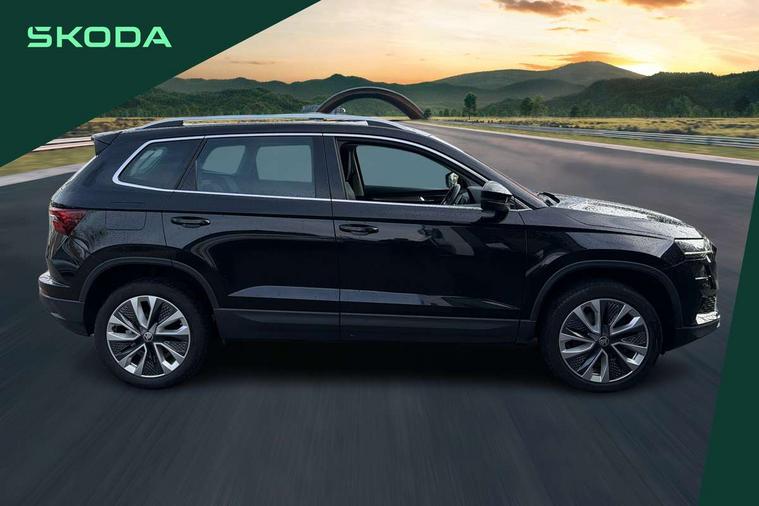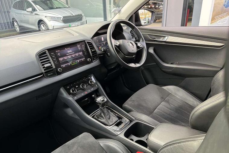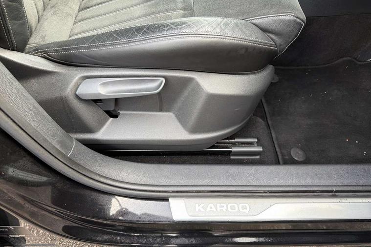 8" Digital display, Care connect, Driver fatigue sensor, Emergency services call system, Outside temperature gauge, Service interval indicator, SmartLink wireless for Apple and wired for Android, Start/stop system with regenerative braking, USB C Port x 2 in front centre console, 8 Speakers, DAB radio with Bluetooth, USB connection, Acoustic glass, Aero front windscreen wipers with intermittent function, Auto dimming rear view mirror with light and rain sensors, Black electric window control buttons, Body colour door mirrors and handles, Dynamic headlight range control with cornering light function, Electric front and rear windows with child proof lock, Heated rear windscreen, LED daytime running lights, LED rear lights with high functionality welcome effect and dynamic indicators, Light assistant (coming/leaving home/tunnel light), Plastic scuff plates, Privacy glass, Rear side wing doors, Rear spoiler, Rear window wiper with washer system and intermittent control, Safety reflectors on front doors, 1.5 litre bottle holders in driver and front passenger door panels, 12V socket in boot, 12v socket in front centre armrest with storage compartment and rear air vents, 2 spoke leather heated multifunction steering wheel with DSG paddles, 2 x Tablet holder, 3 rear height adjustable headrests, 3 seat bench in 2nd row, 4 foldable roof handles with rear coat hooks, Black floor carpet, Chrome inner door handles, Decorative door sills with KAROQ badging, Double sided boot floor, Foldable hooks in the boot, Front head restraints, Height adjustable front three point seats belts with tensioners, Height/reach adjust steering wheel, Ice scraper, Illuminated glovebox, Illuminated luggage compartment, Isofix child seat preparation for front passenger seat, Isofix child seat preparation outer rear, Manual lumbar support for front seats, Pen holder, Pollen filter, Rear boot cover, Rear reading lights, Rubbish bin door, Safety vest holder, Single front passenger seat, Storage box in upper central dashboard closed, Sunvisors with illuminated vanity mirrors, Textile floor mats, Ticket holder, VarioFlex seats with standard rear seat release, Boot pack - Karoq, Chrome roof rails + chrome pack - Karoq, Parking pack - Karoq, Automatic door unlocking in case of crash, Automatic fuel cut off in case of crash, Child locks on rear doors, Driver airbag, Electronic parking brake with auto hold function, Emergency rear braking signal, ESC including ABS, MSR, ASR, EDS, HBA, DSR, RBS, MKB and traction control, Front side airbags, Hill hold control, Knee airbags, Passenger airbag with switch-off function, Pedestrian monitor, Seatbelt reminder signalisation and pretensioner for all seats, Three point seatbelts rear, Two tone horn, Tyre pressure display, Tyre pressure monitor, Alarm with interior monitoring, back up horn and tilt sensor with safe function, Electronic engine immobiliser, Keyless entry and start/stop, Remote central locking with 2 remote folding keys, Chrome framed air vents, 18" Miran alloy wheels in black, Anti-theft wheel bolts protection, Storage on wheel cover, Tool kit,