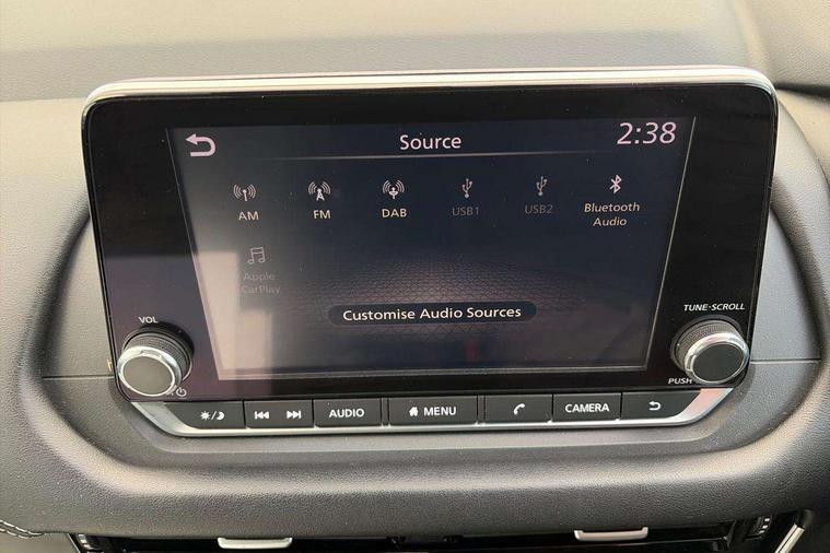 7" High definition full colour TFT screen combimeter, Android auto/Apple CarPlay (Wired), Blind spot warning, Drive modes (sport, normal, eco), Electric speed sensitive power steering, Emergency and breakdown call, Idle stop/start system, Intelligent Cruise control (ICC), Intelligent driver alert system, Intelligent forward collision warning, Intelligent lane intervention, Lane departure prevention, Lane departure warning system, Maximum speed limiter, Nissan connect 8" touchscreen infotainment system, Push button starter, Rear cross traffic alert, Rear parking sensors, Rear view camera, Traffic sign recognition with legal speed adjustment, Trip computer, 6 speakers, AM/FM audio system with DAB, Bluetooth audio streaming, Front USB connections (Type-A and Type-C), Auto dimming rear view mirror, Auto rear wiper when reversing, Automatic hazard signal with emergency stop signal, Body colour mirror caps, Body coloured door handles, Bodyside mouldings, Chrome side window finisher, Door handle with button, Electric auto folding door mirrors, Electrically adjustable and heated door mirrors with LED turn indicator, Follow me home headlights, High beam assist, Intelligent auto headlights, LED daytime running lights, LED Headlights, LED rear lights, One touch front and rear electric windows with remote opening and closing, Partially body coloured bumpers, Rear reversing light (bulb lighting), Rear roof spoiler, Rear side wing doors, Shark fin antenna, Splash free rain sensing wipers, Three blink turn signal, 12v power socket in dashboard and luggage, 2x Rear coat hooks, 3 bench rear seats in 2nd row, 3 rear headrests, 4 folding assist grip, 6-way manually adjustable driver's seat, 60/40 split folding rear seat bench, Centre console storage tray, Chrome interior door handles, Cloth monoform upholstery, Driver and front passenger sunvisors with illuminated vanity mirrors, Driver seat back pocket, Dual zone automatic climate control with pollen filter, Electrically adjustable lumbar support for driver, Front and rear door storage, Front centre console and armrest, Front cupholders x 2, Front door with bottle holders, Glovebox with light, Hard trunk cover, Height adjustable driver's seat, Height adjustable front headrests, Height adjustable passenger seat, Leather steering wheel, Luggage space lighting, Manually adjustable passenger (slide recline + lifter), Multifunction steering wheel, Passenger seat back pocket, Rear armrest with 2 cupholders, Rear door bottle holders, Single front passenger seat, Steering wheel gearshift paddles, Steering wheel switches, Sunglasses holder, Tilt/telescopic adjustable steering wheel, Two rear isofix child seat anchorage points with top tether, 3x3 point rear seatbelt pretensioners + load limiters, ABS with EBD and brake assist, Active brake limited slip, Auto hold function, Child locks on rear doors, Curtain and front side, far side airbags, Driver and passenger airbags, Driver, passenger and 2nd row rear seat belt reminder, Electronic parking brake, Front seatbelt pretensioners + load limiters, Height adjustable front seatbelts, Hill start assist, Intelligent blind spot intervention, Intelligent front emergency braking with pedestrian, cyclist recognition and junction assist, Intelligent rear automatic braking, Tyre pressure monitoring system, Vehicle dynamic control, Capless fuel filler, Engine immobiliser, Intelligent Key, Remote central door locking with deadlocking, Thatcham Cat.1 alarm, Interior instrumental panel A finisher, 17" Alloy wheels, Tyre puncture repair kit,