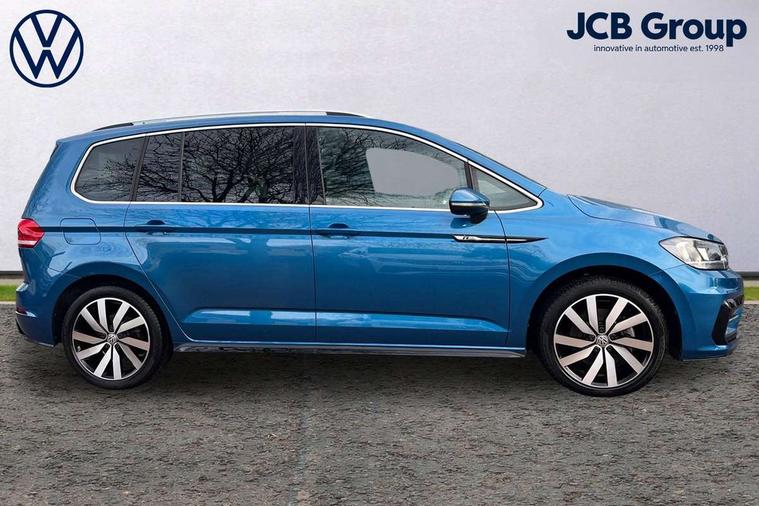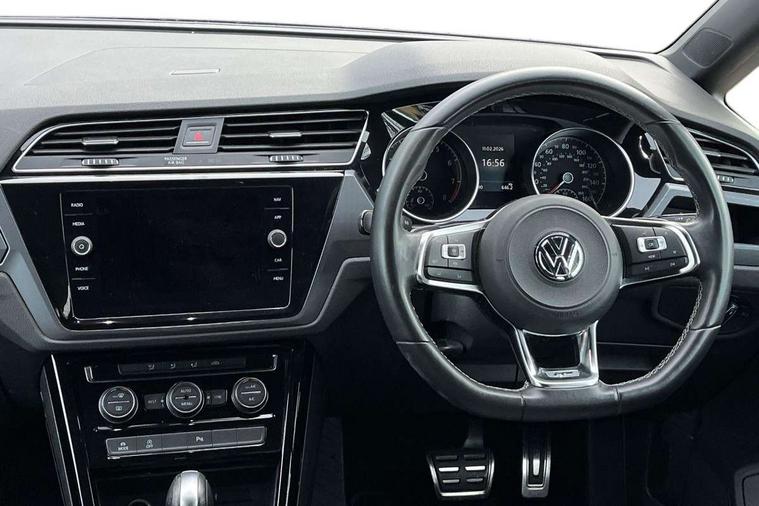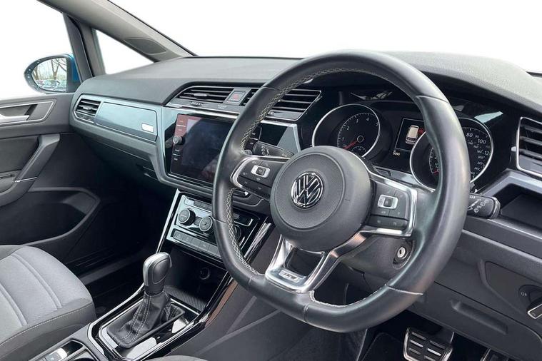 Adaptive cruise control, Audible lights on warning, Bluetooth telephone connectivity, Car information display, Driver alert system, Driver electronic voice amplification function, Electronic odometer, External temperature gauge, Flat tyre indicator, Mobile pairing with SMS function, Multi function computer, Multifunction colour display, Rev counter with fuel gauge, Speed limiter, Speed sensitive power steering, Stop/start system, Think blue trainer driver tips and journey analysis, Trip and service interval display, Petrol Particulate Filter, XDS electronic differential lock, 4x20 watt output, 8 Speakers, Audio Connectivity System, DAB Digital radio, MP3/WMA compatability, Multi device interface, SD card slot, Title and cover art display, USB connection, Aerial integrated into side window, Body colour bumpers, Body colour door handles, Body colour door mirrors with integral indicators, Chrome fog light surround, Chrome lower front bumper insert, Chrome trimmed front air intake surrounds, Chrome trimmed radiator grille louvre inserts, Chrome trimmed side windows, Daytime running lights, Dusk sensor + auto driving lights, Electric folding door mirrors with reverse activated kerb-view adjustment on passenger's door mirror, Front and rear electric windows, Fully galvanised body, Gloss black finish B pillar, Green tinted heat insulating glass, High level third brake light, Range adjustable headlights, Rear tinted glass from B-pillar backwards approx 65% tinted, Rear wash/wipe with intermittent wipe setting, Silver roof rails, Tailgate wiper- reverse gear activation, Twin chrome exhaust tailpipes, Unique R Line badging, Windscreen wipers intermittent wipe, 12V power point for Row 2, 12V socket in luggage compartment, 2 individual fold flat 3rd row seats, 2 three point seatbelts in 3rd row, 2nd row centre armrest, 2nd row centre seat converts into table, 3 single slide/fold/removable 2nd row seats, 3 Zone electronic climate control with automatic air recirculation, 3x3 point seatbelts on 2nd row with height adjust on outer seats, 4 boot load lashing points, 4 way adjustable front head restraints, 4 way driver/front passenger adjustable head restraints, 5 headrests, Aluminium kick plate, Ambient lighting in door trim, Black roof lining, Driver and front passenger under seat drawer, DSG Paddle Shifts, Dust/pollen filters, Foldable front passenger seat backrest, Front + rear carpet mats, Front and rear reading lights, Front centre armrest with storage compartment, Front comfort seats with lumbar support, Front cupholders x 2, Front passenger seat height adjust, Front seat R Line logo with rear seat backrest, Front seat storage pockets, Front seatback folding tables, Front seats with R-Line logo, Grey stitching on steering wheel, Height adjustable driver's seat, Height/reach adjust steering wheel, Illuminated glovebox, Illuminated vanity mirrors, Instrument lighting white adjustable panel illumination with red night time illumination, Interior light with delay, Isofix on 3rd row seats, Large storage compartment in roof console, Leatherette on rear of front seats, Low tunnel 2nd row seat, Luggage compartment lighting, Media box in dashboard on passenger side, Multi storage in passenger/luggage areas, Multi-function centre console with storage facilities, Multifunction leather trimmed steering wheel including leather trimmed gear knob with 3.5" screen with multifunction computer, R-Line door sill protectors, Retractable luggage cover, Split folding rear seat backrests, Stainless steel pedals, Storage bins on all doors, Convenience Pack - Touran, Mirror pack - Touran, R line styling pack - Touran, 3 point height adjustable front seatbelts, Auto hold function, Automatic post collision braking system, Door open warning reflectors, Driver/Front Passenger airbags, Drivers knee airbag, EDL + ASR, Electronic parking brake, Energy recovery system, ESC with ABS, First aid kit, Front and rear (row 2) curtain airbags, Front assist including city emergency braking, Front seat side impact airbags, Front/rear disc brakes, Hill hold control, Hydraulic Brake Assist (HBA), Loose wheel warning function, Passenger airbag deactivation system, Pre crash preventive occupant protection, Seatbelt warning lamp and buzzer, Traction control, Two tone horn, Warning triangle, Alarm with remote central locking and interior protection, Electronic engine immobiliser, Black lead grey decorative inserts dash and door panel, Chrome plated instrument surrounds, Embroidered emblems to headrestraints, 18" Marseille alloy wheels with mobility tyres and anti-theft wheel bolts,