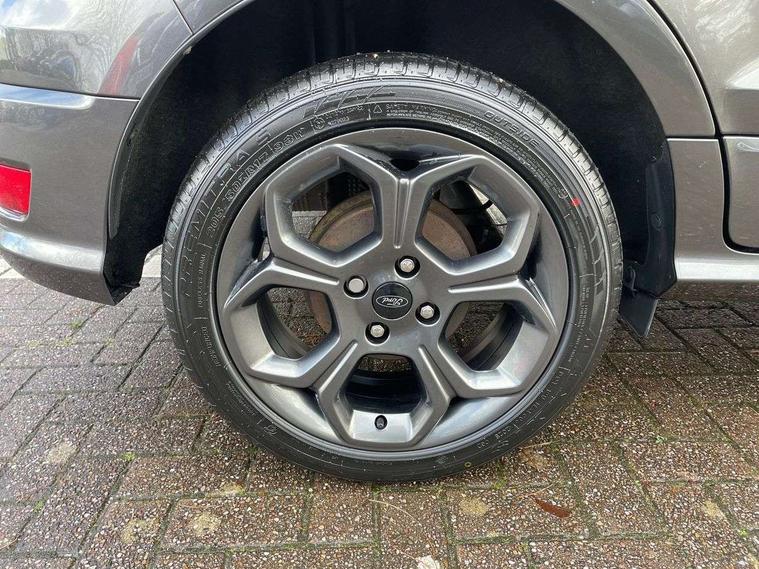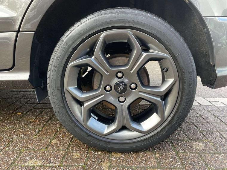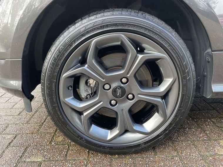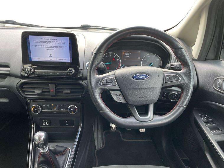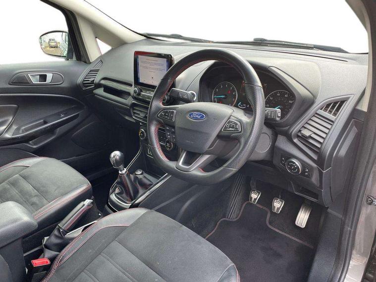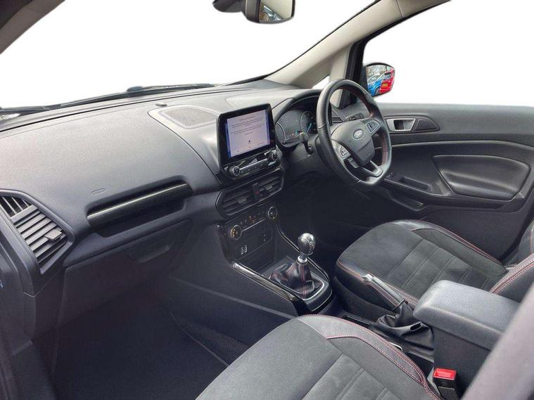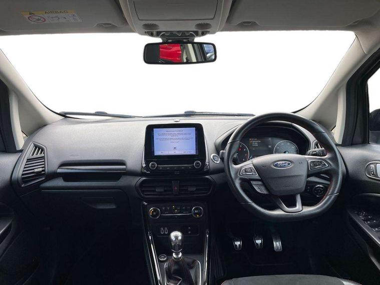 Rear view camera pack - Ecosport, Tyre inflation kit, Immobiliser, MyKey system, Remote central locking, Thatcham 1 volume sensing alarm, Steering wheel mounted audio controls, 3x3 point rear seatbelts, ABS, Child locks on rear doors, Curtain airbags, Driver airbag, Drivers knee airbag, Electronic Stability Programme with hill launch assist, Emergency brake assist, Front passenger airbag deactivation, Front side airbags, Passenger airbag, Seatbelt reminder for driver and front passenger, Traction control, Tyre pressure monitoring system, 'Quickclear' heated windscreen/heated washer jets, Auto dimming rear view mirror, Automatic headlights, Black roof rails, Body colour door handles, Body coloured bumpers, Electrically adjustable and heated door mirrors, Front door threshold plates with ST-Line logo, Front fog lights, Headlight levelling control, Large rear spoiler, Power foldable door mirrors with puddle lights, Power front and rear windows with global opening/closing, Rain sensing front wipers, Rear wiper, ST-Line body styling kit, ST-Line front grille, 12V socket in front and rear, 60/40 split rear seats, 7 shade adjustable ambient lighting, Centre console with sliding front armrest, Cooled glovebox, Courtesy lights with map reading light, Driver seat height/lumbar adjust, Driver's side glovebox, Driver/passenger sunvisors and lidded vanity mirrors, EATC - Electronic Auto Temperature control, Folding grab handles, Front head restraints, Front seat back map pockets, Front/rear floor mats, Illuminated glovebox, Illuminated luggage compartment, Isofix system on outer rear seats, Leather steering wheel/gearshift/handbrake lever with red stitching, Luggage compartment carpet, Overhead console with sunglasses holder, Partial leather upholstery, Rake adjustable rear seats, Reach + rake adjustable steering column, Rear headrests, Stainless steel sports pedals, Steering wheel with chrome inserts, Storage drawers under front seats, Tie down hooks, Variable boot floor, Cruise control, Easy fuel capless refuelling system, PAS, SYNC 3 nav system with DAB radio, 8" screen, voice control, emergency assistance, Apple car play/Android auto, 2x USB, Ford pass connect, Trip computer, Sports suspension,