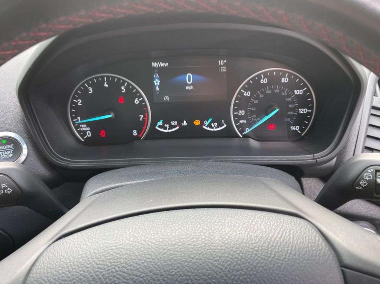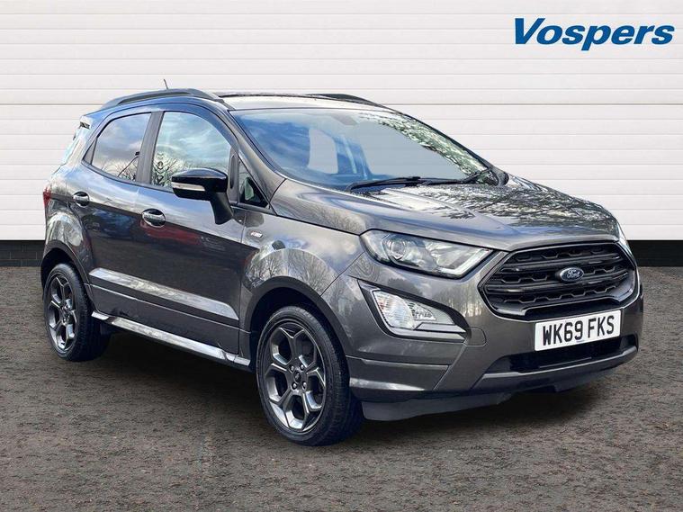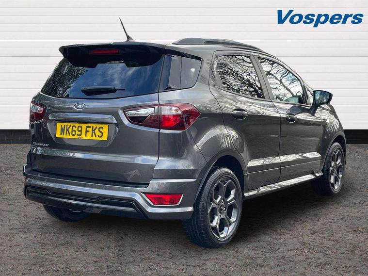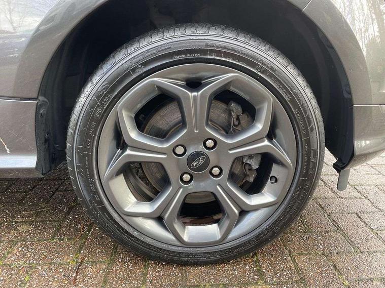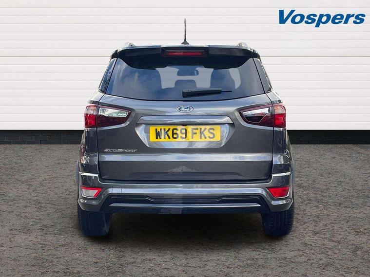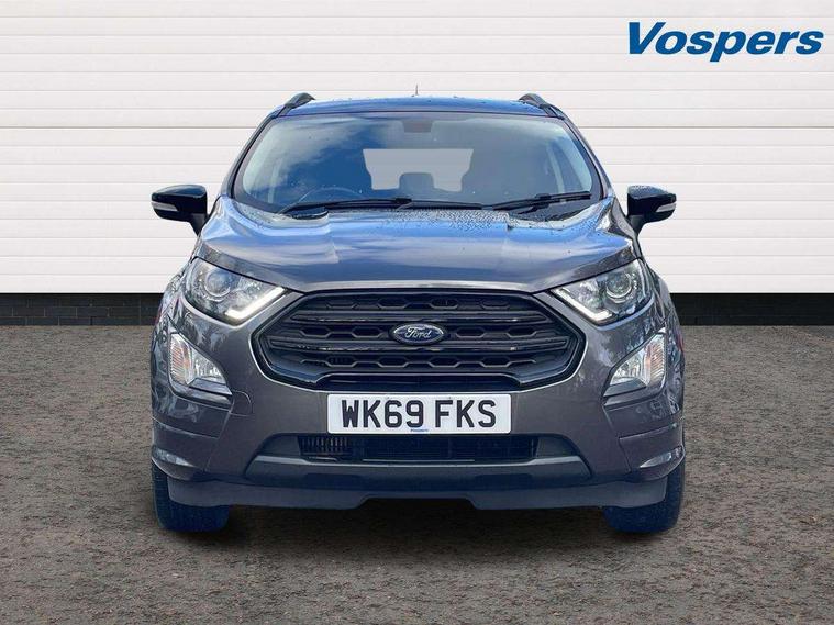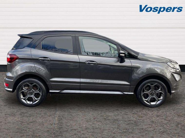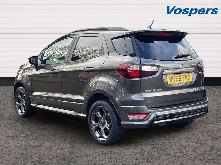 Rear view camera pack - Ecosport, Tyre inflation kit, Immobiliser, MyKey system, Remote central locking, Thatcham 1 volume sensing alarm, Steering wheel mounted audio controls, 3x3 point rear seatbelts, ABS, Child locks on rear doors, Curtain airbags, Driver airbag, Drivers knee airbag, Electronic Stability Programme with hill launch assist, Emergency brake assist, Front passenger airbag deactivation, Front side airbags, Passenger airbag, Seatbelt reminder for driver and front passenger, Traction control, Tyre pressure monitoring system, 'Quickclear' heated windscreen/heated washer jets, Auto dimming rear view mirror, Automatic headlights, Black roof rails, Body colour door handles, Body coloured bumpers, Electrically adjustable and heated door mirrors, Front door threshold plates with ST-Line logo, Front fog lights, Headlight levelling control, Large rear spoiler, Power foldable door mirrors with puddle lights, Power front and rear windows with global opening/closing, Rain sensing front wipers, Rear wiper, ST-Line body styling kit, ST-Line front grille, 12V socket in front and rear, 60/40 split rear seats, 7 shade adjustable ambient lighting, Centre console with sliding front armrest, Cooled glovebox, Courtesy lights with map reading light, Driver seat height/lumbar adjust, Driver's side glovebox, Driver/passenger sunvisors and lidded vanity mirrors, EATC - Electronic Auto Temperature control, Folding grab handles, Front head restraints, Front seat back map pockets, Front/rear floor mats, Illuminated glovebox, Illuminated luggage compartment, Isofix system on outer rear seats, Leather steering wheel/gearshift/handbrake lever with red stitching, Luggage compartment carpet, Overhead console with sunglasses holder, Partial leather upholstery, Rake adjustable rear seats, Reach + rake adjustable steering column, Rear headrests, Stainless steel sports pedals, Steering wheel with chrome inserts, Storage drawers under front seats, Tie down hooks, Variable boot floor, Cruise control, Easy fuel capless refuelling system, PAS, SYNC 3 nav system with DAB radio, 8" screen, voice control, emergency assistance, Apple car play/Android auto, 2x USB, Ford pass connect, Trip computer, Sports suspension,