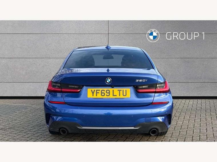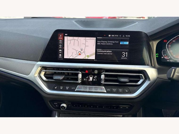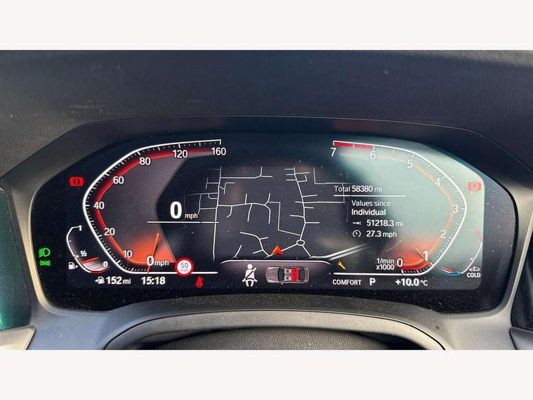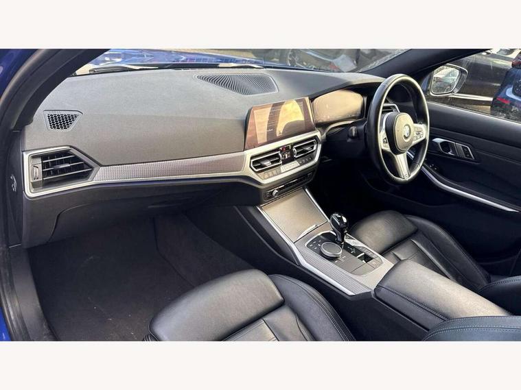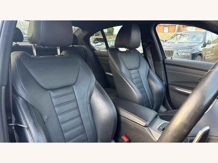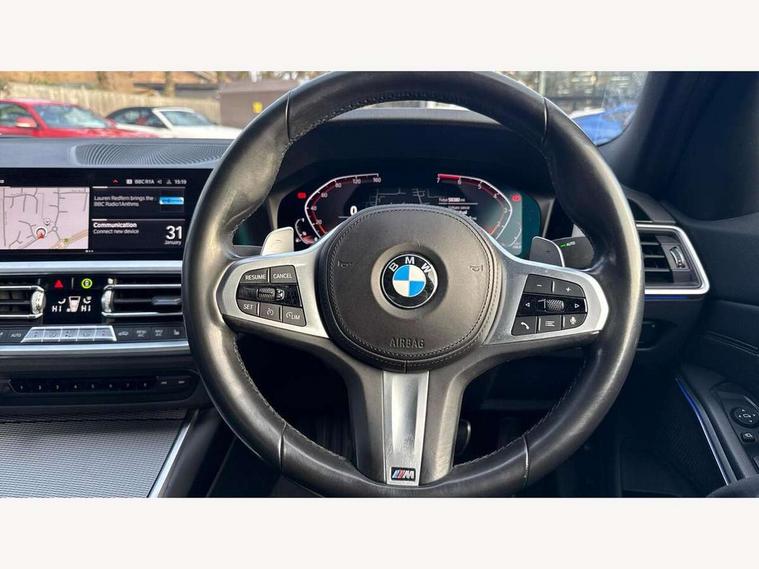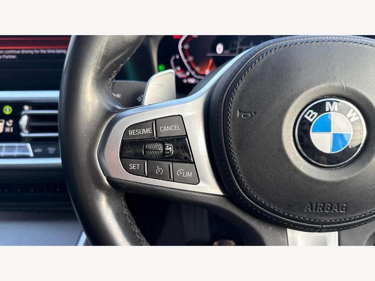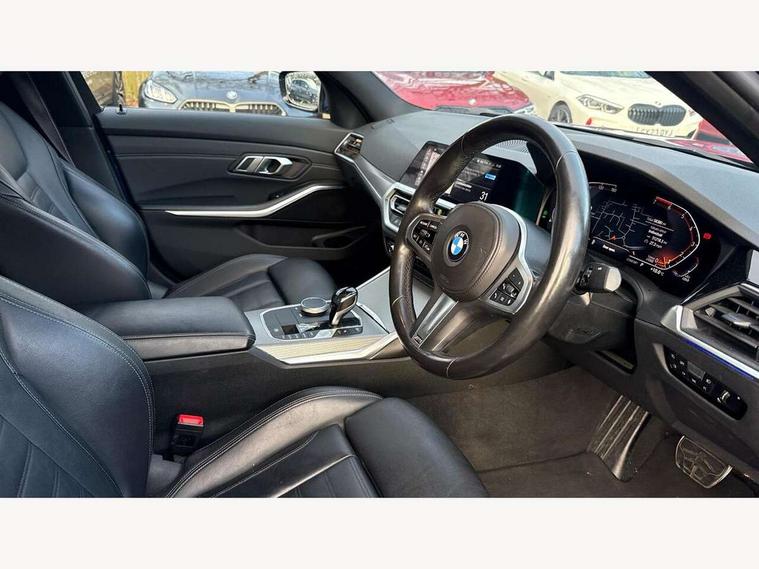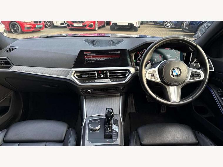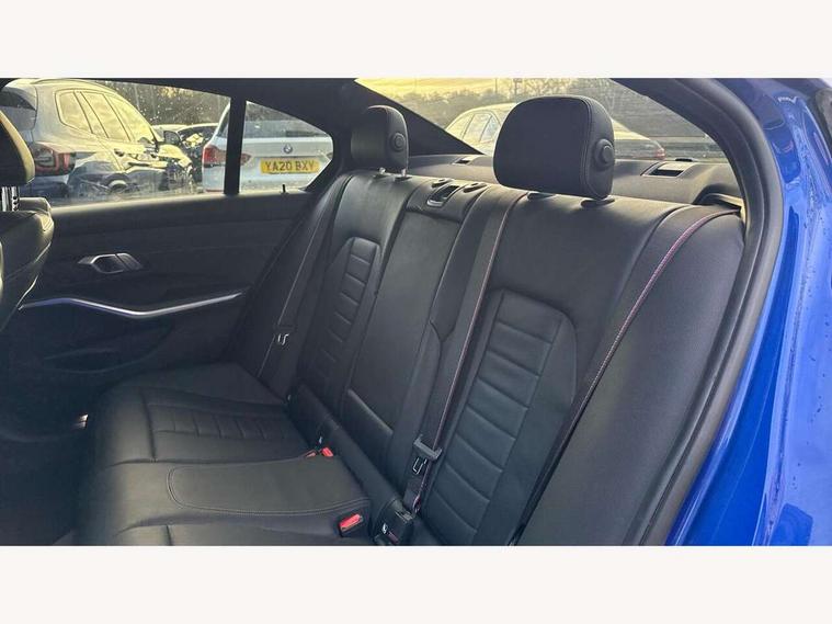 Active guard plus, Attentiveness assist, Auto start-stop, BMW ConnectedDrive online services, BMW iDrive controller on centre console, BMW Live Cockpit Professional sat nav system including 10.25" high resolution display and Intelligent Voice Assistant, BMW service history, BMW Teleservices, Brake pad wear indicator in front and rear, Check Control warning system for monitoring of lights and door/luggage compartment open warning, Condition based service, Electric power steering with Servotronic steering optimised at all speed ranges, Instrument cluster with speedometer with mph readout, tachometer, fuel gauge and oil temperature gauge, Integrated owners handbook, Oil sensor for level and grade, warning by check control system, On board computer - average speed+fuel consumption, service interval, clock/date, odometer/trip meter, outside temperature display and ice warning, Optimum shift indicator, Personal Profile - automatic lock when driving away selectable, Variable sport steering, Balanced 50/50 weight distribution, Battery cut-out switch, Drive performance control - ECO PRO, comfort and sport modes, Electronic differential lock control (EDLC), Larger capacity fuel tank, M sport suspension, Petrol Particulate Filter, Sport automatic transmission with steering-wheel mounted gearshift paddles and launch control, Stroke dependent dampers, DAB tuner, Electronic service booklet, Acoustic glazing, Active airstream chrome frame kidney grille with 8 high gloss black vertical slats, Automatic headlight beam throw control with load dependent regulating reaction, dynamic compensation of braking dive and acceleration squat, Black roof mouldings, Body colour - fuel filler flap, front and rear bumpers, door handles and mirror caps with integrated turn indicator + bottom segment in matt black, Dynamic brake lights, Electric windows - front and rear, with open/close fingertip control, anti-trap facility and comfort closing, Exhaust tailpipe - split left and right, Extended LED headlights, Exterior mirrors - electrically folding with anti-dazzle, Fading support, Front and rear bumper system with replaceable deformation elements, Front black door sill finishers with BMW designation, Green tinted heat protection glazing, High gloss shadow line exterior trim, Interior rear view electrochromatic mirror with automatic anti dazzle function, LED front fog lights, Lightweight engineering, M designation on front side panels, left and right, Matt black exterior B pillar, Model designation on right side of tailgate, Rain sensor with automatic headlight activation, Rear wiper, Shark fin antenna, Two part LED tailights in L-shape with components in smoked glass, brake light, LED turn indicator and rear fog light, Visible VIN plate, Welcome lights in interior and door handle area, Windscreen wipers with integrated washing jets, 12V power socket in front storage compartment, 2 front cupholder in centre console with clamping elements and matt black inlay, 3 rear seats with non folding headrests with 3 point seat belts, 3 zone automatic air conditioning, 4 pieces lashing eyelets in luggage compartment, 40:20:40 split folding rear seat with loading system, Ambient lighting with welcome carpet light, Anthracite headlining, Armrest integrated in front and rear door trim + front centre console armrest, Centred top Luggage compartment lights, Four grab handles integrated in roof lining, Front and rear door exit lighting (left / right), Front and rear door pockets, Front and rear reading lights, Front and rear velour floor mats, Front head restraints, Front sport seats, Heated driver and front passenger seats, Height adjustable mechanically and infinitely variable steering column, Illuminated armrest storage compartment, Illuminated glove compartment with separate small compartment, Interior lighting - front centre over interior mirror with soft light, rear centre and front and rear footwell lighting, M Sport multifunction leather steering wheel, Make-up mirror lights, Rear centre armrest with 2 cupholders, Rear centre console with storage compartment and ventilation grille, Sunvisors with vanity mirrors and ticket pocket, Toolkit located in luggage compartment, Connected pack professional - 3 Series Saloon/Touring, M Aerodynamics pack - 3 Series Saloon/Touring, 2 tone horn, BMW emergency call, Brake energy regeneration, Braking pre-tensioning, Child proof locking system in rear door, Child seat ISOFIX attachment rear outer seats, Coasting in idle in ECO PRO mode, Crash sensor activating of airbags, Unlocking doors, hazard warning lights, interior light, safety battery terminal, Driver and front passenger side airbags, integrated in the door side seat backrest bolsters for all seat variants, Driver/Front Passenger airbags, Dry braking, Dynamic brake control, Dynamic stability control + (DSC+) - Anti-lock Braking System (ABS) with brake assist and cornering brake control + Automatic Stability Control (ASC), Dynamic Traction Control - DTC, Electric parking brake including automatic hold function and automatic release of the parking brake when driving off, Front passenger manual airbag deactivation, Head airbags for all 4 outer seats, Hill start assist, Seat belt security check for driver and front passenger, Side impact protection, Three 3 point seat belts on all seats including front belt stopper, pyrotechnic belt tensioners and belt force limiters, Tyre pressure monitoring with three level warning strategy, Ventilated front and rear disc brakes, Warning triangle and first aid kit, Alarm system (Thatcham 1) with remote control and electronic engine immobiliser, Central locking switch for all doors, fuel filler cap and luggage compartment, Remote control with integrated key one button open/close vehicle and windows, sole opening of the luggage compartment lid and panic mode, Start/stop button with Comfort Go keyless engine start and auto Start/stop deactivation button, Vehicle key with M specific designation, Reduced rolling 