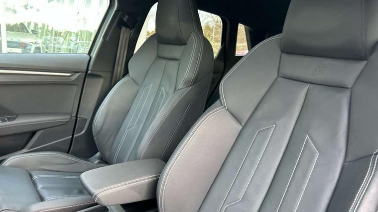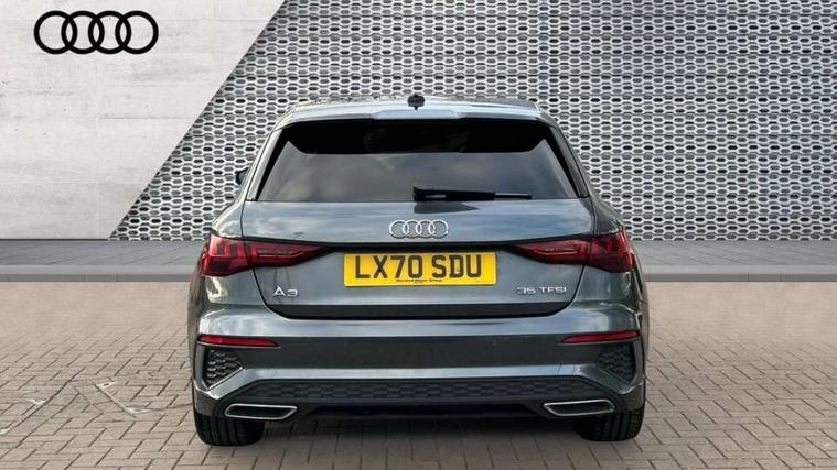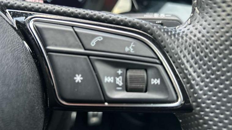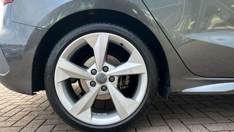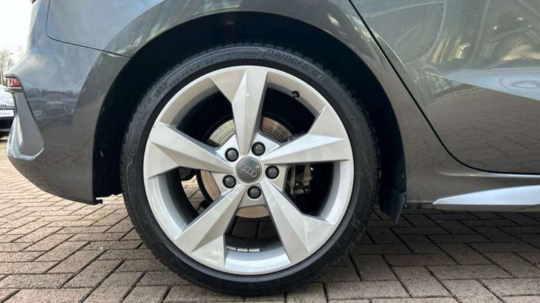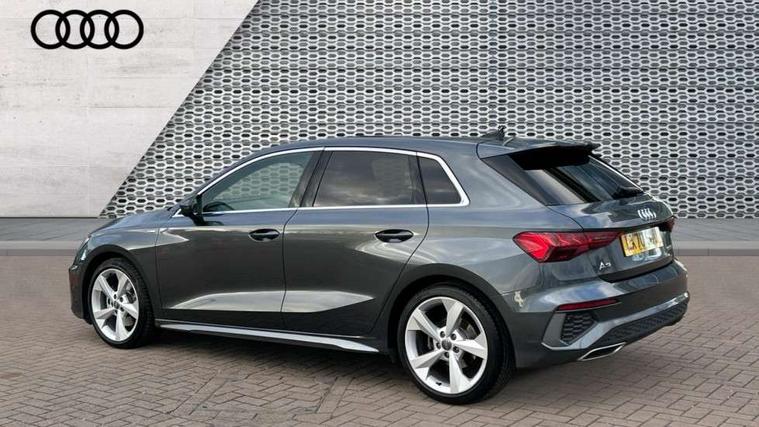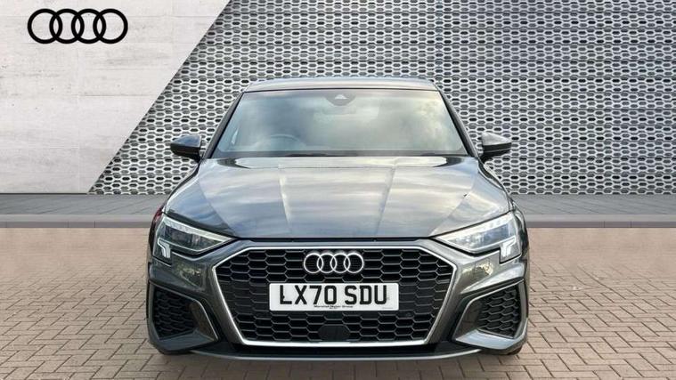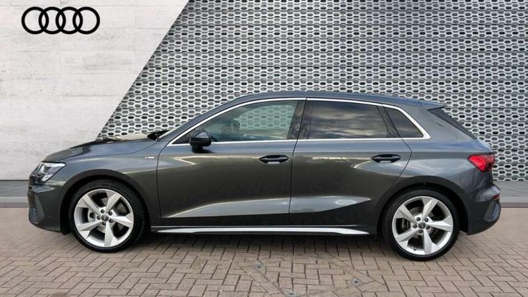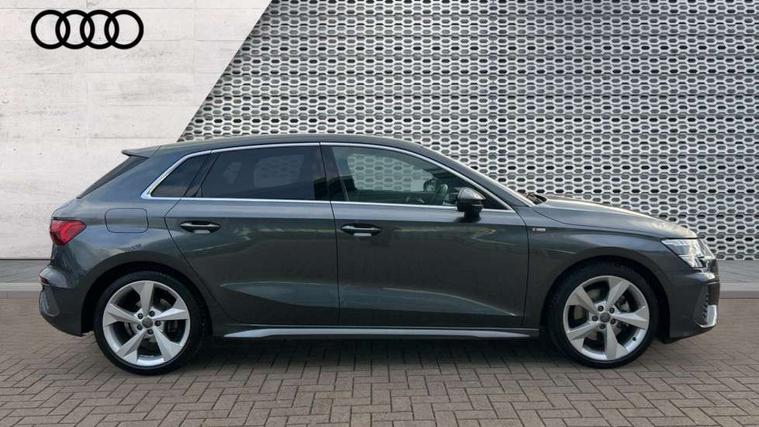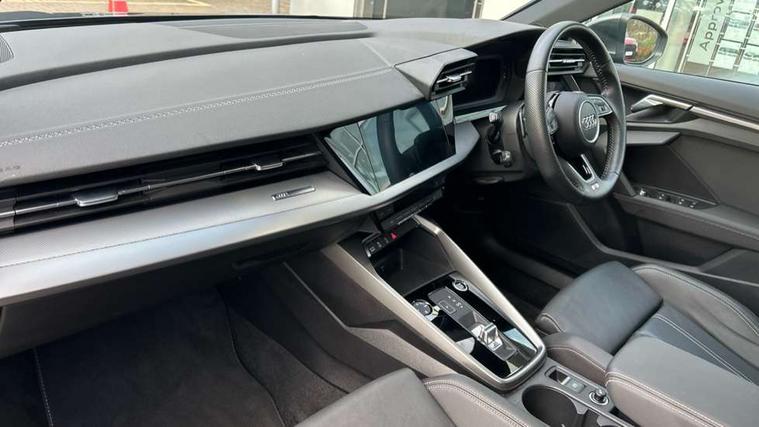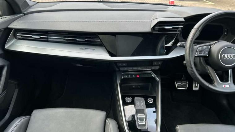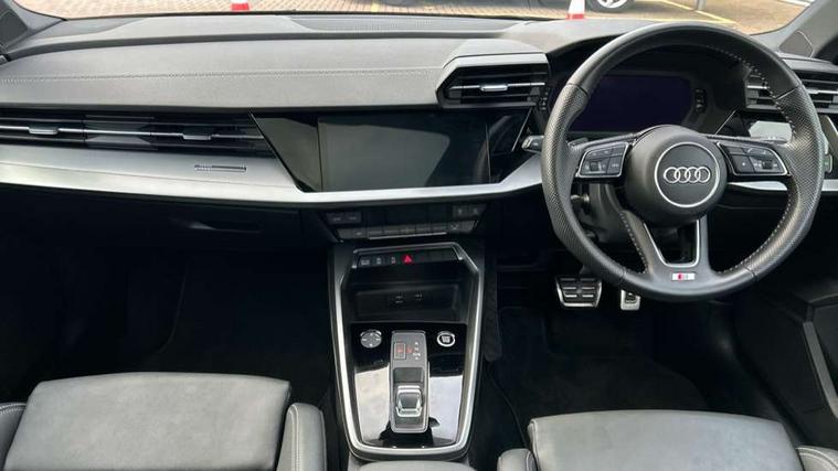 Audi connect emergency call and service, Audi drive select (Auto, Comfort, Dynamic, Efficiency and Individual), Audi smartphone interface, Audi Virtual Cockpit - 10.25" digital and colour instrument cluster, Automatic start/stop system with recuperation, Bluetooth interface, Collision avoidance assistant, Electromechanical power speed sensitive steering, Lane departure warning system, MMI Navigation Plus with high resolution 10.1" colour touch screen display, Service indicator, Trip computer, Voice control system with natural language interaction, 1xUSB-A and 1xUSB-C connection, 6 passive loudspeakers, DAB Digital radio, Acoustic glass windscreen, Aluminium window trim, Auto dimming frameless rear view mirror, Body colour exterior mirrors, Electrically adjustable/heated/folding/auto dimming door mirrors with integrated LED indications + kerb view function for passenger side, Front electric windows, Illuminated aluminium inserts front door sills with S logo, LED daytime running lights, Light and rain sensors, Privacy glass - dark tinted rear window, rear door and side windows, Rear electric windows, Rear side air outlets in grained matt black, Rear wiper, S line bumpers, S roof spoiler, 12V socket and storage compartment in front centre console, 40/20/40 split folding rear seat bench with cupholder, Black cloth headlining, Dual zone electronic climate control, Front and rear centre armrest in leather, Front and rear headrests, Front/rear floor mats, Height and reach adjustable steering wheel, Interior lighting - glove compartment light and right hand side, Luggage compartment floor covering, Manual boot compartment lid, Manually adjustable front seats, Seat side bolsters, Stainless steel pedals and front footrest, Twin leather upholstery with front sports seats S embossed logo, Aluminium interior elements pack - A3 Sportback, S line styling pack - A3 Sportback, 3x3 point rear seat belts, Driver and front passenger airbag with passenger airbag deactivation, Electronic Stabilisation Control (ESC) including ABS, ASR and EDL, First aid kit with warning triangle and 2 safety vests, Hill hold assist, Pre-sense front with pedestrian and cyclist detection, Seatbelt monitoring, Tyre pressure loss indicator, Anti theft alarm, Anti-theft wheel bolts, Electronically operated child lock, Immobiliser, Remote control central locking, Accent surfaces in the dashboard and centre console in platinum grey silk effect paint finish, Dark spectrum aluminium inlays,