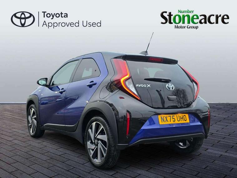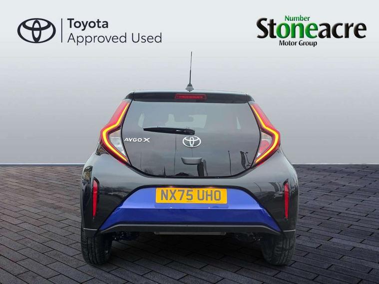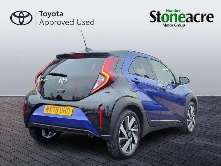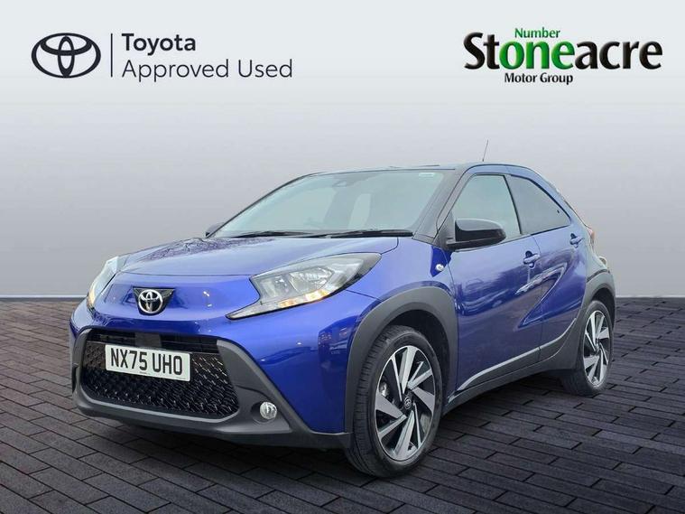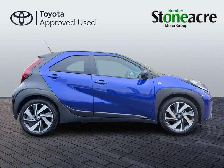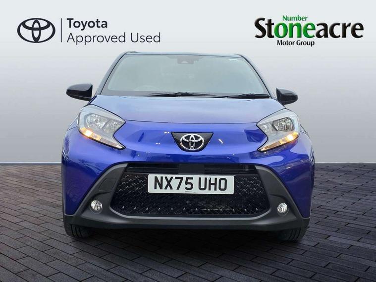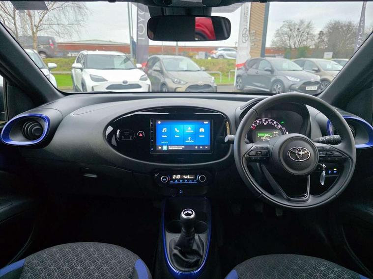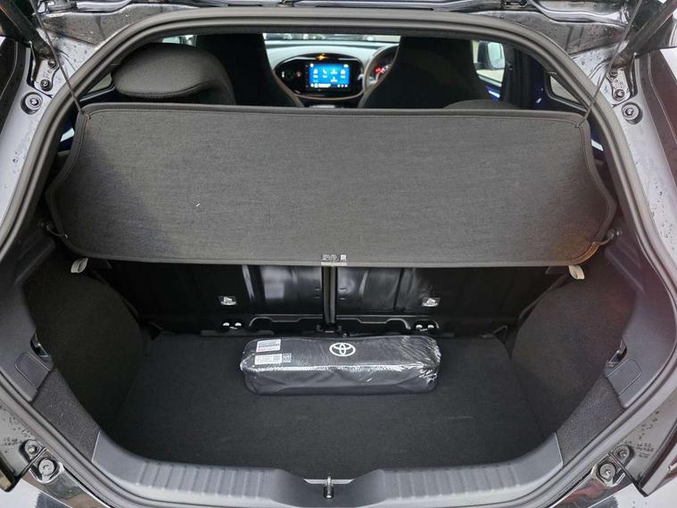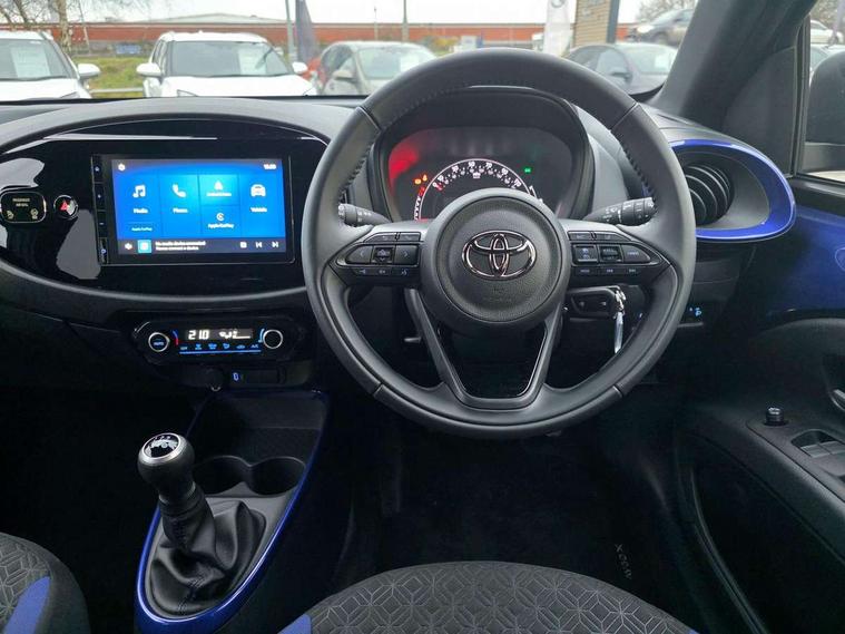 4.2" TFT colour screen, Adjustable speed limiter, Analogue speedometer, Bluetooth connectivity, Digital tachograph, Driver attention alert system, eCall emergency call system, Electric power steering, Intersection turn assist, Key reminder warning, Noise reduction kit, Pre collision system with emergency steering assist, Reversing camera with static guide lines, Smart phone integration with Apple car play/Android Auto, Speed limit display, Start and stop, Vehicle Stability Control (VSC), 4 speakers, 9" HD multimedia display touch screen with Toyota smart connect, DAB digital audio broadcast, USB connector, Auto headlights, Auto wipers, Automatic headlights cut-off, Bicycle towing hook, Black contrast roof, Black side protection mouldings, Black wheel arch mouldings, Body colour door handles, Body coloured front bumper, Boot door scuff plate, Eclipse black rear bumper, Electric heated door mirrors, Follow me home headlights, Front fog lights, Front power windows, Gloss black door mirrors, Gloss black upper front grille, Headlight cut-off reminder, LED daytime running lights, LED front light guide, LED High mounted stop lamp, Manual day/night rear view mirror, Manual headlight levelling, Pagoda roof, Power adjustable door mirrors, Power back door, Privacy glass, Projector halogen headlights, Rain sensor, Rear combination lights LED bulb type, Rear side wing doors, Rear windscreen defogger, Rear windscreen wiper, Short antenna, Variable intermittent windscreen wipers, 12v power outlet - front, 2 seat bench in 2nd row, 3 spoke leather steering wheel, 50/50 split folding rear seat, Adhesive roof headlining, Adjustable speed limiter switch on steering wheel, Audio and telephone switches on steering wheel, Auto air conditioning, Black insert on steering wheel, Black roof lining, Boot light, Centre room light, Chrome interior door handles, Chrome surround on air conditioning buttons, Clean air filter, Console box storage in body color, Fabric upholstery, Floor mats, Front and rear cup holders, Front head rest deco art, Front head restraints, Height adjustable driver seat, Intelligent adaptive cruise control switch on steering wheel, ISOFIX child restraint system on rear seats, Lane departure alert switch on steering wheel, Leather gearshift knob, Manual tilt steering wheel, Manually reclining and sliding driver seat, Manually reclining and sliding front passenger seat, Multimedia switches on steering wheel, Pollen filter, Rear door pockets, Rear head restraints, Satin silver insert on gear shift knob, Single compartment glovebox with lights, Single front passenger seat, Soft tonneau cover, Sun visors with mirror on driver and passenger side, Voice recognition switch on steering wheel, Toyota safety sense pack - Aygo X, Anti lock braking system + Electronic brake force distribution, Child safety door lock, Emergency brake light signal (EBS), Hill start assist control (HAC), Passenger airbag on/off switch, Seat belt reminder for front and rear seats, Supplement restraints system (SRS) - 6 airbags, Traction control, Tyre pressure warning system, Immobiliser, Remote power door locks, Black wheel centre caps, Tyre repair kit,