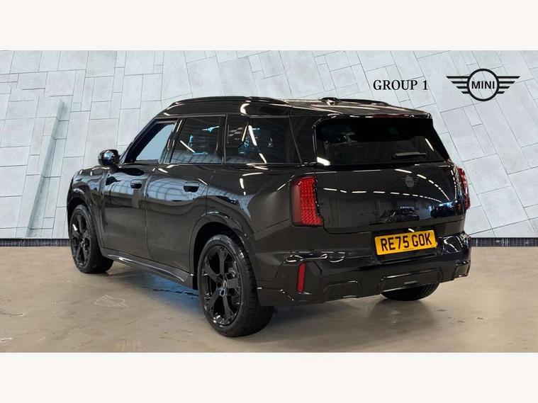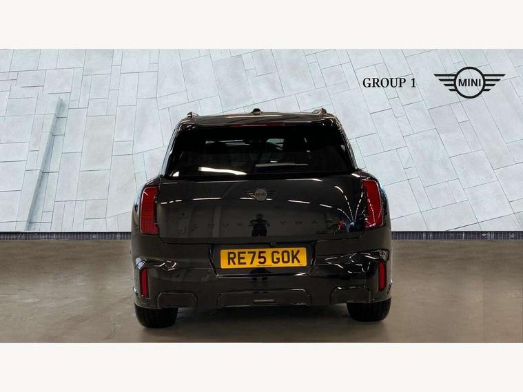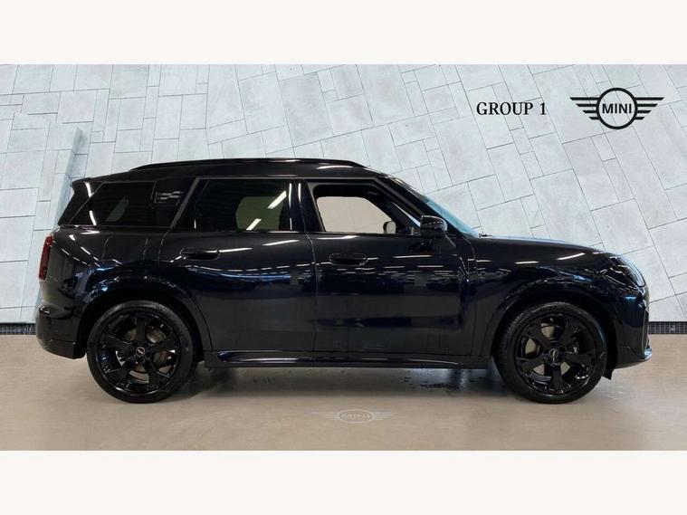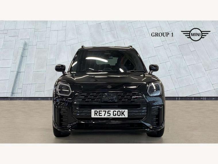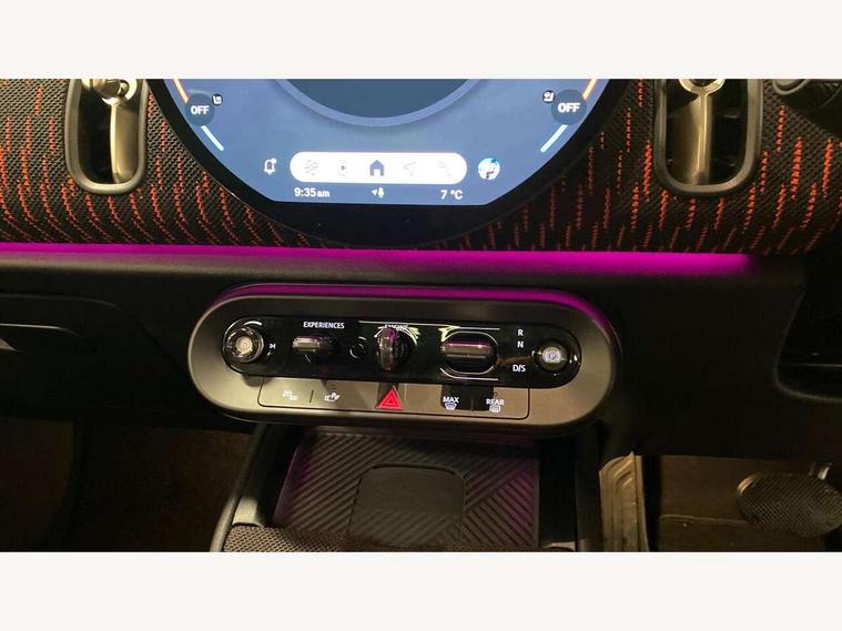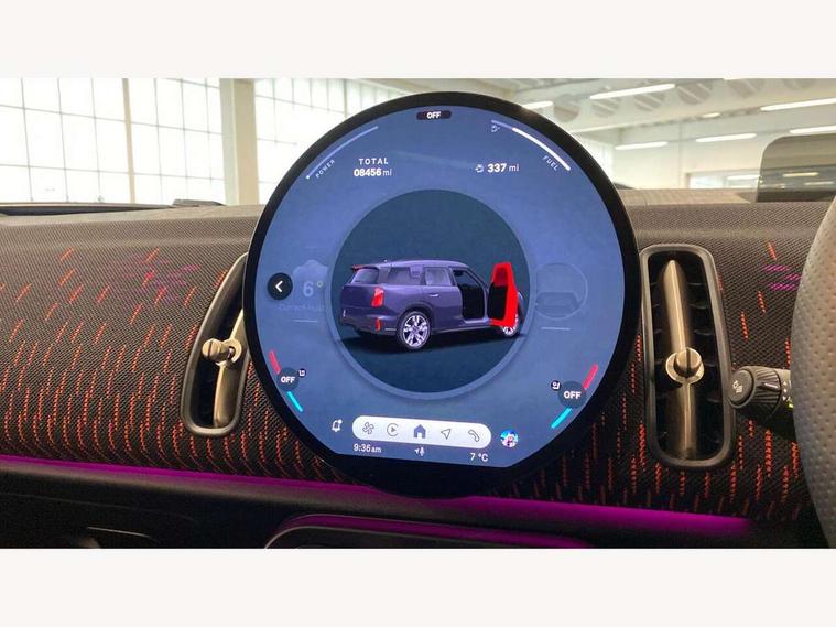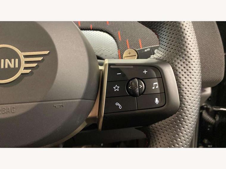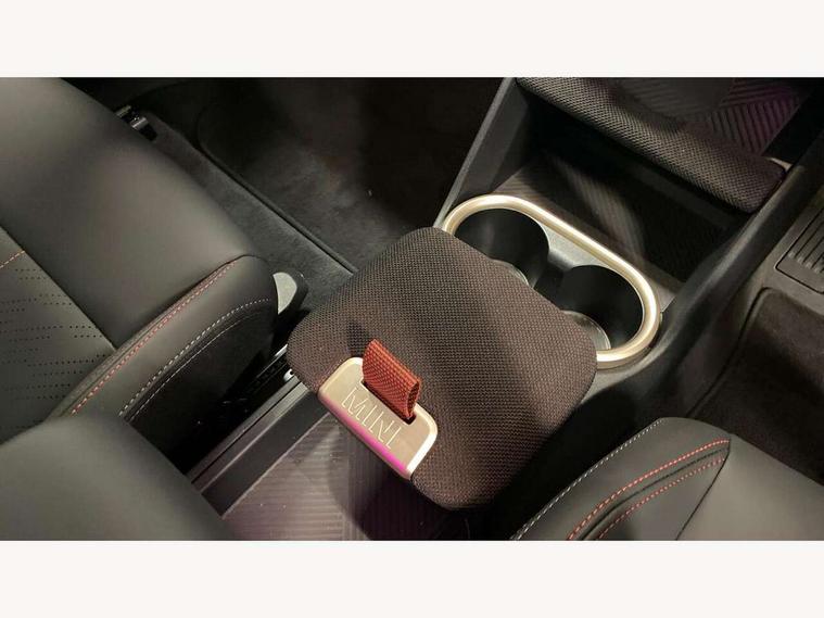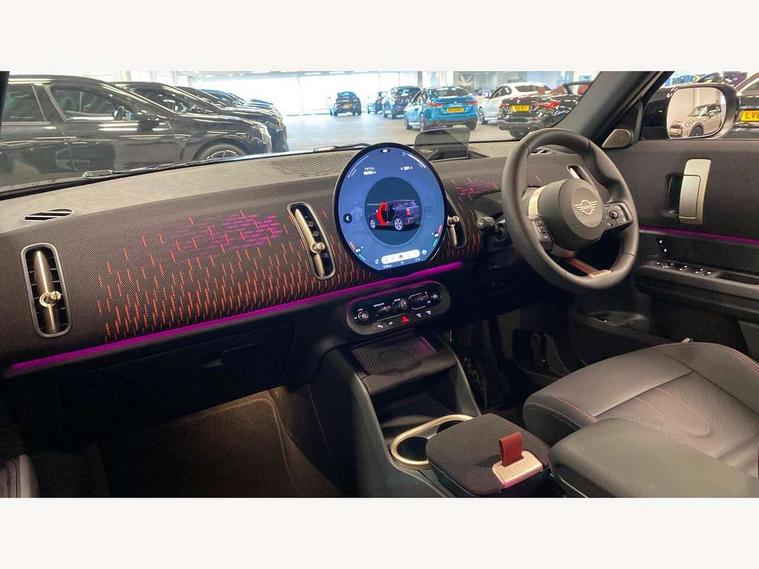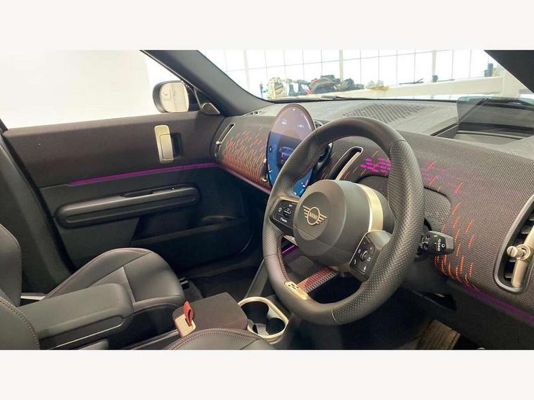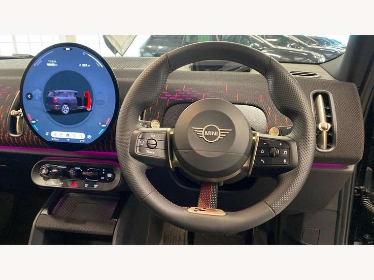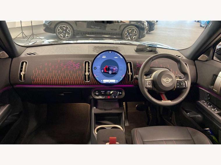 Bluetooth connection, Circular OLED Screen, Compatible mobile phone bluetooth with audio streaming, Cruise Control (DCC), Digital dashboard display, Driving assistant, Driving Assistant Plus Preparation, E-call, Electro-mechanical speed dependant steering assistance, MINI Experience Modes, MINI Head up display, Mini navigation system, MINI TeleServices, Parking assistant in camera and ultrasound based assistance system, rear view camera, parking aid and distance control, Adaptive suspension, Double clutch sports transmission, Larger capacity fuel tank, 6 speakers, DAB Digital radio, Personal eSim, Auto tailgate, Electric adjustable heated door mirrors, Front and rear apron, Front and rear electric windows, Heated rear window, High beam assistant, High gloss hexagonal patterned grille surround, Interior rear-view mirror with automatic anti-dazzle function, LED daytime running lights, LED headlights with extended contents including Adaptable light signatures, LED rear lights, LED third brake light, Rain sensor with auto headlights, Rear roof spoiler with airblades, Rear side wing doors, Rear window wiper, Roof rails, 3 Seat sliding rear bench in 2nd row, Anthracite headliner, Auto air conditioning, Driver and front passenger seat heating, Floor mats, Front armrest, Front headrests, Heated steering wheel, Height and length steering column adjustment, JCW Front sports seats, Lidded storage box in Black/Red knit, Luggage compartment separating net, Perforated Vescin steering wheel, Rear headrests, Seat adjustment for rear seats, Single front passenger seat, Sunvisors with vanity mirrors, Vescin/Cloth upholstery, Wireless charging tray, Interior and exterior mirror package - Mini Countryman, 3x3 point rear seat belts, 6 Airbags - front, side, head and seat belt tensioners, ABS, Brake calipers in Black with JCW badge, DSC - Dynamic Stability Control, Electronic handbrake, Electronic Stability Programme (ESP), Front ISOFIX (iSize), Hill descent control, Hill hold assist, Hill start assist, JCW Sport Brakes, Manual rear child locks, Traction control, Tyre pressure monitoring system, Warning triangle, Alarm system with tilt sensor, monitoring doors, bonnet interior and tailgate, Auto drive away locking, Comfort access system, Deadlocking function, Electronic vehicle immobiliser, Locking wheel bolts, Remote control locking, Start/stop toggle with keyless go, JCW Black/Red dashboard knit, MINI Mobility Kit,