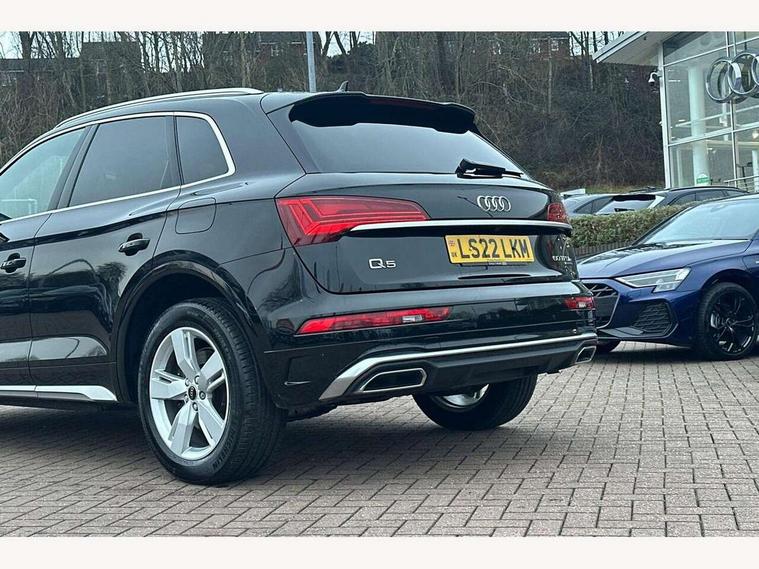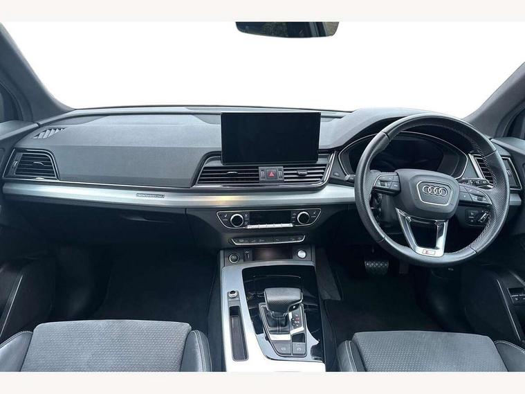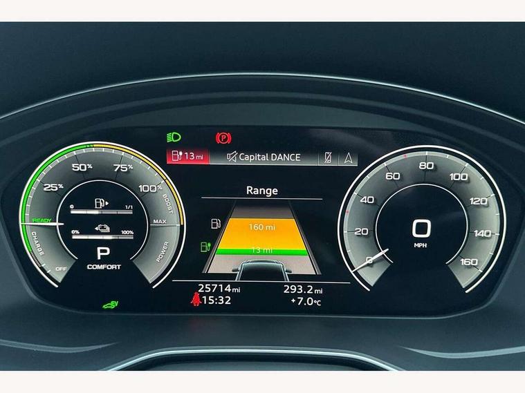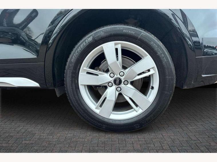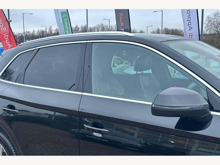 Audi connect safety and service (e-call), Audi connect with Amazon Alexa Integration, Audi drive select, Audi virtual cockpit plus with 12.3" screen and three different layout designs, Audi wireless smartphone interface, Automatic start-stop system with coasting functionality and efficiency programme, Bluetooth interface, Electro - mechanical power assisted steering, MMI navigation plus with 10.1" touch screen, Power tailgate, Reversing camera, Service interval indicator, Voice control system with Audi hotword activation "Hey Audi", 3 pin 10 amp domestic charging cable, 7.4 kW onboard charger, Dynamic suspension, Quattro on demand, Type 2 mode 3 22kW 32 amp charging cable, Type 2 socket for AC charging, 2 x USB charging port with aux input socket, DAB Digital radio, 3rd brake light, Acoustic windscreen, Aluminium roof rails, Audi matrix LED headlights with dynamic front and rear indicators, Auto dimming rear view mirror, Automatic headlights and windscreen wipers, Body colour bumpers, Body colour door mirrors, Body colour rear diffuser with matt aluminium silver surrounds, Body colour underbody protection, Chrome plated exhaust trims, Daytime running lights, Door sills in Selenite silver, Electric adjustable/heated/folding door mirrors, Front air inlet surrounds in aluminium, Front and rear electric windows, Front radiator grille in honeycomb design, Headlight washers, Lower bumpers painted in contrast Manhattan grey, Rear chrome trim strip below lights, Rear privacy glass and rear side windows, Rear side wing doors, Rear spoiler, Rear wiper, Roof bars, S Line badges on the front wings, S Line front and rear bumpers, S Line side skirts, 3 rear headrests, 40:20:40 split folding 3 rear bench seat in 2nd row with rear centre armrest, Black cloth headlining, Comfort front centre armrest, Contrast stitching on seats, steering wheel and gear lever gaiter, Deluxe 3 zone electronic climate control, Front/rear floor mats, Gear lever in black leather, Heated front seats, Height adjustable front head restraints, Height/reach adjustable steering column, Illuminated door sill trims with S logo, ISOFIX child seat mounting and top tether, Manual seat adjustment with 4-way electric lumbar support, Rear seat bench plus, Single front passenger seat, Sunvisors with vanity mirrors, Trunk roller cover, High gloss pack - Q5, LED interior light pack - Q5, 3 point seatbelts on all seats, 6 airbags - Driver, front passenger, curtain and side airbags, Electrically operated child locks on rear doors, Electromechanical parking brake, Electronic stabilisation control including ABS, ASR and EDL, Front passenger airbag deactivation, Hill descent control, Hill hold assist, Multi collision brake assist, Pop-up bonnet for pedestrian protection, Pre sense city, Seat belt force limiter, Seatbelt monitoring, Tyre pressure warning, Warning triangle and first aid kit, Anti theft alarm, Anti-theft wheel bolts, Keyless Go access/ignition system, Matt brushed aluminium inlays, Tool kit, Tyre repair kit,