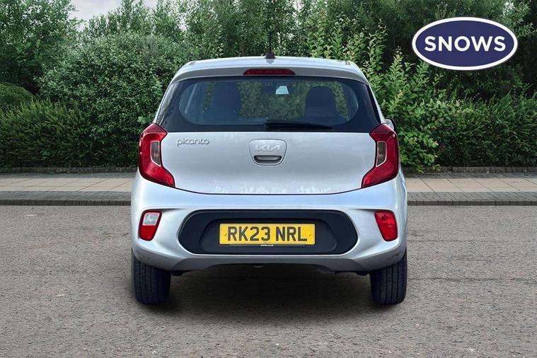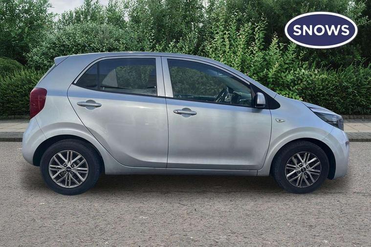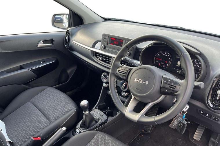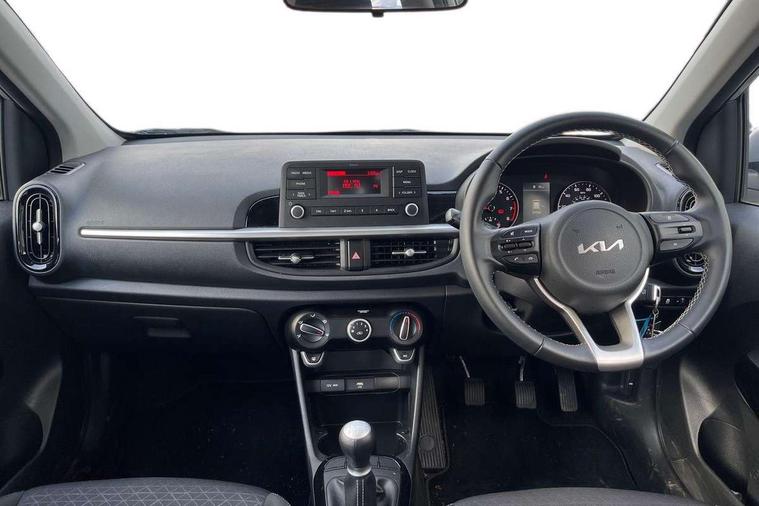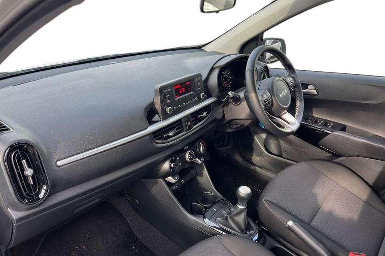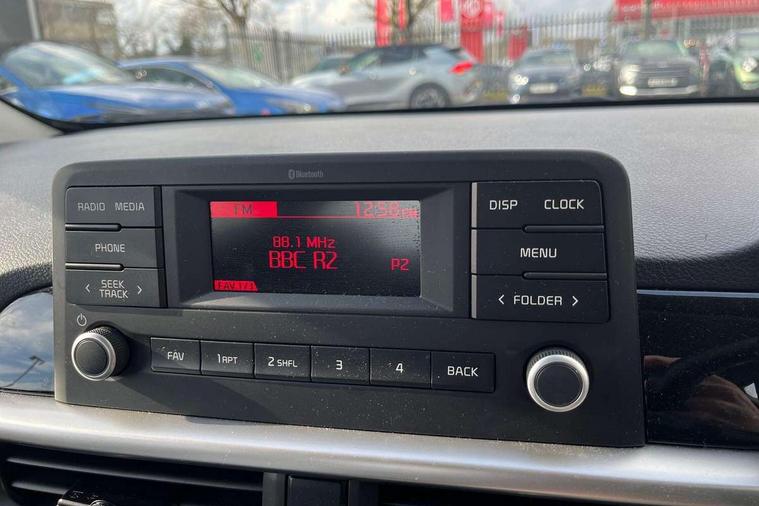 3.8" monochrome audio display with RDS and DAB, Emergency call service, Emergency stop signalling system, External temperature gauge, Motor driven power steering, Tachometer, Tailgate, Trip computer, 4 speaker audio system, Bluetooth with music streaming, Steering wheel mounted controls, USB ports for connection of a media device, Automatic headlight control system, Black radiator grille with chrome surround, Body colour bumpers, Body colour mirrors and door handles, Day/night rear view mirror, Daytime running lights, Electric adjustable heated door mirrors, Front and rear electric windows with drivers's auto up/down function, Headlamp levelling, Heated rear window, High mount brake light, MFR - Multi Focus Reflector halogen headlights with black bezel, Rain sensor, Rear fog lights, Rear side wing doors, Rear wash/wipe, Speed variable front wipers, Tinted glass, Visible VIN plate, Welcome and follow-me home light functionality, 1 x rear coat hook, 12V power point front, 2 seat bench in 2nd row, 3 x passenger assist grips, 60/40 split/folding 2nd row of seats, All round height adjustable headrests, Cupholders in centre console, Driver and front passenger sunvisor with vanity mirror, Driver seat height adjust, Front cabin lights, Glovebox, High gloss lower centre fascia trim, door armrest and air vents, ISOFIX Child seat top tethers and anchor fixings, Leather trimmed steering wheel and gearshift, Luggage area light, Luggage area parcel shelf, Manual air conditioning, Passenger front seatback pockets, Premium cloth upholstery, Silver paint finished interior door handles, Single front passenger seat, Slide/reclining front seats, Tilt adjustable steering wheel, Advanced Driver Assistance Pack - Picanto, 2 x 3-point rear seatbelts, ABS/EBD, Automatic unlocking of doors in case of impact, Dual front airbags, ESC + BAS + VSM + HAC, Front passenger airbag cut-off switch, Front seatbelt height adjusters, Front seatbelt pretensioners + load limiters, Hill hold control, Knee airbags, Rear child proof door locks, Seatbelt warning, Side impact protection, Torque vectoring brake based and straight line stability (SLS), Traction control, Twin curtain airbags, Twin front side airbags, Tyre pressure monitoring system, Anti theft alarm, Engine immobiliser, Folding key, Locking wheel nuts, Remote central door locking, 14" alloy wheels, Tyre mobility kit,