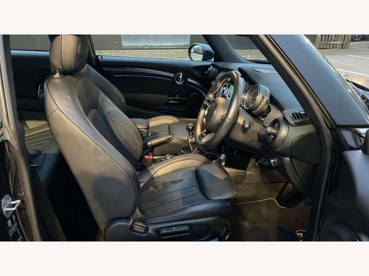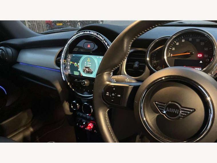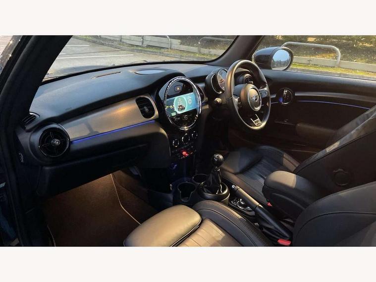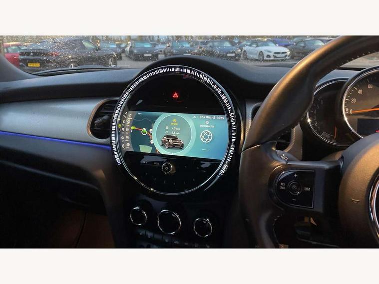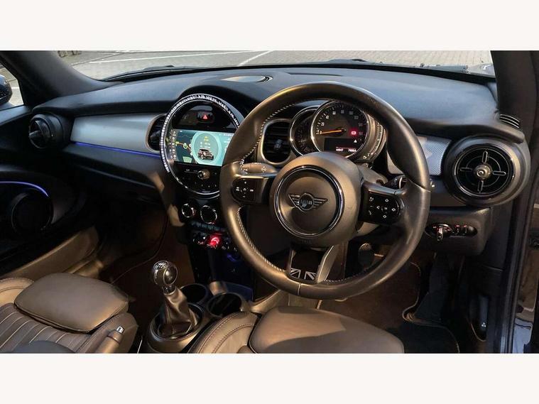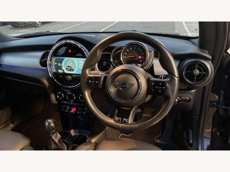 Automatic start/stop function with brake energy recuperation, Compatible mobile phone bluetooth with audio streaming, Cruise control with brake assist, Electro-mechanical speed dependant steering assistance, Flexible car sharing preparation, Instrument cluster, MINI Driving Modes - centre toggle switch to control driving setting (sport, mid and green), Mini E-call, MINI TeleServices, On board computer, Rear park distance control, Service interval indicator, 6 Speed manual transmission including gear change indicator display, Double Vanos system, Fully variable valve control, High precision injection, Performance Control, 4 speakers in front door trims and underneath front seats, 8.8" touchscreen with LED ring, FM tuner and DAB digital radio, Automatic headlight activation switch, Body colour fuel filler cap, Chrome line exterior - radiator grille bars, tailgate handle, lower front grille grating and rear central fog-light, Dynamic brake lights, Electric front windows, Heated rear window, Heated windscreen washer jets, LED headlight with closed ring and daytime driving lights, Metal door sill strips with MINI imprint, Model logo Cooper on right of tailgate, Rain sensor window wipers, Rear fog lights, Rear LED lights with union jack design, Rear window wiper, Side scuttle panel with integrated indicator, Sun/heat protection glass, White indicator lenses, 12V Accessory socket in centre console, 4 lashing eyes in luggage compartment, 60/40 split folding rear seat, Carbon black colour line - Knee roll and door armrest, Chrome interior highlights, Chrome line interior - air vents, gear lever base, door handles and speakers in doors, Cupholders, Front and rear head restraints, Front and rear isofix with front passenger airbag deactivation, Glove compartment, Height and length steering column adjustment, Interior lighting with 12 different colours across the dashboard, underneath door bezel with illuminated laser-engraved design on central display, Leatherette gearshift lever and handbrake gaiters, LED reading lights, vanity mirror lights, front foot well light and spotlight on front seats, Manual air conditioning, Mechanical seat adjustment - forward/back & backrest for front seats and driver seat height adjust, MINI yours badge on exterior pillar, Multifunction steering wheel, Passenger seat height adjuster, Satellite grey headlining including grab handles and clothes hooks, Storage compartments in doors, Sunvisors with vanity mirrors, Velour floor mats, Walknappa leather steering wheel with grey seam and MINI Yours badge on Piano Black lower steering wheel spoke, 3 point seatbelts on all four seats, 6 Airbags - front, side, head and seat belt tensioners, Anti-lock braking system (ABS), DSC - Dynamic Stability Control, Front and rear disc brakes, Single tone fanfare horn, Tyre pressure monitoring system, Alarm system with tilt sensor, monitoring doors, bonnet interior and tailgate, Electronic vehicle immobiliser, Start/stop toggle with keyless go, Tool kit,