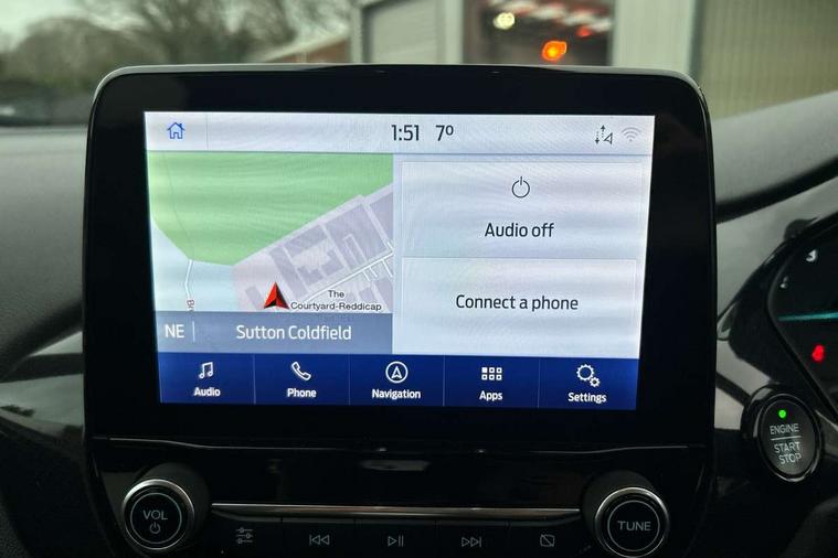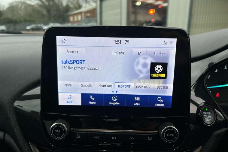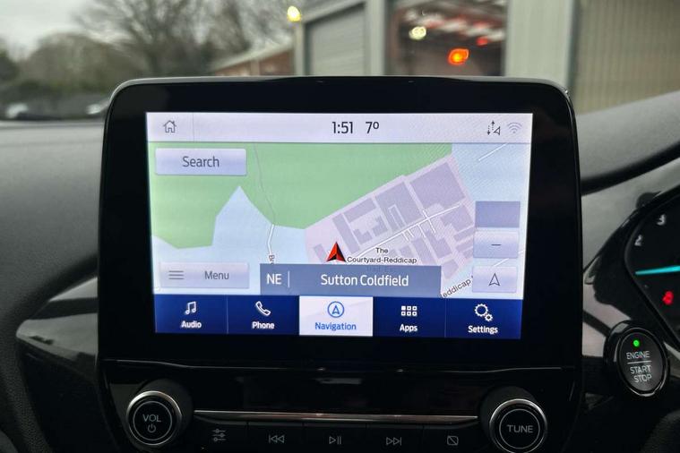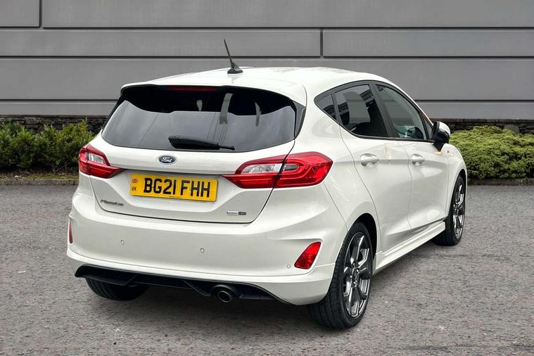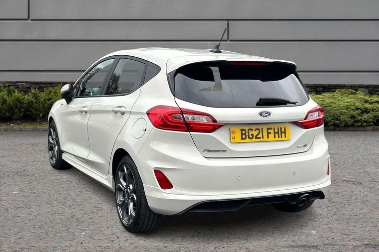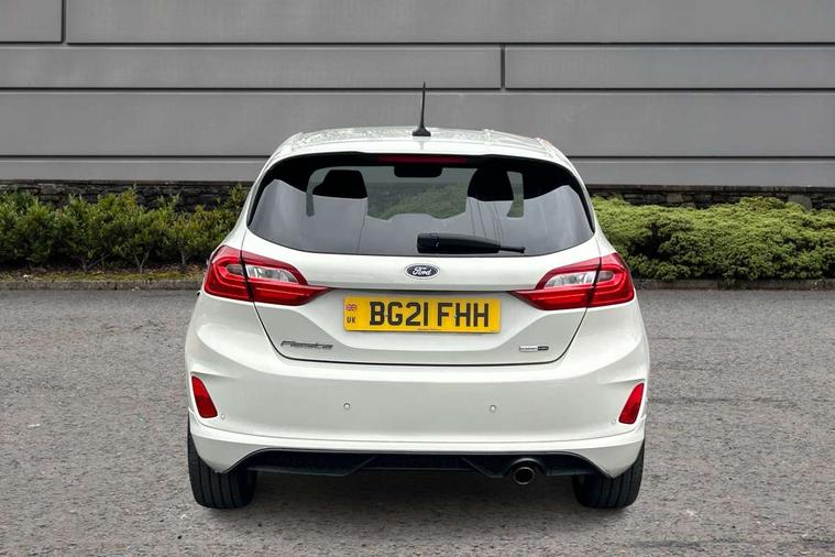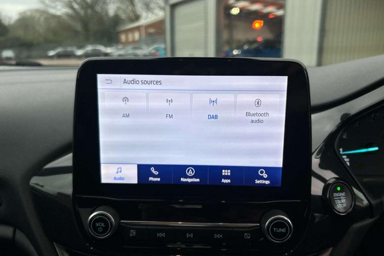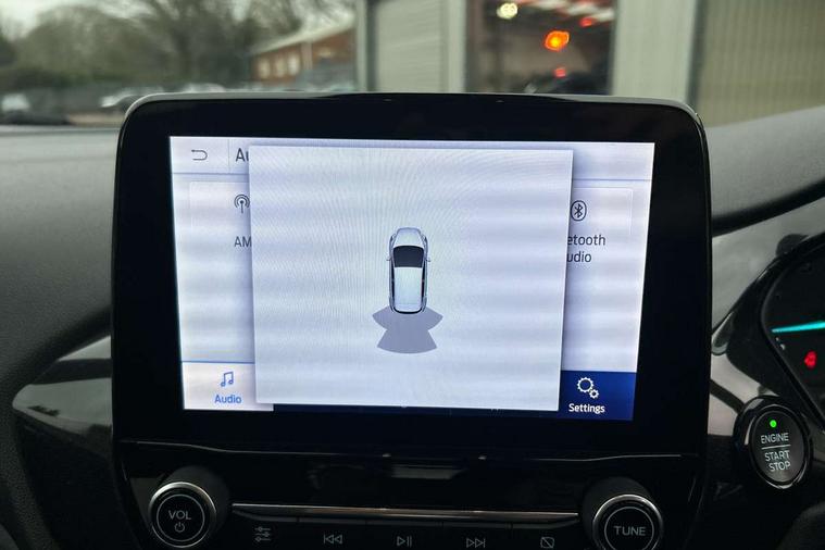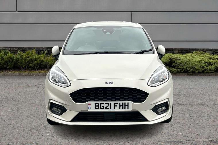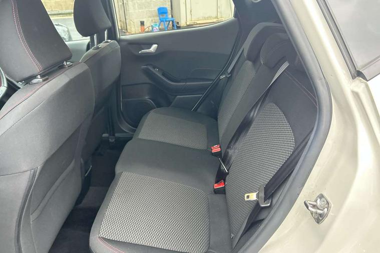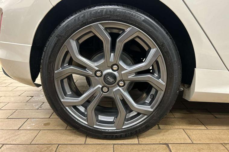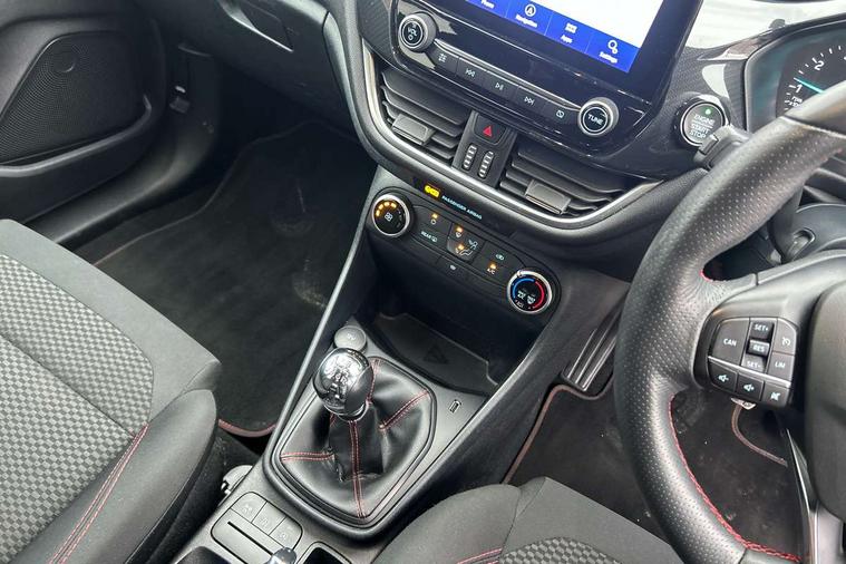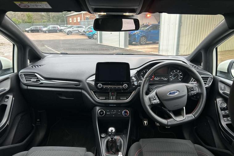Bluetooth system, Electric power steering, Ford easy fuel, Ford SYNC 3 Navigation system incl 8" touchscreen, 7 speakers, FordPass connect, Apple carplay, android auto, voice control and emergency assistance, Rear parking distance sensors, Selectable drive modes (Normal, Sport, Track), Trip computer, Sports suspension, 2 USB ports, Auxiliary input socket, DAB Digital radio, Steering wheel mounted controls, Body colour bumpers, Body colour door handles, Body colour large rear spoiler, Body coloured electrically operated and heated door mirrors with side indicators, Cornering front fog lights, Electric front windows/one touch facility, Electric rear windows, LED Night signature to rear lights, Quickclear heated windscreen, Rain sensing wipers and auto dimming rear view mirror, Rear privacy glass, Rear wiper, Unique ST-Line upper grille & full bodystyling kit with ST-Line wing badges, 3 spoke flat bottomed leather steering wheel, 60/40 split folding rear seat, Adjustable head restraints, Black headlining, Boot carpet, Centre console with opening armrest, 2x cupholders, 12v and USB, Chrome inner door handles, Cloth upholstery, Footwell illumination, Front floor mats in velour, Front map reading lights, Front seat and rear pockets, Illuminated glovebox, Leather gaiter, Load area light, Manual 2 way passenger seat adjust, Manual 4-way driver seat adjust, Manual air conditioning, Overhead console with sunglasses holder, Pollen filter, Rake/reach adjustable steering wheel, Sensico wrapped steering wheel, Sports front seats, NCAP Pack - Fiesta, 3 point seatbelts on all rear seats, ABS+EBA, Curtain airbags, Driver and passenger airbags, Drivers knee airbag, Electronic stability control with hill start assist, Front passenger airbag deactivation, Front side airbags, Seatbelt warning, Two tone horn, Tyre pressure monitoring system, Keyless start with 'Ford Power' starter button, MyKey system, Remote central locking & engine immobiliser, Thatcham Cat.1 alarm, 17" 5 spoke alloy wheels with rock metallic finish,