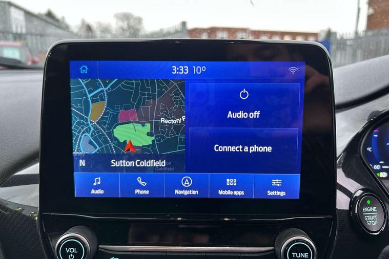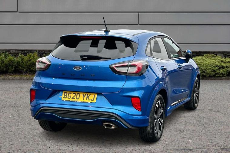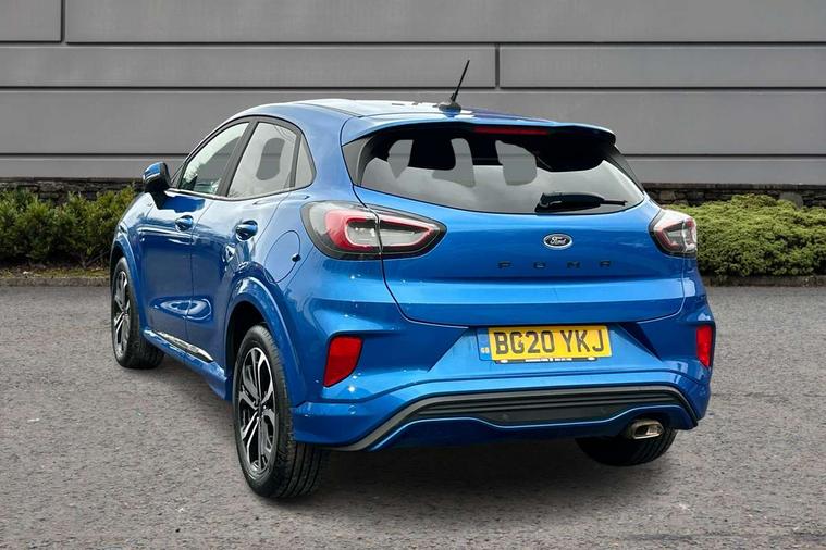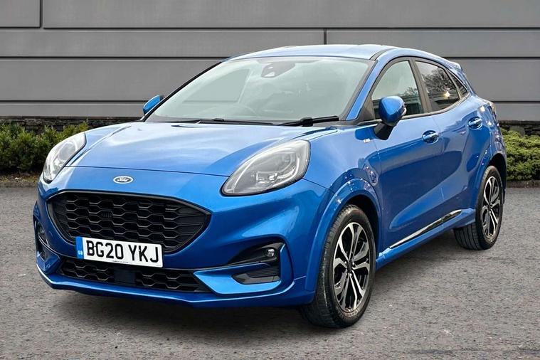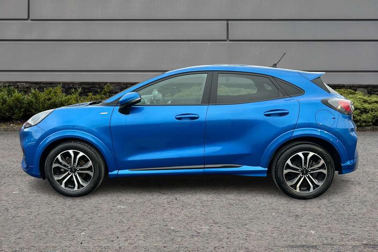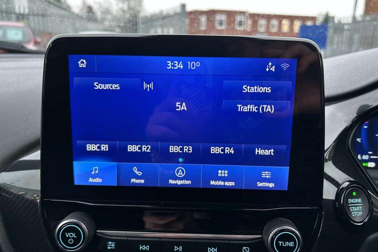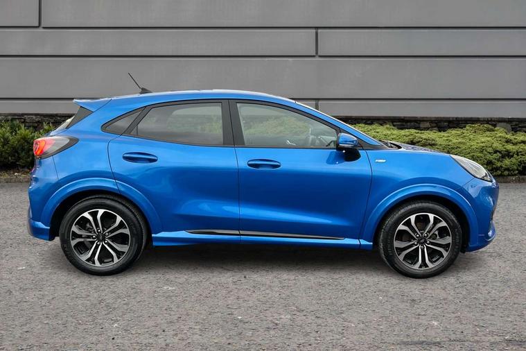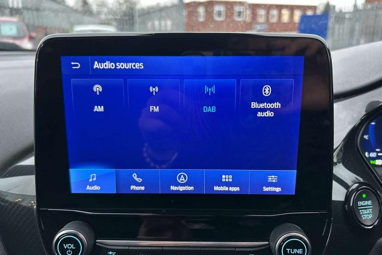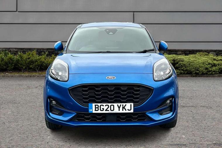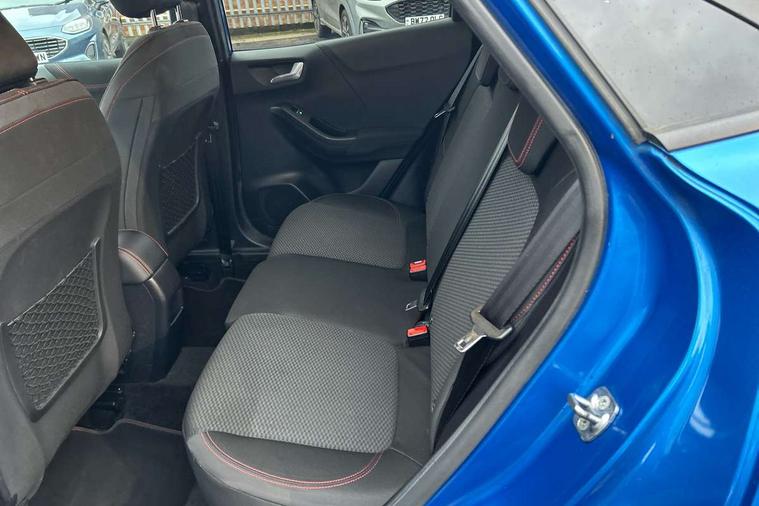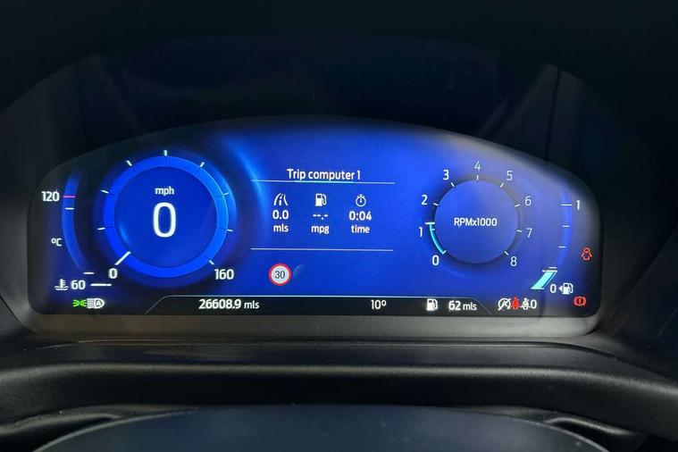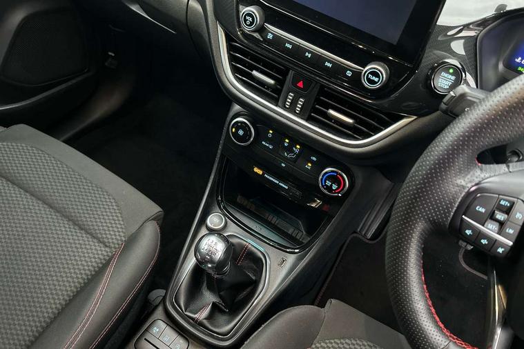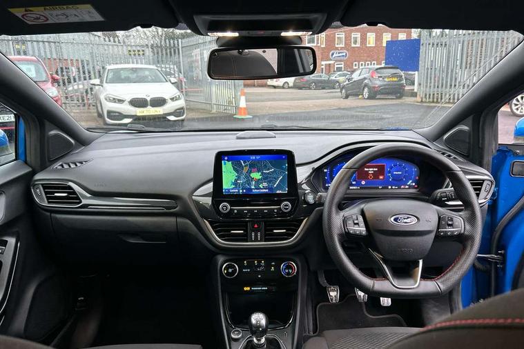 Ford easy fuel, Full digital 12.3" instrument cluster, Lane keeping aid with lane departure warning, Power assist steering, Rear parking sensor, Selectable drive modes(Normal, Eco, Sport, Slippery and Trail), Wireless charging pad, Automatic headlights with rain sensing wipers and auto high beam, Body coloured door mirrors, Front fog lights with cornering lights and LED rear lamps, Power foldable heated door mirrors with puddle lamps, Quickclear heated windscreen, ST-Line body kit with large rear spoiler wth sports suspension, Alloy sports pedals, Centre console with armrest and stowage, Court cloth upholstery with belgrano bolsters, Driver seat height/lumbar adjust, Ford megabox extended bootspace, Front and rear floor mats, Front and rear head restraints, Manual air conditioning, ST-Line flat bottomed sensico leather steering wheel with leather handbrake and aluminium gear knob, 3 rear seatbelts, Electronic stability control (ESC) and hill start assist, Pre-collision assist with autonomous emergency braking, pedestrian/cyclist detection & post-collision braking, Tyre pressure monitoring system (TPMS), Thatcham alarm, Tyre inflation kit,