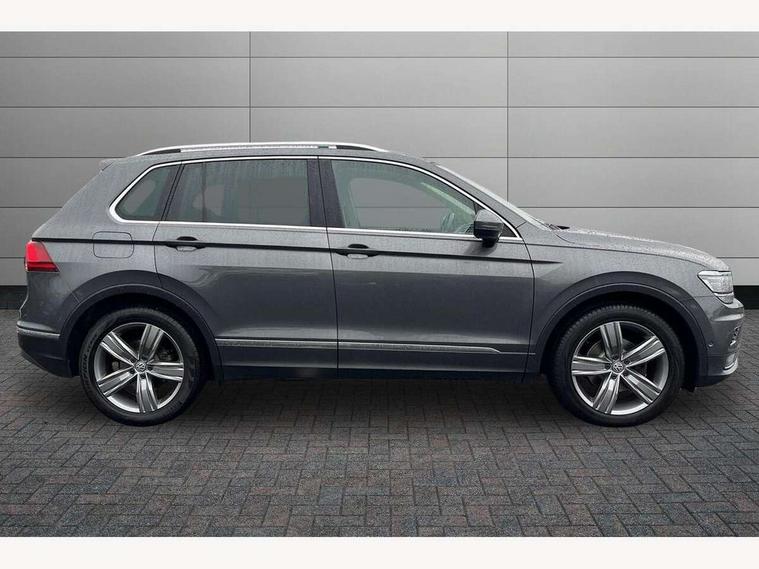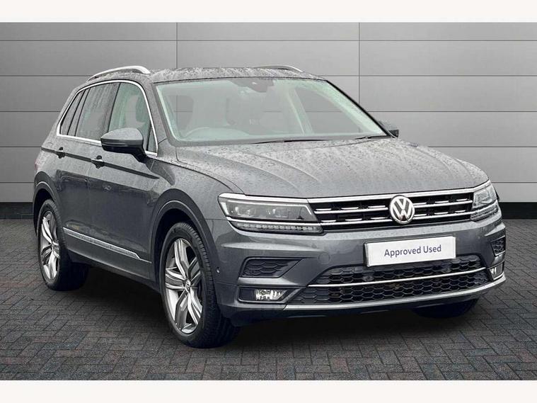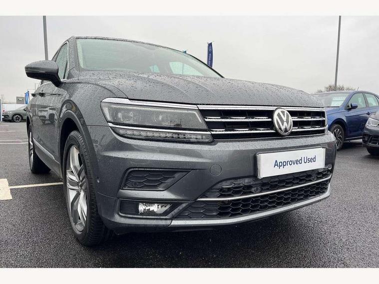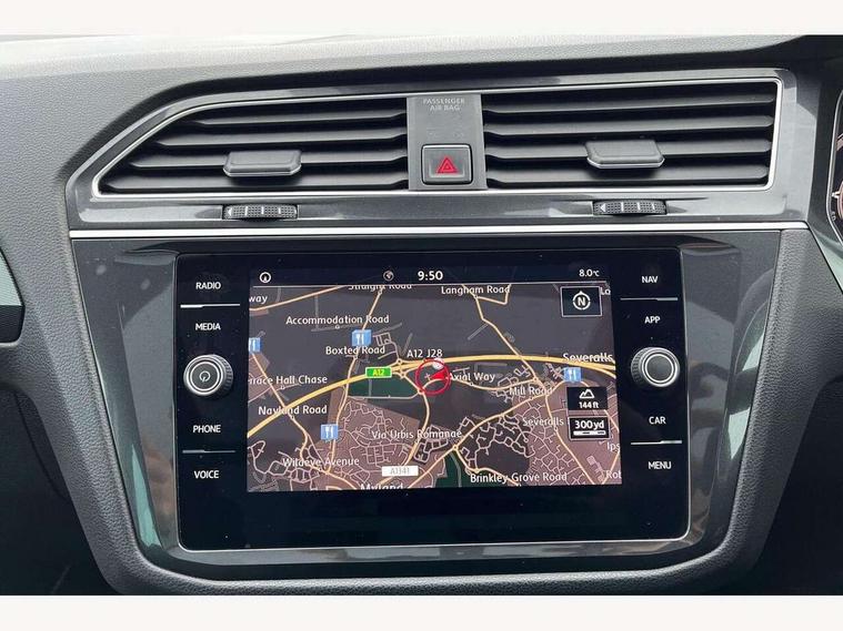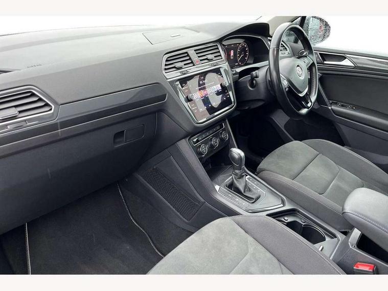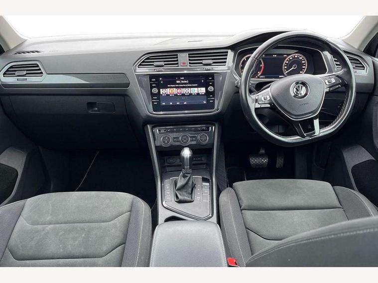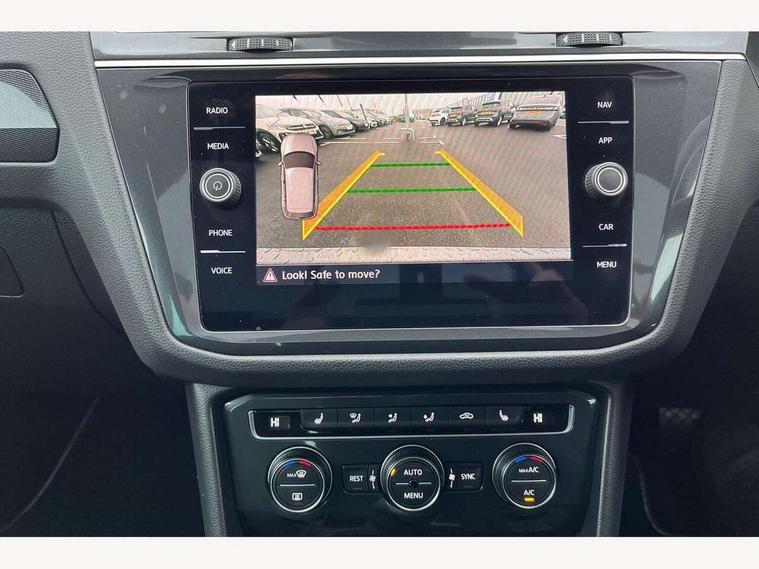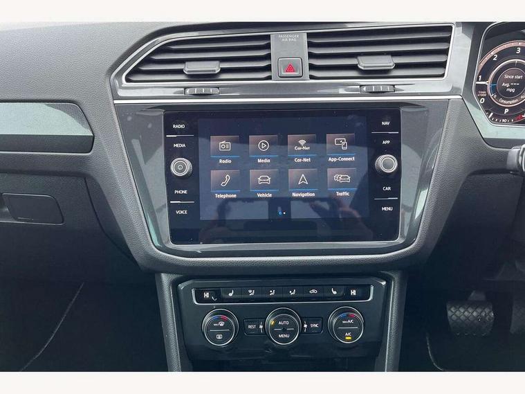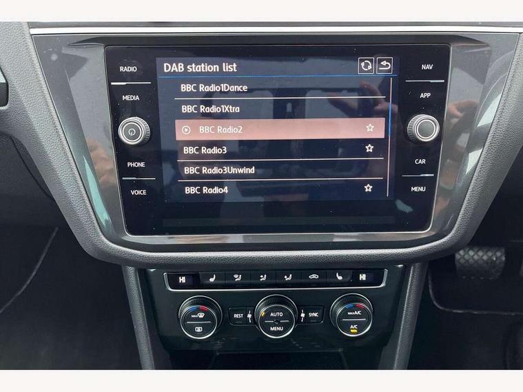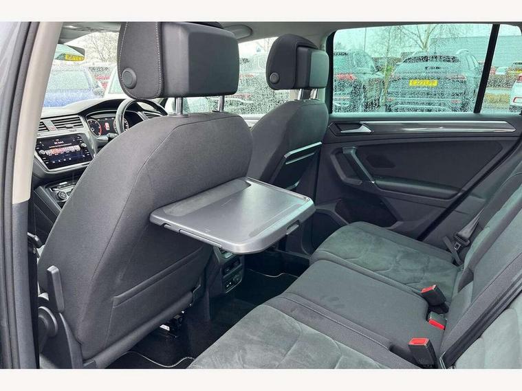 Active information display, Adaptive cruise control, App-Connect, Bluetooth phone integration system, Distance control assist, Fatigue detection system, Instrument cluster, Lane assist, Low washer fluid warning light, Outside temperature display, Service interval indicator, Speed limiter, Warning lights, Diesel particulate filter, XDS electronic differential lock, 2x USB sockets in front, Aux-in socket, DAB Digital radio, MP3 compatible single CD player, SD card slot, Auto dimming interior mirror, Automatic activation of hazard warning lights, Black door protector with chrome inserts, Body colour door handles, Body colour door mirrors, Body coloured bumpers, Chrome side body trim, Chrome side window surrounds, Chrome trimmed radiator grille, Coming/leaving home lighting function, Dusk sensor + auto driving lights, Electric folding door mirrors, Electric heated + adjustable door mirrors, Electric panoramic sunroof with sunblind, Front and rear electric windows, Heated rear window, LED headlights with dynamic light assist daytime running lights and cornering front fog lights, LED rear lights, Rain sensor windscreen wipers, Rear windscreen washer and wiper with interval delay, Silver rear diffuser trim, Silver roof rails, Silver under body guard, Tinted windows (B pillar backwards), Windscreen wipers/ intermittent wipe + 4 position delay, 12V Accessory socket in centre console, 3 rear headrests, 3 zone climate control, 4 load lashing points, 40:20:40 split folding rear seats, Bag hook in luggage compartment, Driver + front passenger lumbar support, Foldable passenger seatback, Front + rear carpet mats, Front centre armrest with 12v socket, Front centre armrest with storage + rear 2 air vents + cupholders, Front seatback folding tables, Height/reach adjust steering wheel, Illuminated driver/passenger vanity mirrors, Illuminated scuff plates, Interior light with delay, Isofix Preparation 2 Rear child seats, Leather gear knob, Load through provision with 2 cupholders when folded, Lockable cooled glovebox, Luggage compartment lighting, Luggage compartment side storage, Map pockets on front seats, Passenger seat height adjuster, Passenger underseat drawer, Rear cupholders, Removable luggage cover, Sliding/reclining rear seats, Storage compartment in driver's door, Storage compartment in passenger's door, Storage compartment in rear doors, Storage tray on dashboard, Sunglasses storage, Variable boot floor, Ambient lighting pack - Tiguan, 3 rear 3 point seatbelts, ABS+EBD+Brake assist, Active bonnet, Active pedestrian safety system, Curtain airbags, Driver/Front Passenger airbags, Driver/Passenger whiplash optimised head restraints, Drivers knee airbag, DTC - Drag torque control, Electronic parking brake with auto hold, ESP with EDL + ASR, First aid kit, Front assist including city emergency braking, Front side airbags, Head airbag system, Height adjustable front 3 point seatbelts + pretensioners, Hill hold control, Passenger airbag deactivate switch, Passenger knee airbag, Pre crash system, Rear side airbags, Seatbelt warning lamp and buzzer, Two tone horn, Warning triangle, Alarm with interior protection, Electronic engine immobiliser, Remote central locking with 2 remote folding keys, Chrome door trim inserts, Piano black interior trim, Steel space saver spare wheel,