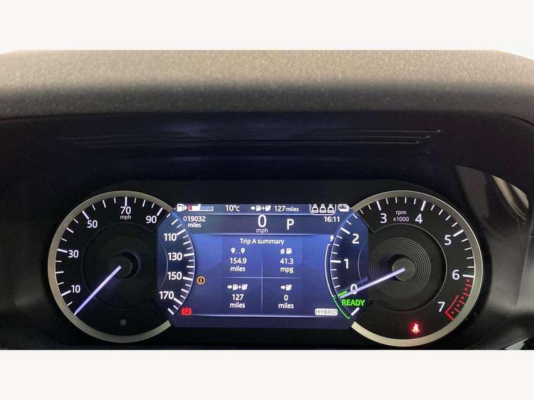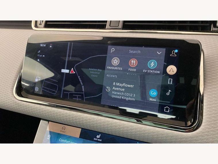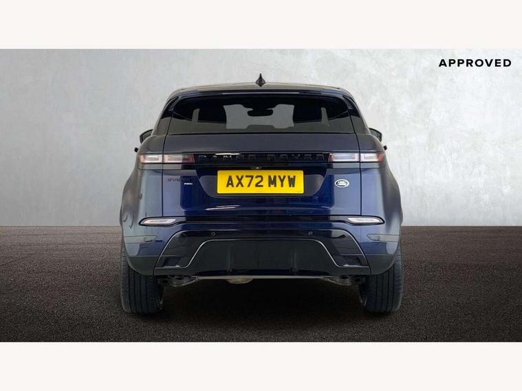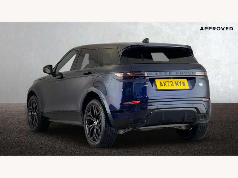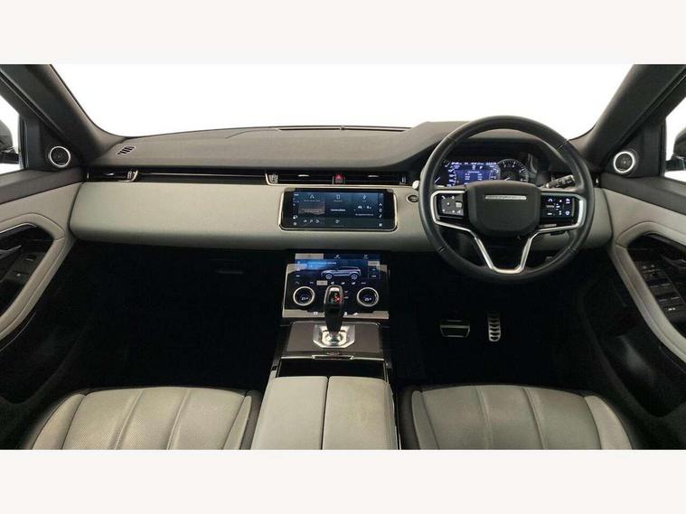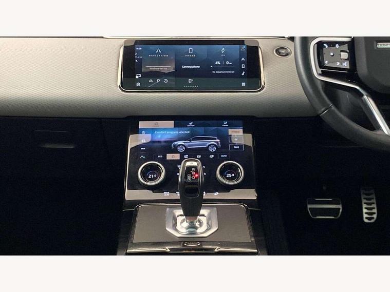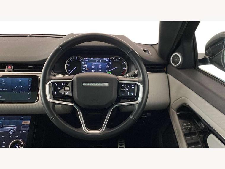 Adaptive cruise control, Android Auto, Apple car play, Bluetooth connectivity, Brake pad wear indicator warning light, Driver condition monitor, eCall emergency system, Electronic power assisted steering (EPAS), Front and rear parking aid, InControl remote, Land Rover InControl apps, Lane keep assist, Pivi pro connected includes upgraded infotainment, connected navigation pro, Nuance speech licence, Push button starter, Traffic sign recognition with adaptive speed limiter, Voice control system, 7 kW onboard charger, All terrain progress control, Electric rear axle drive, Home charging cable, Large fuel tank, Passive suspension, Public charging cable, Terrain Response 2 Auto, Digital Audio Broadcast radio-DAB, Steering wheel mounted controls, Auto headlights, Daytime running lights, Electric windows with one touch open/close and anti trap, Evoque and R-Dynamic badge, Flush deployable exterior door handles, Heated rear window with timer, Heated washer jets, Heated windscreen, P300e badge, Power fold, auto-dimming, heated door mirrors with approach lights and auto dimming driver side, Privacy glass, Rain sensing windscreen wipers, Rear fog lights, Rear side wing doors, Rear wiper, Tailgate spoiler, Third brake light, 40:20:40 split folding rear seats with centre headrest and armrest, Ambient interior lighting, Bright metal pedals, Heated steering wheel, Isofix system on outer rear seats, Overhead lighting console, Overhead stowage for sunglasses, Passive front head restraints, Rear air vents, Rear centre headrest, Rear head restraints, Satin chrome gearshift paddles, Single passenger seat, Sunvisors with illuminated vanity mirrors, Twin sliding front centre armrest, 3 rear 3 point seatbelts, Anti-lock braking system (ABS), Customer configurable autolock, DSC - Dynamic Stability Control, Electronic brake force distribution, Electronic parking brake, Electronic traction control, Emergency braking, Front and rear seatbelt reminder, Hill descent control, Hill launch assist, Low traction launch, Power operated child locks, Roll stability control, Six airbags - Driver and passenger airbags/driver knee airbag/front side airbag and curtain airbags, Torque vectoring brake, Tyre pressure monitoring system, Alarm, Immobiliser, Intrusion sensor, Locking wheel nuts,