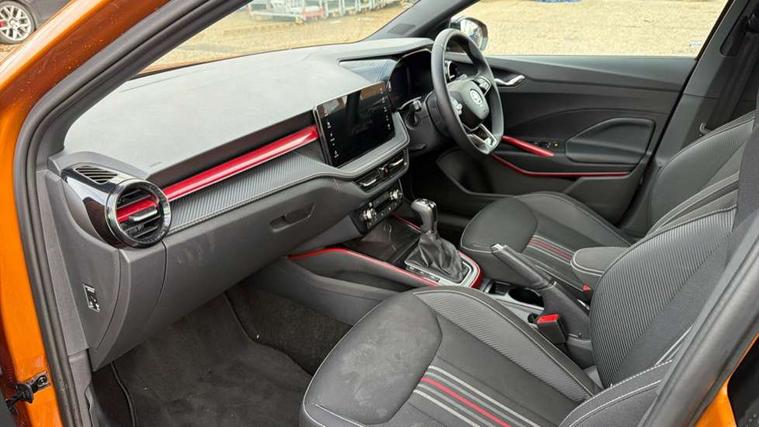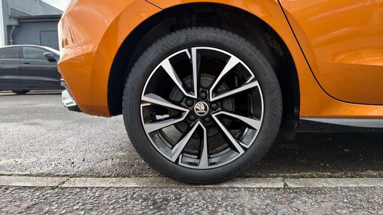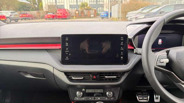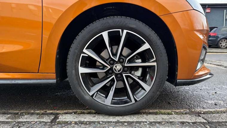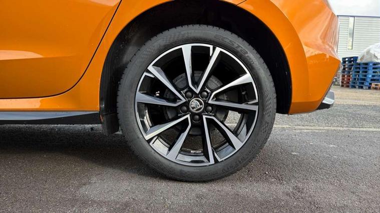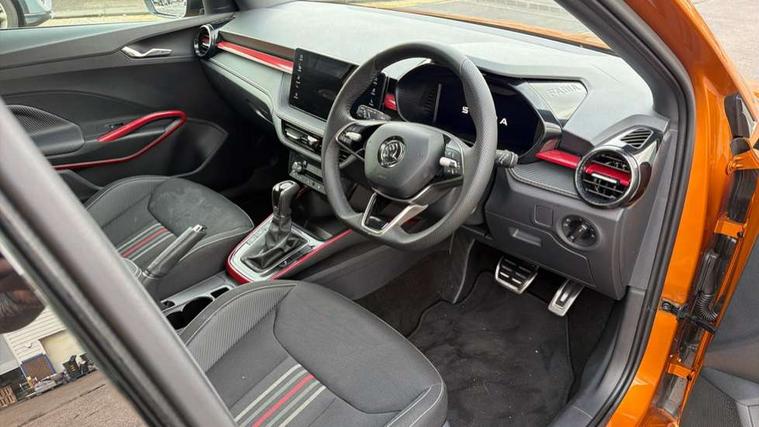 Advanced driver attention and drowsiness monitor, Bluetooth connection, Electromechanical power steering, Exterior temperature gauge, Service interval indicator, Traffic sign recognition, Virtual cockpit with 10.25" colour display, Wireless SmartLink for Apple CarPlay and Android Auto, 6 Speakers (4 in front and 2 in rear), 9.2" colour display skoda navigation system with voice control and web radio, Auxiliary socket for external MP3 player, DAB digital radio reception, Auto dimming rear view mirror, Black radiator grille, Body coloured bumpers, Door mirror integrated indicators, Dynamic headlight range control, Front and rear electric windows, Front window wiper intermittent control, Ice scraper in fuel cap, LED 3rd brake light, LED daytime running lights with coming and leaving home feature, LED rear lights, Monte Carlo badging, Privacy glass, Rear LED fog light, Rear side wing doors, Rear window wiper with washing nozzles, Roof mounted spoiler, SKODA tailgate lettering in black, Sports bumpers, 2 reading lights in front and 2 reading lights in rear, 3 rear headrests, Aluminium pedals, Backrest split and folding, Black headlining, Central console with removable cup holder and storage box, Chrome handbrake release button, Door sills with fabia badging, Dual zone air conditioning with climatronic electronic control, Fabric/artificial leather upholstery, Front centre armrest, Front sports seats, Gearshift knob/handle in leather, Hand brake lever handle in leather, Height adjustable front headrests, Height adjustable front seats, Height adjustable steering wheel, ISOFIX and TopTether anchorage points to the outer rear seats, ISOFIX and TopTether on the front passenger seat, Luggage compartment lighting, Manually adjustable lumbar support in front seats, Metallic painted red central console cover, Metallic red interior door handles, Pollen filter, Rear seat bench unsplit, Single front passenger seat, Sun visors with mirror and airbag label on passenger side, Textile floor mats, Ticket holder, Umbrella in drivers door, Convenience pack - Fabia, Light and view pack plus - Fabia, 3-point height adjustable front seats belts with pretensioner and force limiter, Automatic warning lights in case of crash, Driver and passengers airbag with switch off function, e-Call+, ESC including ABS, MSR, ASR, EDS, HBA and XDS, Front and rear seat belt warning, FRONT ASSIST (AEB City and AEB Inter Urban), Front side airbags, Head airbags, Hill hold control, One tone horn, Pedestrian protection, Three rear 3-points safety seat belts with pretensioner and force limiter including stop function for outer rear seat belts, Tyre pressure monitoring system, Anti-theft alarm system including immobiliser, interior monitoring, backup horn, and towing protection, Central locking with radio remote control, interior controls, SAFE function and 2 foldable keys, Black painted air vents, Carbon effect door and side trim panels, Carbon effect lower decorative trim with white stitching, Red metallic upper decorative trim, Textile Kota grey lower decorative inserts, Anti-theft wheel bolts protection, Super-low rolling resistance tyres,