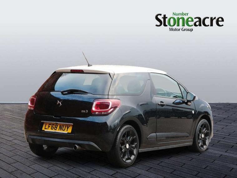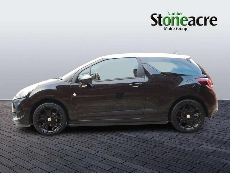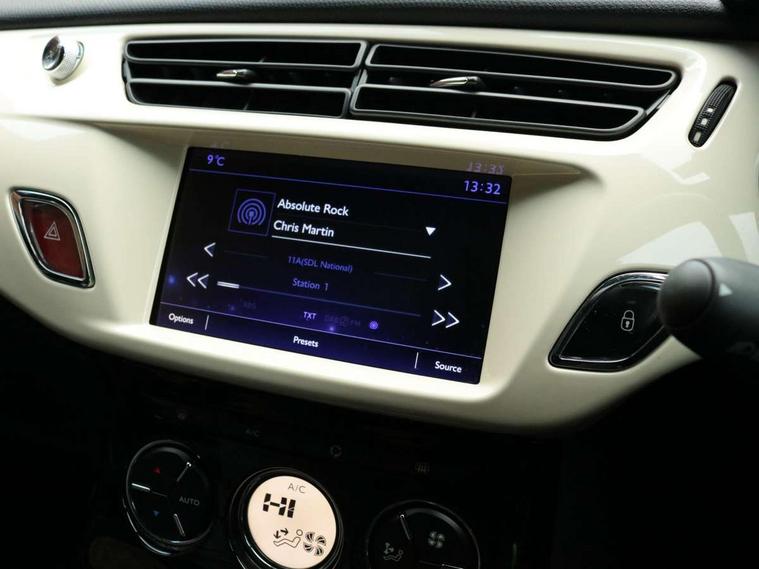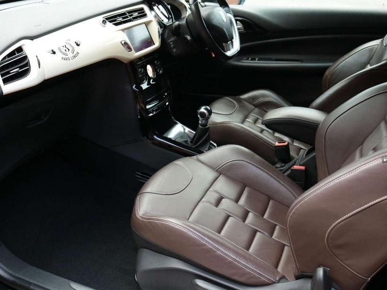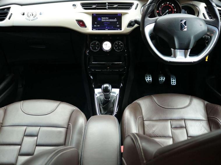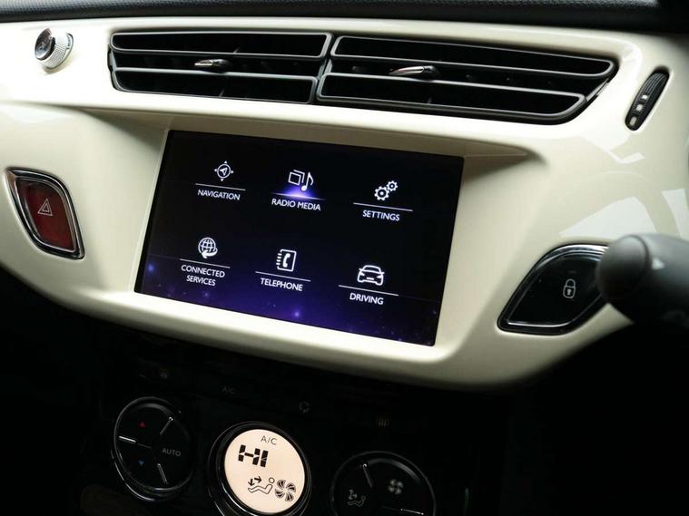 7" touch screen, Bluetooth + USB, Cruise control + speed limiter, DS connect box emergency assist system, DS Connect Nav, Mirror screen with mirror link and car play, Multi function trip computer, Outside temperature display, Rev counter, Reversing camera, Service interval indicator, Variable power steering, Sports suspension, 6 speakers, Auxiliary input socket, DAB Digital radio, Steering wheel mounted controls, 3D effect LED rear lights, Automatic lights and wipers, Body coloured bumpers, Cafe Racer branding on roof, Cafe Racer branding on wings, Chrome door handles, Chrome DS Wings grille, Chrome exhaust tailpipe, Chrome rear bumper inserts, Chrome side rubbing strips, Dark tinted rear windows, Electric adjustable door mirrors, Electric front windows, Electric heated folding door mirrors, Electro-chrome auto-dimming rear view mirror, Gloss black door mirrors, Height adjustable headlamps, LED daytime running lights, LED front fog lights, Metallic paint, Parthenon Cream roof, Rear wiper, Xenon headlamps With LED signature, 12V socket, Automatic air conditioning, Boot light, Driver's seat height adjustment, Driver/pass sunvisor/covered courtesy mirrors, Front and rear headrests, Front armrest, Front courtesy lights, Front door pockets with bottle holders, Front reading light, Front seat and rear pockets, Height/reach adjust steering wheel, Instrument lighting dimmer, Interior mood lighting, Isofix rear child seat preparation, Lashing eyelets in boot, Leather door trim, Leather gear knob, Leather handbrake with chrome insert, Nappa leather upholstery, Parthenon Cream key plip, Perforated Nappa leather sports steering wheel, Pollen filter, Premium carpet mats, Satin chrome door sill protectors, Satin chrome steering wheel inserts, Split folding rear seat, Sport pedals, 5 three point inertia reel seatbelts, ABS + EBD + EBA, Curtain airbags, Driver seatbelt warning indicator, Driver/Front Passenger airbags, ESP, Front lateral airbags, Front seatbelt pretensioners with force limiters, Hill start assist, Tyre pressure monitoring system, Alarm, Deadlocks, Immobiliser, Locking wheel bolts, Remote control central locking, Gloss black centre console and interior door handle surround, Leather trimmed instrument binnacle, Parthenon Cream dashboard, 17" Bellone black diamond cut alloy wheels, Tyre repair kit,