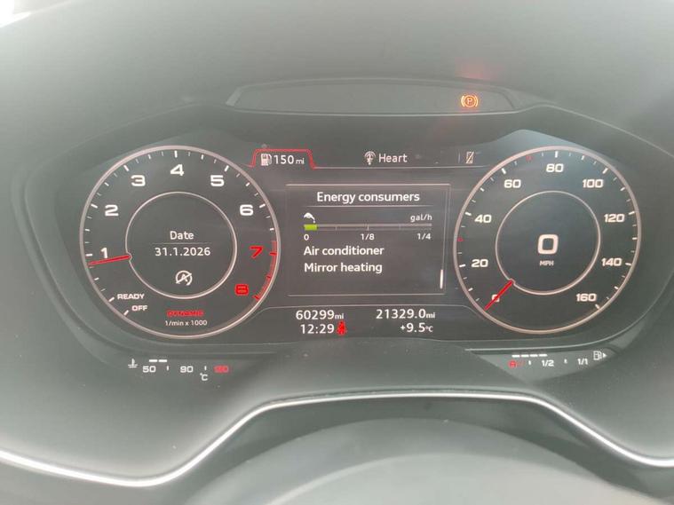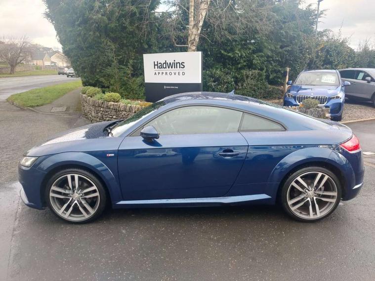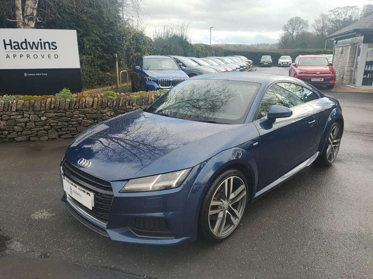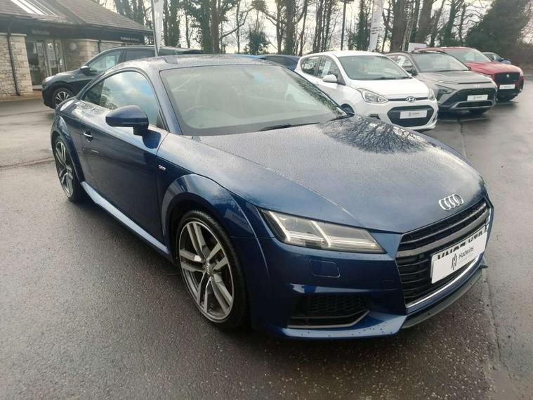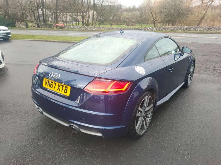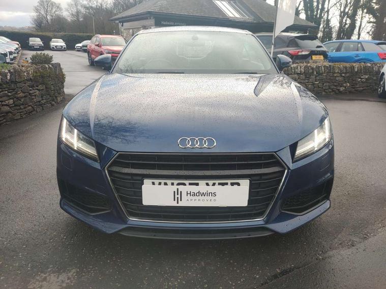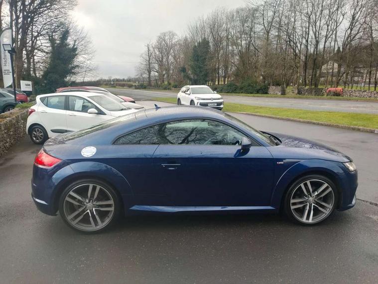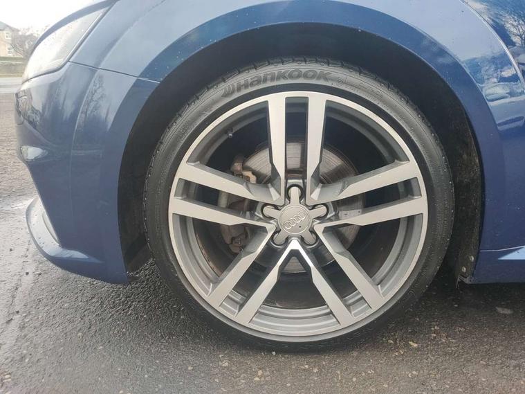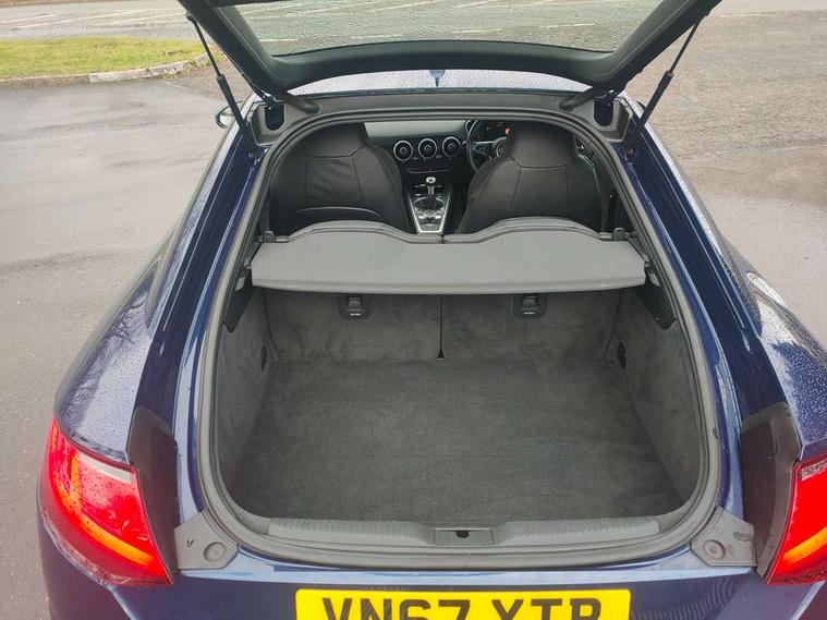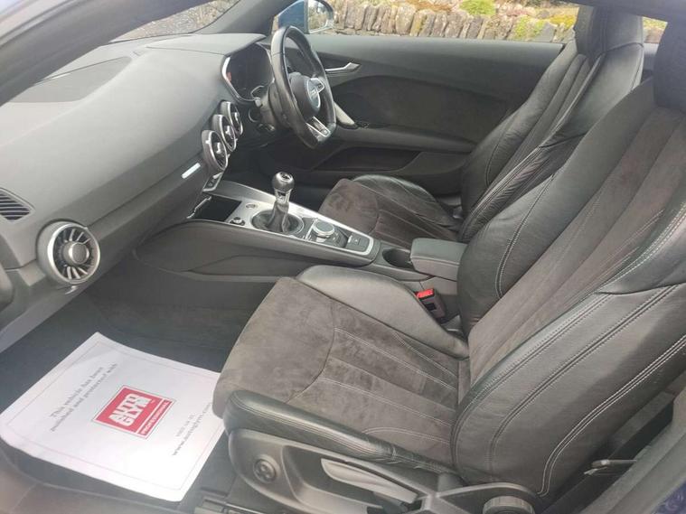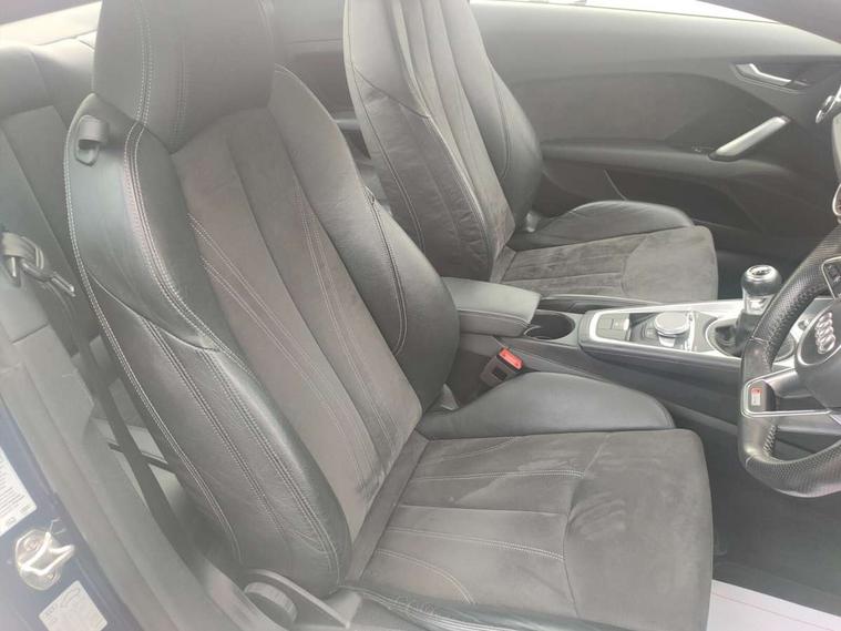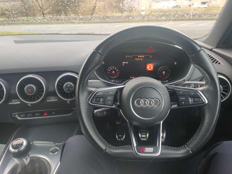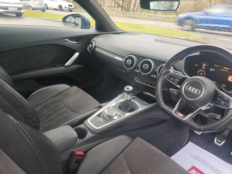 Audi drive select, Audi virtual cockpit - 12.3" high-resolution LCD display with fully customisable instrument cluster, Cruise control + speed limiter, MMI touch panel, Mobile phone preparation with bluetooth interface, Progressive power assisted steering, Service interval indicator, Audi music interface, Auxiliary input socket, Bluetooth audio streaming, DAB Digital radio, MMI Radio with CD player and SD/XC card slot, Auto headlight range control, Body colour bumpers, Body colour door mirrors, Electric front windows, Front fog lights, Green tinted heat insulating glass, High gloss black front grille, LED daytime running lights, Rear diffuser, Retractable rear spoiler, S Line body styling, Sunband for windscreen, 3 spoke leather multifunction sports steering wheel, Aluminium door sill trims, Black headlining, Electric lumbar support, Extended aluminium look with stainless steel pedals, Front centre armrest, Front head restraints, Front passenger seat isofix location point, Height/reach adjust steering wheel, ISOFIX on outer rear seats, Perforated leather gearknob, Split folding rear seat, Top tether anchor plate for isofix child seat, Auto dimming rear view mirror with light and rain sensors pack - TT, Non smoking pack - TT/TT RS, 3 point front seat belts, ABS, ASR traction control, Curtain airbags, Driver/Front Passenger airbags, EDL traction control, Electromechanical parking brake, ESP, First aid kit, Front passenger airbag deactivation, Front side airbags, Head airbags, Seatbelt warning, Tyre pressure warning, Warning triangle, Anti theft alarm, Immobiliser, Keyless Start, Locking wheel bolts, Remote central locking, Matt brushed aluminium inlays, Tyre repair kit,