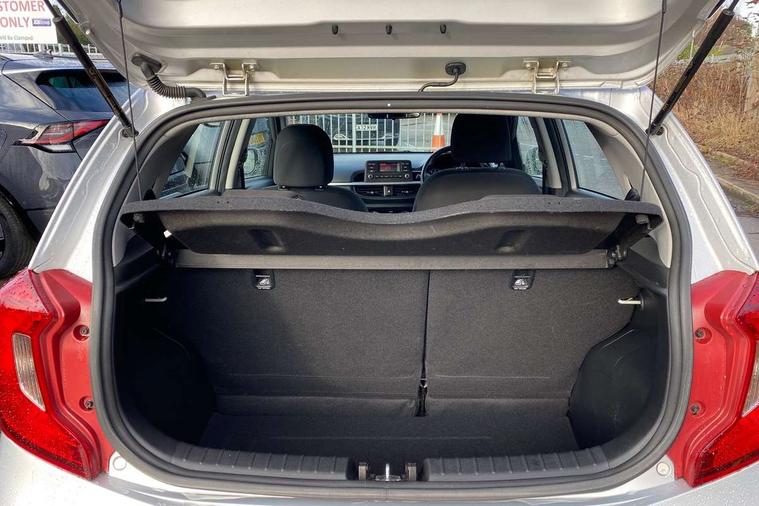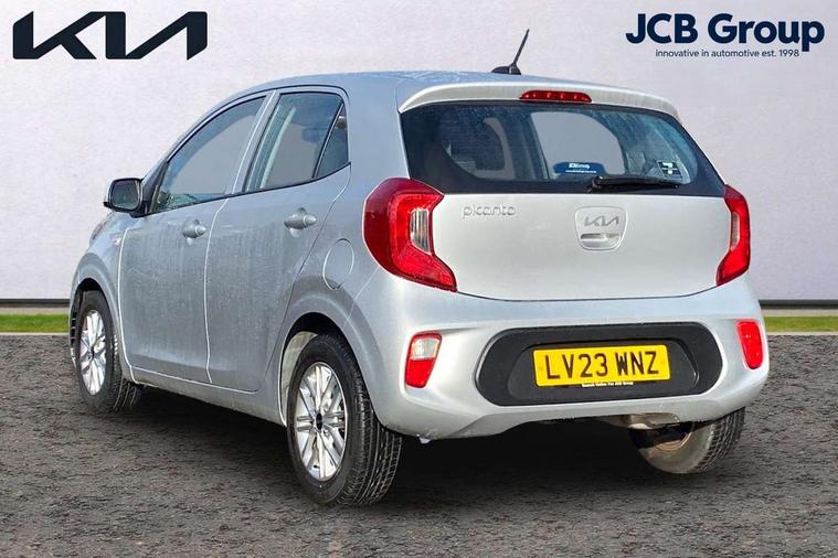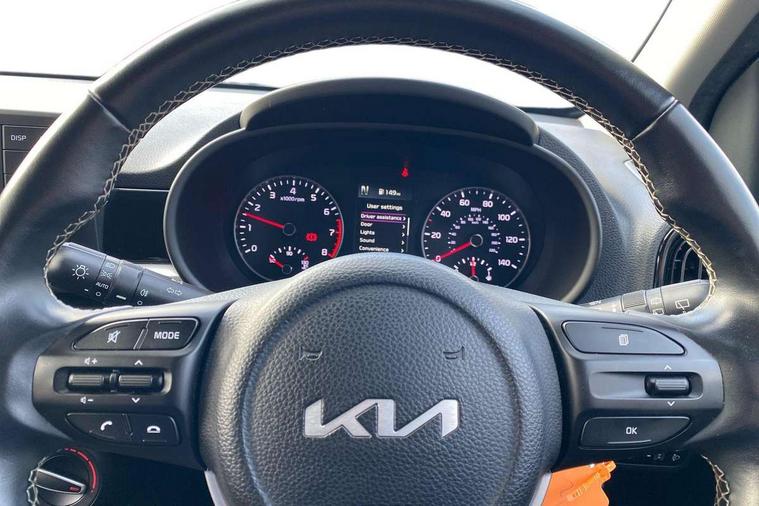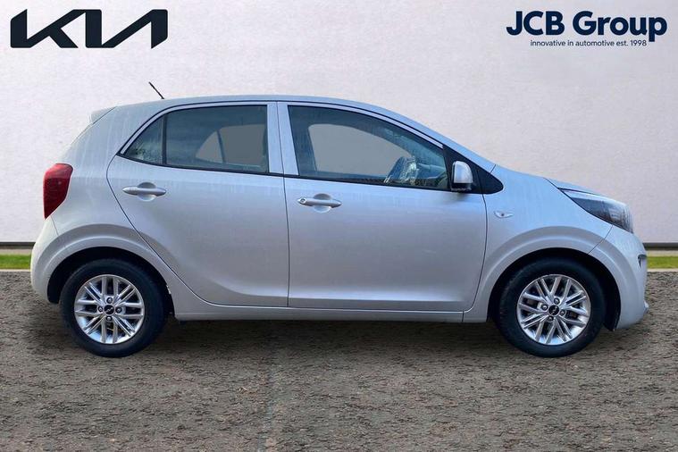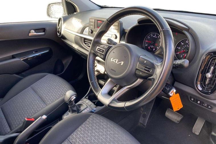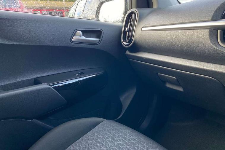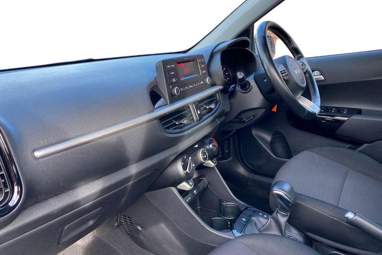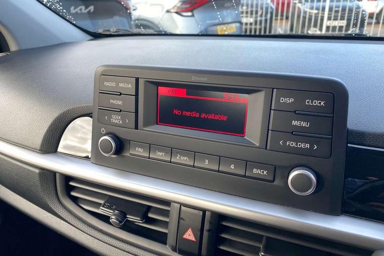 3.8" monochrome audio display with RDS and DAB, Emergency call service, Emergency stop signalling system, External temperature gauge, Motor driven power steering, Tachometer, Tailgate, Trip computer, 4 speaker audio system, Bluetooth with music streaming, Steering wheel mounted controls, USB ports for connection of a media device, Automatic headlight control system, Black radiator grille with chrome surround, Body colour bumpers, Body colour mirrors and door handles, Day/night rear view mirror, Daytime running lights, Electric adjustable heated door mirrors, Front and rear electric windows with drivers's auto up/down function, Headlamp levelling, Heated rear window, High mount brake light, MFR - Multi Focus Reflector halogen headlights with black bezel, Rain sensor, Rear fog lights, Rear side wing doors, Rear wash/wipe, Speed variable front wipers, Tinted glass, Visible VIN plate, Welcome and follow-me home light functionality, 1 x rear coat hook, 12V power point front, 2 seat bench in 2nd row, 3 x passenger assist grips, 60/40 split/folding 2nd row of seats, All round height adjustable headrests, Cupholders in centre console, Driver and front passenger sunvisor with vanity mirror, Driver seat height adjust, Front cabin lights, Glovebox, High gloss lower centre fascia trim, door armrest and air vents, ISOFIX Child seat top tethers and anchor fixings, Leather trimmed steering wheel and gearshift, Luggage area light, Luggage area parcel shelf, Manual air conditioning, Passenger front seatback pockets, Premium cloth upholstery, Silver paint finished interior door handles, Single front passenger seat, Slide/reclining front seats, Tilt adjustable steering wheel, Advanced Driver Assistance Pack - Picanto, 2 x 3-point rear seatbelts, ABS/EBD, Automatic unlocking of doors in case of impact, Dual front airbags, ESC + BAS + VSM + HAC, Front passenger airbag cut-off switch, Front seatbelt height adjusters, Front seatbelt pretensioners + load limiters, Hill hold control, Knee airbags, Rear child proof door locks, Seatbelt warning, Side impact protection, Torque vectoring brake based and straight line stability (SLS), Traction control, Twin curtain airbags, Twin front side airbags, Tyre pressure monitoring system, Anti theft alarm, Engine immobiliser, Folding key, Locking wheel nuts, Remote central door locking, 14" alloy wheels, Tyre mobility kit,