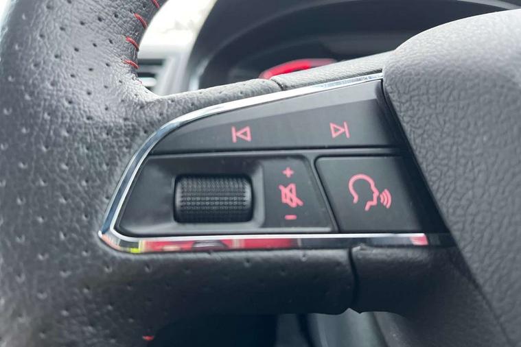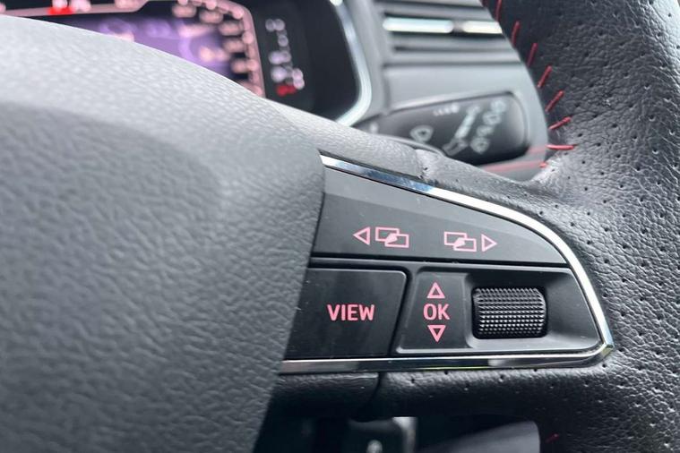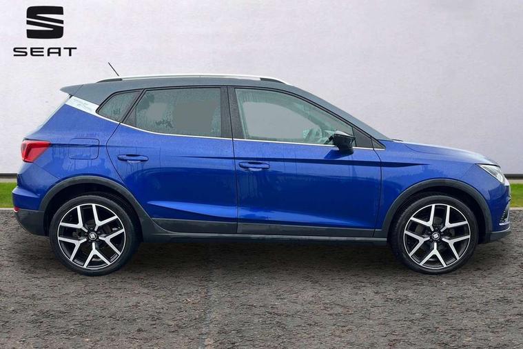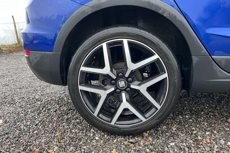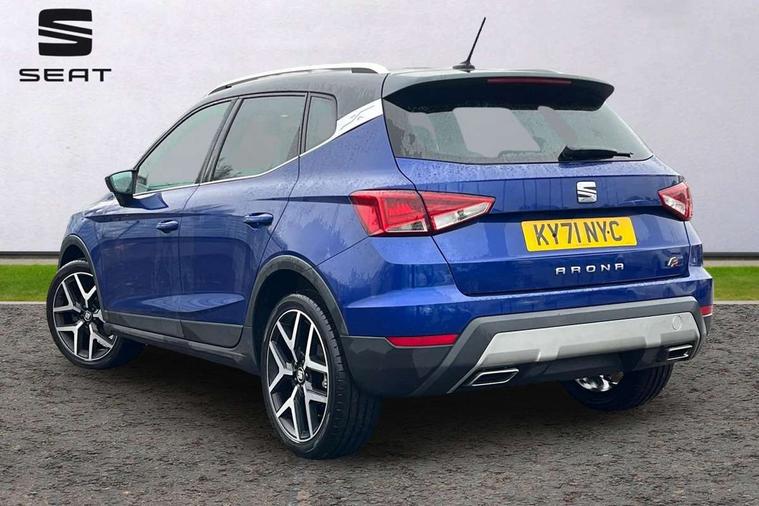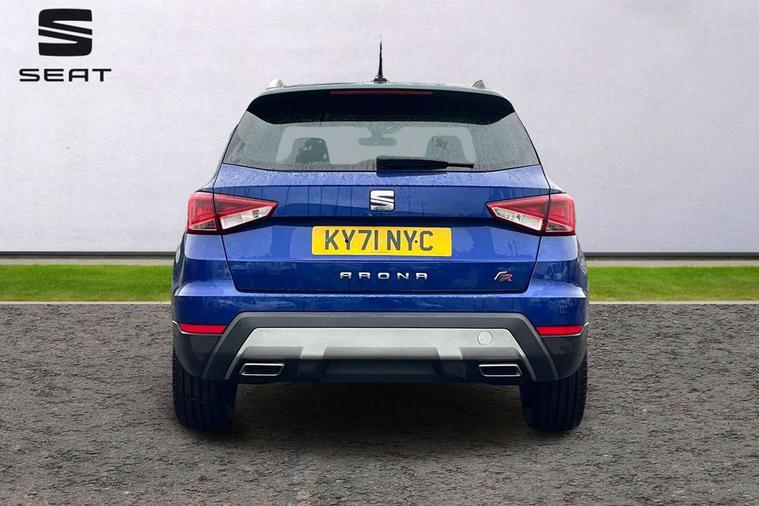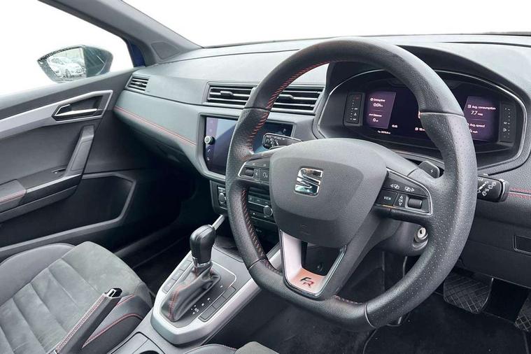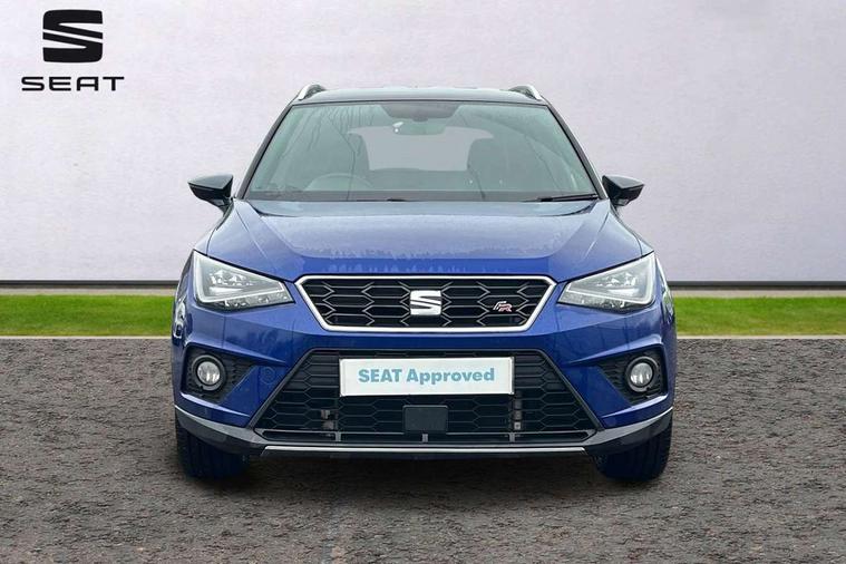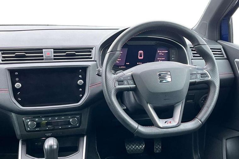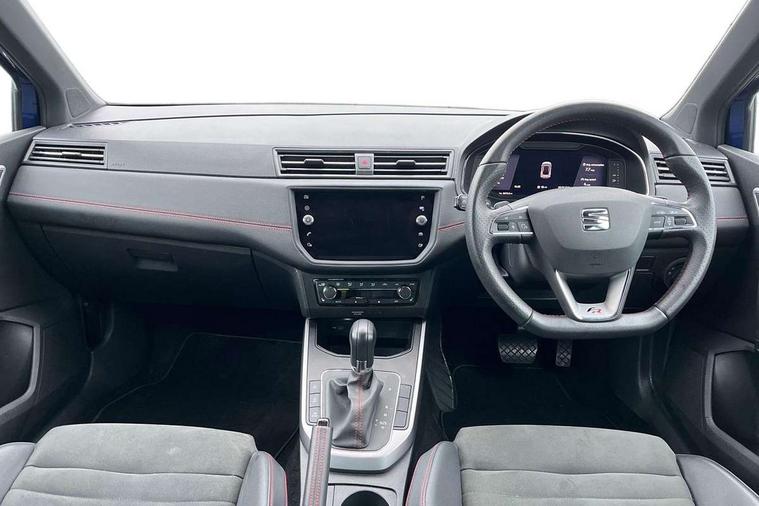 'Lights On' Reminder warning buzzer, Cruise control and speed limiter, Digital clock, Digital cockpit, Electric speed sensitive power steering, Full Link Smartphone Integration with Mirror Link, Apple Car Play, Google Android Auto with USB cable for Apple and Android compatibility, Low fuel warning light, Outside temperature display, Rear parking sensor, RPM counter, Seat connect with safety, service, remote and online, SEAT Drive profile - Four different models normal-sport-eco-individual, steering response, throttle response and gear shifts mode, Trip computer, Sports suspension, Bluetooth interface for hands free and audio streaming, DAB digital radio and AM/FM radio, Steering wheel mounted audio controls, Anti theft roof antenna, Auto dimming interior rear view mirror, Automatic activation of hazard warning lights, Automatic headlights, Body coloured bumpers, Body coloured door handle inserts, Chrome front grille frame, Chrome roof rails, Chrome window trim, Coming/leaving home lighting function, Dark tinted rear windows, Electric front/rear windows with one touch/auto up/down, Electrically adjustable, heated and folding door mirrors, Full LED headlights dipped and mainbeam + front and rear fog lights, Ice metal door side panels, LED daytime running lights, LED rear tail lights and licence plate lights, Protective side mouldings, Rain sensing wipers, Rear window wash/wipe, Roof colour door mirrors, Twin exhaust pipe styling hidden exhaust pipe, Visible VIN plate, Windshield wiper with intermittent control and potentiometer, 2 cupholders, 60/40 split folding rear seat, Aircare filter, Black interior roof, Double boot floor, Driver sunvisor with covered mirror + card holder, Dual zone climate control, Front courtesy light with front reading lights, Front sport seats, Gear shift indicator, Heated front seats, Height adjustable front seats, Height/reach adjustable steering column, Illuminated boot, Instrument lighting with brightness control, Interior light in footwell, central console and door panel, ISOFIX points in outer rear seats with top tether anchorage points, Microsuede cloth upholstery, Multi-colour ambient interior lighting, Passenger sunvisor with vanity mirror, Perforated flat bottomed leather steering wheel/gear knob/handbrake with red stitching and FR logo, Steering wheel mounted gearshift paddles, Two front and three rear height adjustable headrests, Connectivity pack plus - Arona, Interior chrome pack - Arona, 3 point seatbelts on all rear seats, ABS, Active front headrests, Child locks on rear doors, Driver and front passenger airbags with front passenger airbag de activation, front side and curtain airbags, Electronic stability control, Emergency Brake Assist (EBA) and front assist, Front and rear seatbelt reminder, Hill hold control, Multi-Collision braking, Tiredness recognition system, Traction control, Tyre pressure monitoring system, 2 folding remote keys with window open/close function, Alarm with back-up horn, Electronic engine immobiliser, Locking wheel bolts, Remote central locking + deadlocks, Tow away protection, Interior chrome line trim, Leatherette dashboard, 18" Performance alloy wheels,