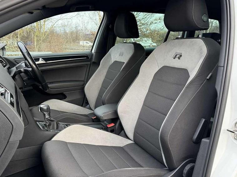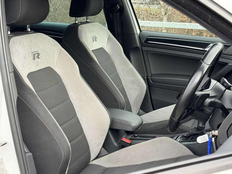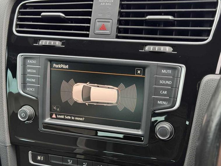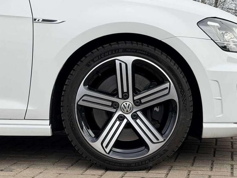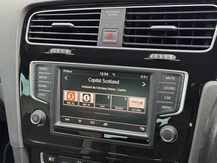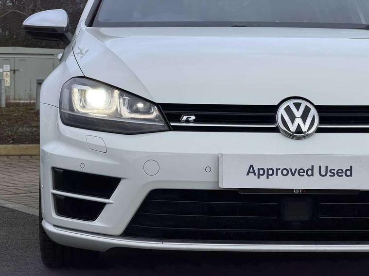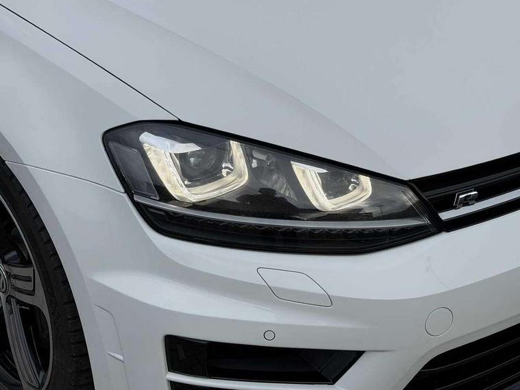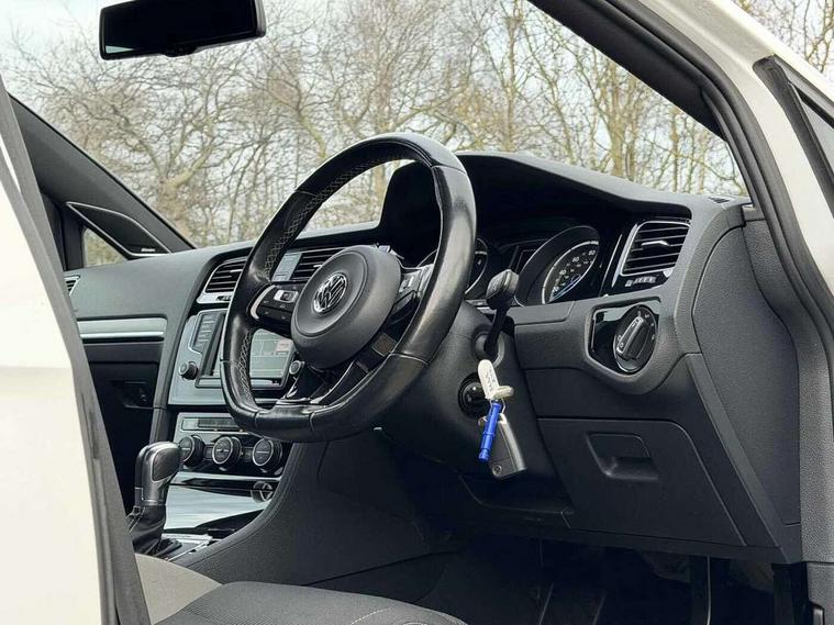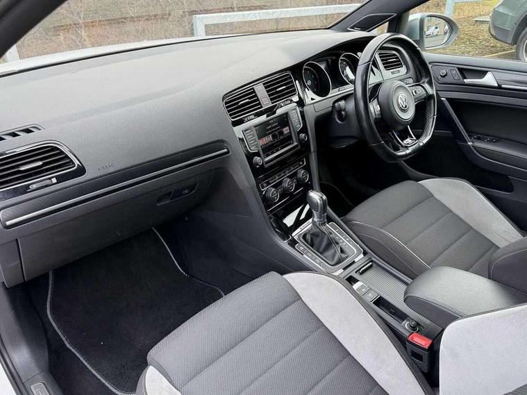 'Lights On' Reminder warning buzzer, Bluetooth Telephone preparation, Brake pad wear indicator warning light, Cruise control + speed limiter, Driver alert system, Exterior temperature gauge, Front and rear parking sensors, Multi function display colour screen, Multifunction computer - Midline, Progressive power assisted steering, Rev counter, TFT display screen, Traffic Master traffic alert system, Trip and service interval display, Warning buzzer and light for front seatbelts unfastened, Lowered sports suspension, 8 Speakers, Auxiliary input socket, Composition media system with Radio/CD/MP3, DAB Digital radio, iPod adaptor, MDI with USB/iPod connection cables, SD card slot, Auto dimming rear view mirror, Bi-xenon headlights with washers + dynamic curve lighting + LED daytime running lights, Black rear diffuser, Body colour bumpers, Body colour door handles, Body colour rear roof spoiler, Chrome door mirrors, Chrome surround for front fog lights, Chrome trimmed radiator grille louvre inserts, Coming/leaving home lighting function, Cornering front fog lights, Door mirror integrated indicators, Dusk sensor + auto driving lights, Electric front windows, Electric rear windows, Electrically adjustable and heated door mirrors, Heat insulated tinted glass 65% light absorbing from B pillar back, Heated rear windscreen, Honeycomb radiator grille - black, Rain sensor, Range adjustable headlights, Rear windscreen washer and wiper with interval delay, Silver roof rails, Twin exhaust tailpipe, Windscreen wipers/ intermittent wipe + 4 position delay, 12V socket in luggage compartment, 3 rear headrests, 3 spoke steering wheel, 4 boot load lashing points, 60/40 split folding rear seat, Air conditioning - 2 zone electronic climate control, Bag hook in luggage compartment, Black headlining, Blue ambient lighting, Courtesy light delay, Cover for storage compartment in centre, Dust/pollen filter, Front + rear carpet mats, Front centre armrest with storage box and rear air vents, Front footwell illumination, Front seat back storage pockets, Gearshift paddles, Grab handles, Height/reach adjust steering wheel, Illuminated door sills, Illuminated vanity mirrors, Isofix preparation for 2 rear child seats, LED reading lights, Load through provision with rear centre armrest and cupholders x2, Lockable, illuminated, cooled glovebox, Luggage compartment cover, removable, Luggage compartment lighting, Multifunction leather steering wheel with leather gear knob/handbrake grip, Stainless steel pedals, Storage compartment in roof console with cover, Storage compartments in doors, Storage drawer under driver's seat, Sun visors, Variable boot floor, height adjustable and removable, White adjustable panel illumination, Mirror pack - Golf, Styling pack - Golf R/R-Line, 3 point height adj front seatbelts + pretensioners, 3 rear 3 point seatbelts, ABS, Black brake calipers, Child locks on rear doors, Collision mitigation braking system, Door open warning reflectors, Driver/Front Passenger airbags, Driver/Passenger whiplash optimised head restraints, Drivers knee airbag, Electronic brake force distribution, Electronic parking brake with auto hold, ESP with EDL + ASR, Front and rear curtain airbags, Front passenger airbag deactivation, Front side airbags, Fuel cut off safety device, Hydraulic Brake Assist (HBA), Pre crash system, Tyre pressure monitor, Warning triangle and first aid kit holder, Alarm with interior protection, Electronic engine immobiliser, Remote central locking with 2 remote folding keys, Carbon touch decorative inserts, Chrome air vent surrounds, Chrome-plated light switch surround, Cyclone decorative inserts, Gloss black decorative inserts in dash, Space saver spare wheel,