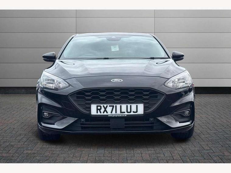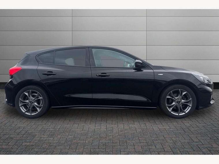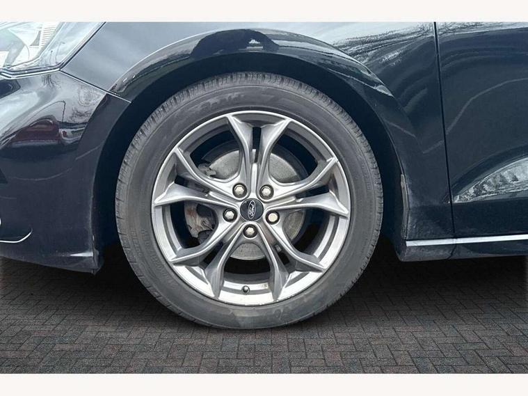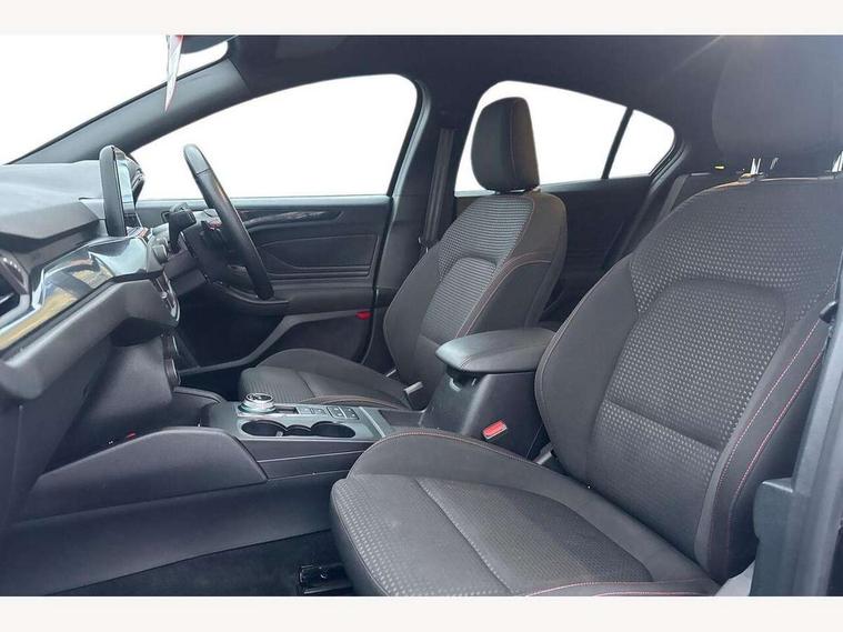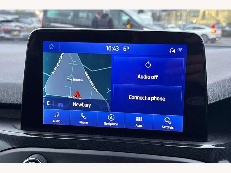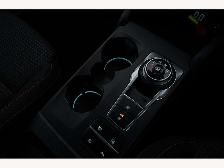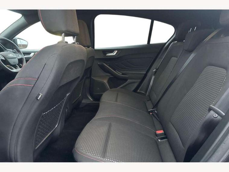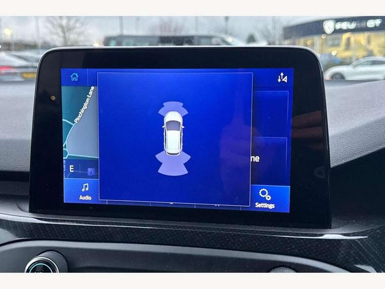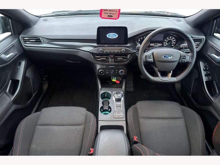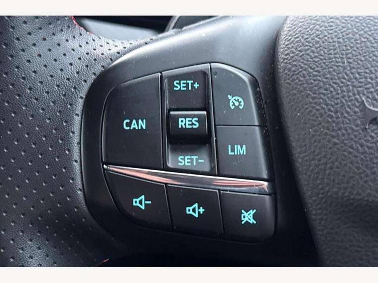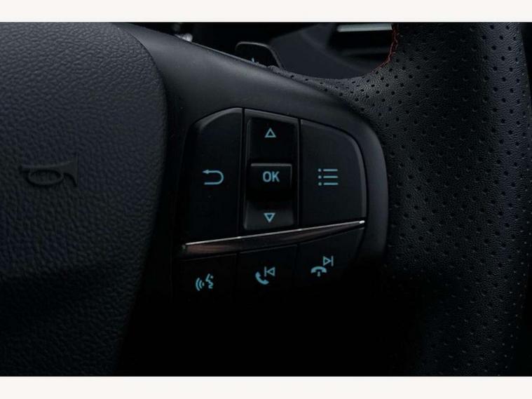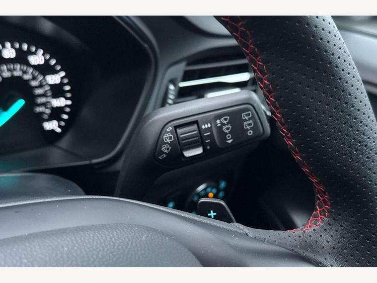 Bluetooth system, Digital clock, Easy fuel capless refuelling system, Eco mode, Ford pass connect, Ford SYNC 3 with 8" TFT touchscreen, and app link Android auto/Apple carplay, Intelligent speed assist, PAS, Rotary gear shift dial, Selectable drive mode, Trip computer, Sports tuned suspension, 6 speakers, Aux input, 'Quickclear' heated windscreen/heated washer jets, Auto headlamps (on/off), Body colour large rear spoiler, Body colour side skirt, Body coloured bumpers, Body coloured door handles, Body coloured electrically operated and heated door mirrors with side indicators, Electrically operated front and rear windows with one touch opening and closing, Front variable intermittent wipers with electric wash, Halogen reflector headlamps, Heated rear window, LED daytime running lamp, LED front fog lamps with cornering function, Polished twin tailpipe, ST-Line upper and lower grille with full body styling kit and wing badges, Tailgate wash/wipe, 3 spoke flat bottomed leather steering wheel with red stitching, 60/40 split back and cushion rear seats with 2 height adjustable headrests, Alloy finish pedals, Centre console with armrest, Cloth upholstery with red stitching, Dark headliner, Driver's lumbar support, Front floor mats, Height adjustable front headrests, Isofix child seat preparation, Manual air conditioning, Paddle shift controls, Reach + rake adjustable steering column, Rear centre headrest, ABS+Electronic Brake force Distribution, Auto hold function, Driver airbag, Electronic parking brake, Electronic stability control, Front and rear seatbelt reminder, Front inertia reel height adjustable seatbelts with pre-tensioners, Front passenger airbag, Front side airbags, Hill start assist, Passenger airbag deactivate switch, Post collision braking, Pre collision assist with autonomous emergency braking and pedestrian/cyclist detection, Side curtain airbags, Three rear inertia reel lap/diagonal seatbelts, Tyre pressure monitoring system, Keyless start with 'Ford Power' starter button, MyKey system, Remote central locking & engine immobiliser, Thatcham category 1 alarm, Contrast stitching - Red, 17" 5x2 spoke alloy wheels with rock metallic finish, Mini steel spare wheel,