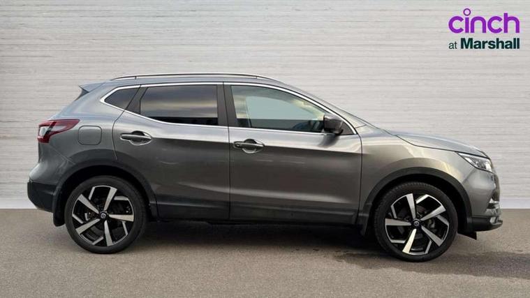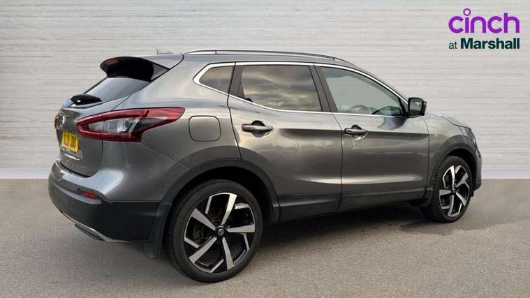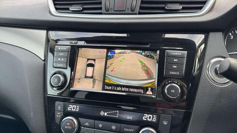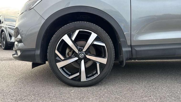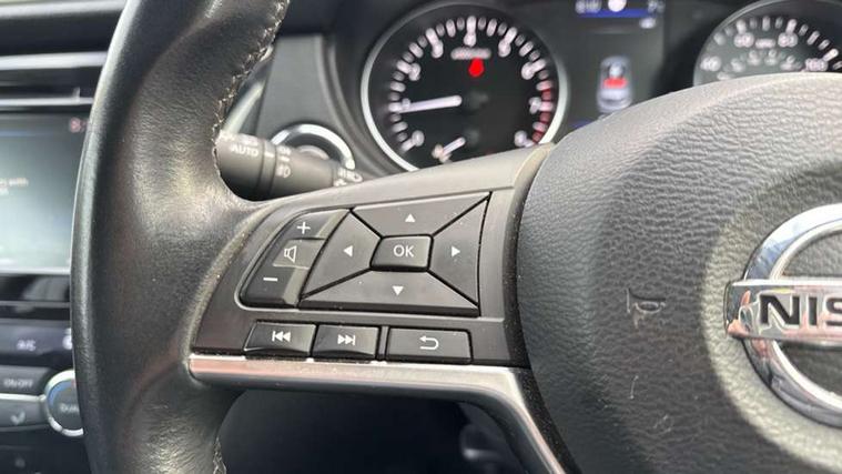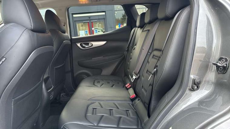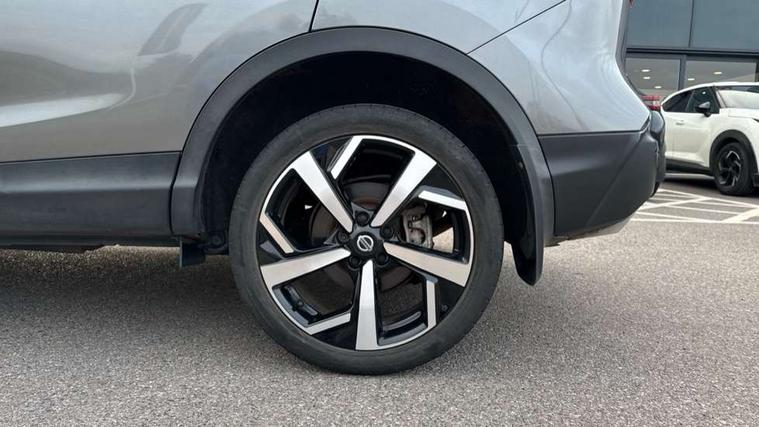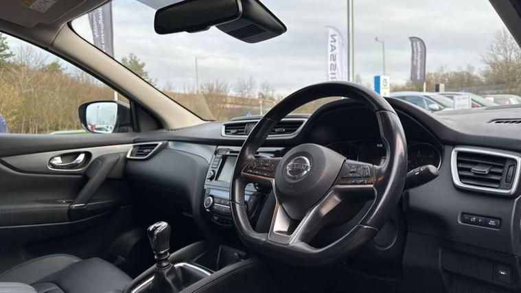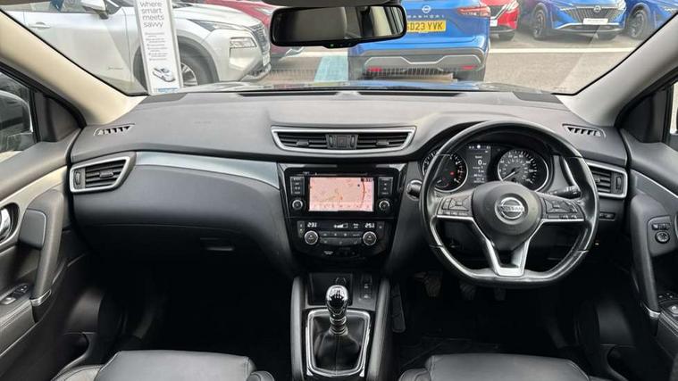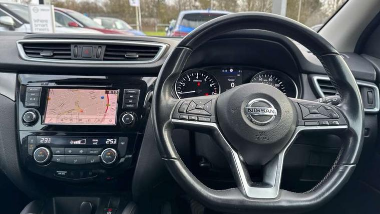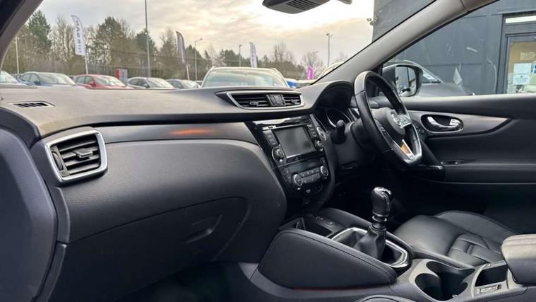 360 degree Intelligent around view monitor, Advanced drive assist display 5'' TFT coloured screen, Apple car play/Android Auto, Bluetooth connectivity, Cruise control + speed limiter, Electric speed sensitive power steering, Front parking sensors, Idle stop/start system, Intelligent park assist, Lane departure warning system, Nissan connect evo 7" touchscreen navigation and entertainment system, Normal or sport selectable steering, Outside temperature sensor, Premium Tomtom connected services, Push button starter, Rear parking sensors, Service interval indicator, Smartphone integration, Traffic sign recognition, Trip computer, Voice control system, Nissan chassis control (intelligent ride control, intelligent trace control), 6 speakers, AM/FM radio, CD audio system, Aux-in socket, DAB Digital radio, Steering wheel mounted audio controls, USB port, Anti dazzle rear view mirror, Auto wipers, Body colour bumpers, Body coloured door handles, Body coloured door mirrors, Chrome window surround, Daytime running lights dip function when turn signal applied, Electric adjustable heated door mirrors with memory, Electric folding door mirrors, Electric front and rear windows with one touch illuminated window controls, Front fog lights, High beam assist, Intelligent auto headlights, LED indicators in door mirrors, Matt silver roof rails, Privacy glass, Rear roof spoiler, Rear wiper with reverse link, Shark fin antenna, Silver rear styling plate, Underbody vortex generators, 2 X front 12v power sockets, 3 height adjustable rear headrests, 60/40 split folding rear seat, Ambient interior lighting, Ambient lighting around centre console, Boot lighting, Centre console storage box/armrest, Chrome interior door handles, Dual zone climate control, Electric 4-way lumbar support for drivers seat, Electrically adjustable driver seat with memory, Electrically adjustable passenger seat, Front and rear door pockets with bottle holders, Front and rear seat belt pre-tensioners with load limiters, Height adjustable front headrests, Individual rear seat reading lights, ISOFIX restraints on outer rear seats x2, Leather D shaped steering wheel, Leather gear lever, Leather knee pad, Luggage board system, Luxury floor mats, Manual height adjustable passenger seat, Manual lumbar support on passenger seat, Monoform front sport seats with plastic backboard, Nappa leather upholstery with 3D quilted, Parcel shelf stow function under luggage board, Pollen filter, Rear armrest with 2 cupholders, Synthetic leather wrapped door handle with contrasting stitching, Tilt/telescopic adjustable steering wheel, Glass roof pack - Qashqai, Heat package - Qashqai, LED pack - Qashqai, 6 airbags - Driver, front passenger, curtain and side airbags, ABS, ESP, EBD and brake assist, Auto hold function, Child locks on rear doors, Electronic parking brake, Front and rear seat belt warning, Height adjustable front seatbelts, Hill start assist, Intelligent emergency braking with pedestrian recognition, Manual passenger airbag deactivation function, Three 3 point rear seatbelts, Tyre pressure monitoring system, Anti-theft immobiliser, Intelligent Key, Remote central locking, Thatcham Cat.1 alarm, Carbon graphite dash trim, 19" Alloy wheels,