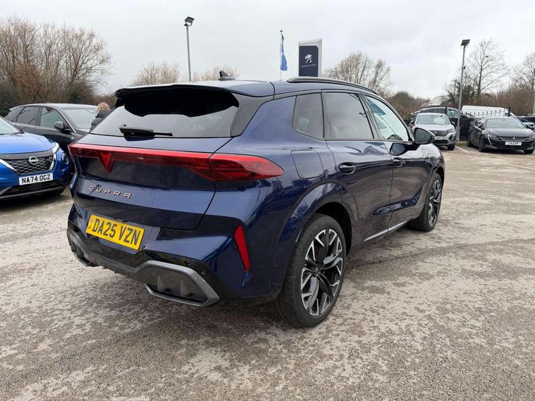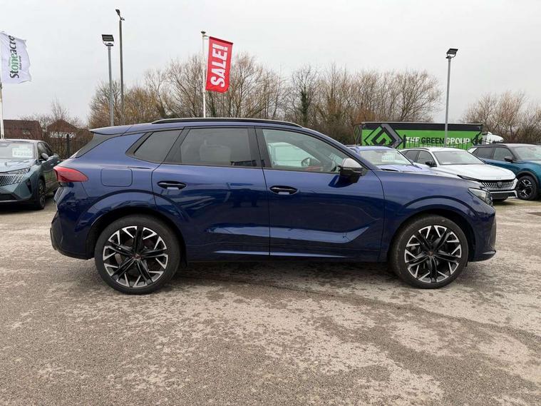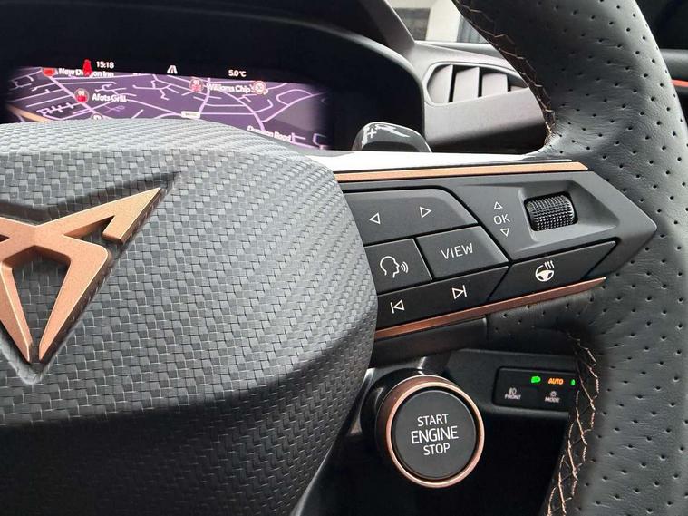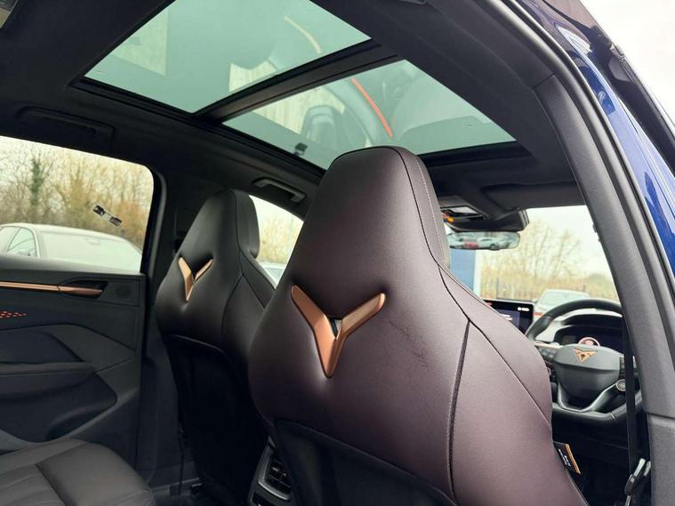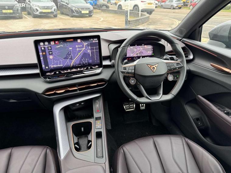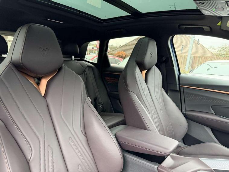 10.25" digital cockpit and configurable dashboard, Adaptive cruise control with follow-to-stop and speed limiter, Advanced driver alert system, Advanced lane assist with semi-automatic vehicle control in a medical emergency and traffic jam assist, Driving profile selection (DCC- Comfort, performance, CUPRA, Individual, Dynamic road sign display, E-call, Electric tailgate with virtual pedal, Emergency steering support with turn assist, Front and rear parking sensors, Front assist (Forward collision warning with automatic braking) with multifunction camera and front cross traffic assist, Head up Display, Intelligent park assist, Media system with Nav - 12.9" touch display, voice control, full link phone (wired/wireless), DAB and Steering wheel mounted controls, Rear traffic assist, Side and exit assist, Speed sensitive power steering, Start/stop system with regenerative braking, Top view camera (front camera, rear camera, 2 side cameras), Wireless phone charger, Adaptive chassis control with a 2-valve shock absorber, Auto dimming rear view mirror, Black roof rails, CUPRA 3D rear lights with ceremony & swiping indicator and illuminated logo, Dark tinted rear windows, Daytime running lights with automatic headlight control and Coming and Leaving home function, Door mirrors with memory function and lowing function on passenger mirror, Electric front/rear windows, Electrically adjustable, heated and folding door mirrors, Front fog lamps with cornering function, Heat reflecting windscreen, High beam assist, Rain sensing wipers, Rear fog light on one side, back up light on both sides, Rear side wing doors, Rear wash/wipe, Third brake light, Welcome lights (within exterior mirror housing), 3 seat bench in 2nd row, Black roof lining, Cupra sports pedals, Driver seat memory function, Electrically adjustable front seats including lumbar support, Four x USB Type C ports (2 in front and 2 in rear), Front and rear head restraints, Front and rear reading lights X 4, Front centre armrest, Heated front seats, Heated leather wrapped multi function sports steering wheel with tiptronic, Illuminated interior front door sills, Isofix, Leather upholstery, Operating voltage 12V, Single front passenger seat, Smart wraparound interior lighting, Sunvisors with illuminated mirror, Three zone climate control with control panel in rear, Unsplit rear seat bench, split folding backrest, with centre armrest, Variable luggage/load compartment floor, Pure performance pack - Terramar, 3 point seatbelts in front with pretensioner and electric height adjustment, 3 point seatbelts on all rear seats, Brake control system - ESC and brake booster, Child proof door locks, Driver and front passenger airbags, Electronic parking brake, Front and rear disc brakes, Front interaction airbag, Front passenger airbag deactivation switch, Front side airbags with curtain airbags, Pre-crash front and rear seat belt tensioner, window closure and hazard lights, Tyre pressure monitoring system, Visual and acoustic seat belt reminder, electric contact in front and rear, Anti theft alarm, Keyless locking and starting system with keyless access, Locking wheel bolts, Black decorative trims, Chrome interior detailing, Performance tyres in polmer coating, Tool kit,