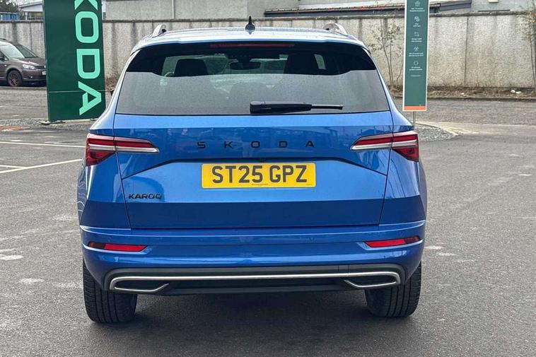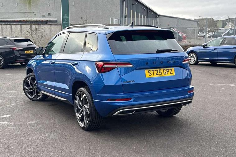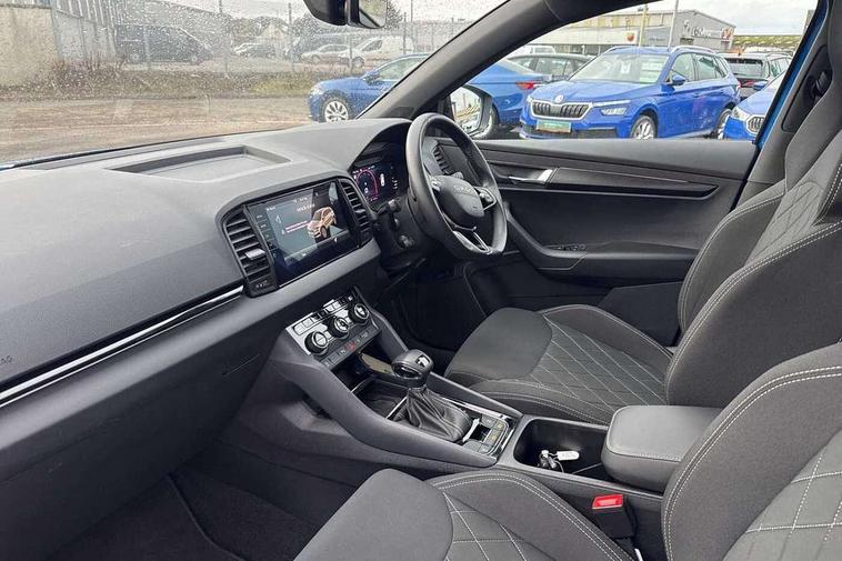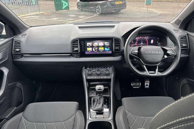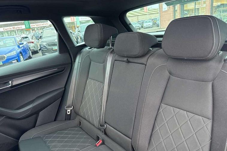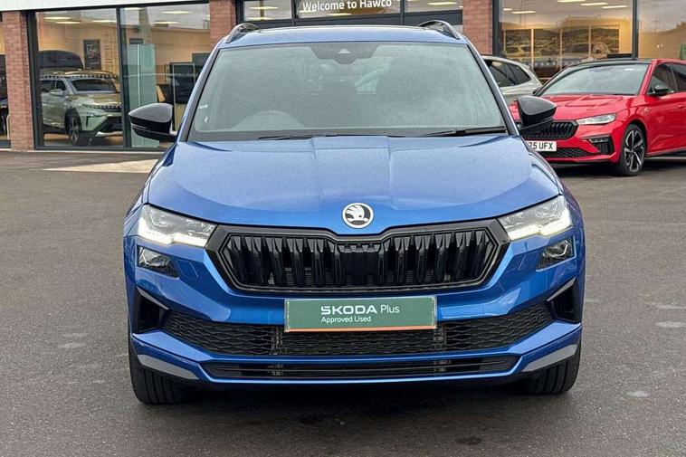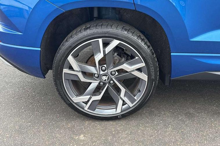 Advanced driver attention and drowsiness monitor, Emergency services call system, Outside temperature gauge, Sensor for driver assistance systems, Service interval indicator, SmartLink wireless for Apple and wired for Android, Start/stop system with regenerative braking, Traffic sign recognition, USB C Port x 2 in front centre console, Virtual Cockpit - 10.25" digital display, Virtual pedal with electrically operated boot door, Wireless smartphone charging, DAB radio with Bluetooth, USB connection, Acoustic glass, Aero front windscreen wipers with intermittent function, Auto dimming rear view mirror with light and rain sensors, Black door mirrors, Black electric window control buttons, Black radiator grille, Black roof rails, Body colour door handles, Electric front and rear windows with child proof lock, Extended rear roof spoiler, Front door steps with SportLine logo, Heated rear windscreen, LED daytime running lights, LED rear lights with high functionality welcome effect and dynamic indicators, Light assistant (coming/leaving home/tunnel light), Panoramic sliding sunroof, Plastic scuff plates in door apertures, Privacy glass, Protective door side sills in body colour, Rear diffuser, Rear side wing doors, Rear window wiper with washer system and intermittent control, Safety reflectors on front doors, Skoda lettering on tailgate in black, Sportline badge on front fender, Sports front and rear bumpers, Third brake light, Unique dark chrome design logo on alloy wheels, 1.5 litre bottle holders in driver and front passenger door panels, 12V socket in boot, 12v socket in front centre armrest with storage compartment and rear air vents, 2 x Tablet holder, 3 rear height adjustable headrests, 3 seat bench in 2nd row, 3 spoke sports leather heated multifunction steering wheel with DSG paddles, 4 foldable roof handles with rear coat hooks, Black floor carpet, Cargo elements in boot, Chrome inner door handles, Foldable hooks in the boot, Front head restraints, Height adjustable front three point seats belts with tensioners, Height/reach adjust steering wheel, Ice scraper, Illuminated glovebox, Illuminated luggage compartment, Isofix child seat preparation for front passenger seat, Isofix child seat preparation outer rear, Manual lumbar support for front seats, Pen holder, Pollen filter, Rear backrest release from boot, Rear boot cover, Rear package tray, Rear reading lights, Rear seats fixed folding and divided 60:40, Rubbish bin door, Safety vest holder, Single front passenger seat, Skoda lettering on steering wheel, Sportline decorative inserts, Storage box in upper central dashboard closed, Sunvisors with illuminated vanity mirrors, Textile floor mats, Ticket holder, Titan black interior ceiling, Umbrella under passenger seat, Under passenger seat storage compartment, Columbus pack - Karoq, LED Interior lighting pack with Skoda welcome logo - Karoq, Light Pack - Karoq, Non Smokers pack, Performance pack - Karoq, Winter plus pack with heated front and rear seats - Karoq, Automatic door unlocking in case of crash, Automatic fuel cut off in case of crash, Driver airbag, Electronic parking brake with auto hold function, Emergency rear braking signal, ESC (incl. ABS+MSR+ASR+EDS+HBA+DSR+RBS+MKB), Front side airbags, Head airbags, Hill hold control, Knee airbags, Passenger airbag with switch-off function, Pedestrian monitor, Seatbelt reminder signalisation and pretensioner for all seats, Three point seatbelts rear, Two tone horn, Tyre pressure monitor, Alarm with interior monitoring, back up horn and tilt sensor with safe function, Electronic engine immobiliser, Keyless entry and start/stop, Remote central locking with 2 remote folding keys, Black air vent surround, Black centre console, carbon door decor, Satin black dashboard, Satin black door trim, 19" Sagittarius anthracite alloy wheels, Anti-theft wheel bolts protection, Breakdown and tool kit,