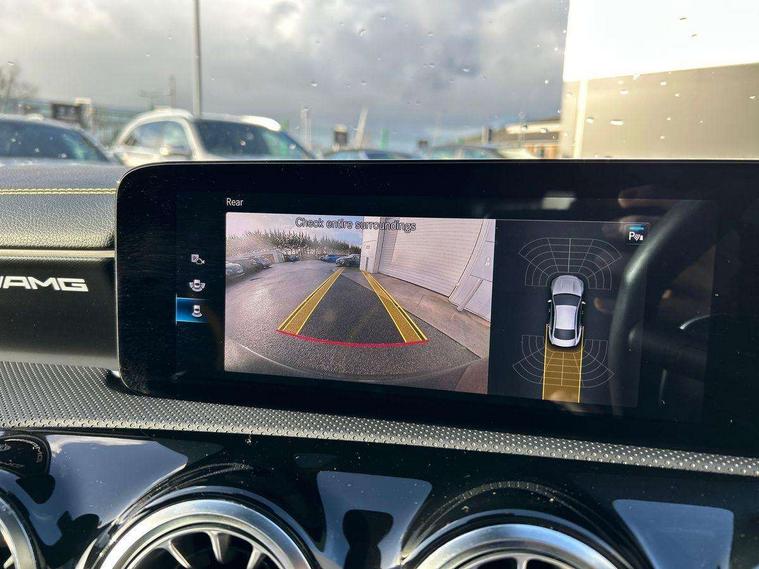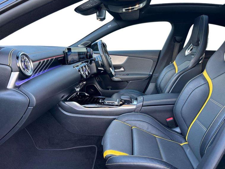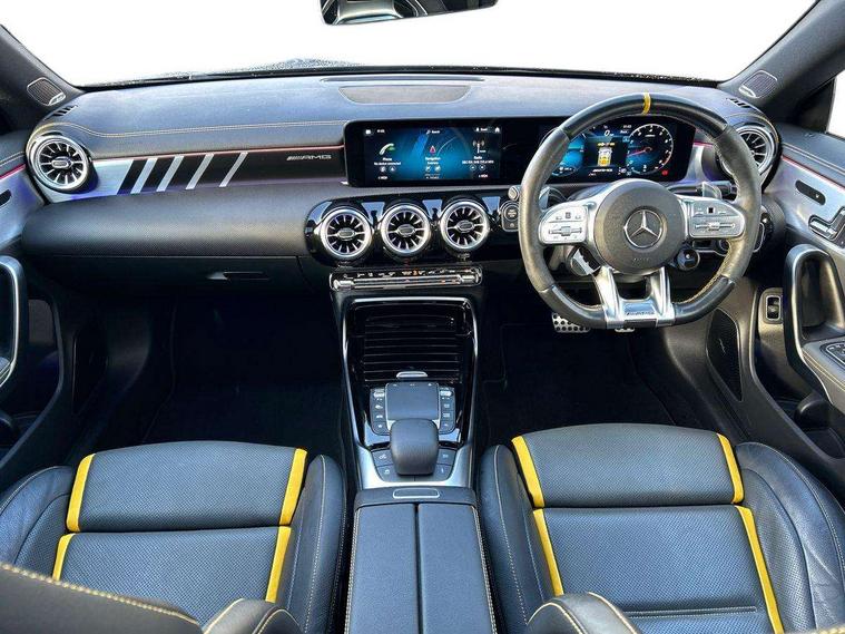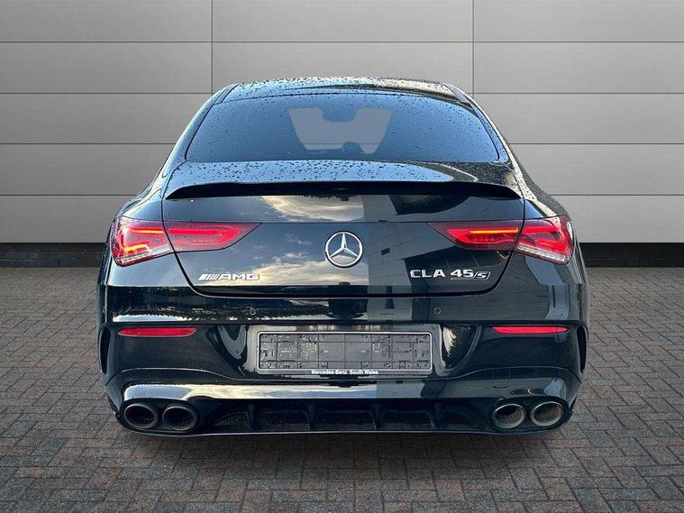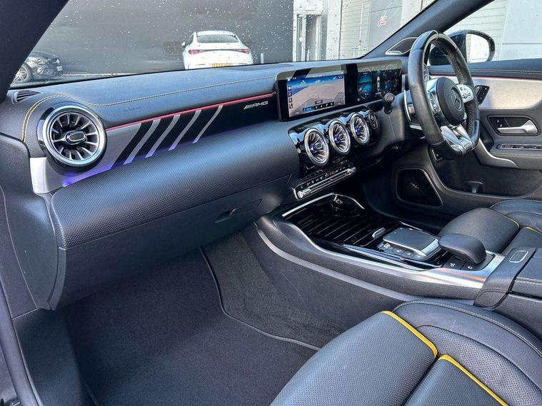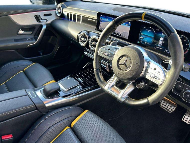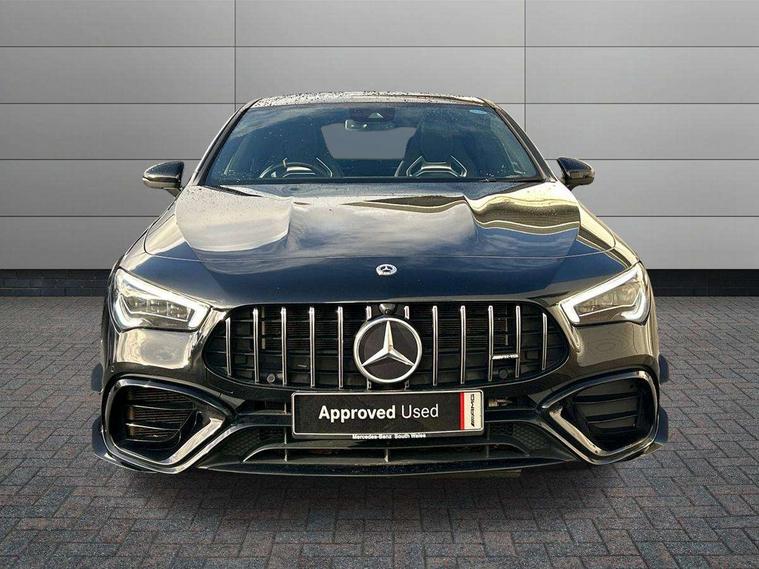10.25 inch Instrument display with digital cockpit, 10.25 inch touchscreen media display with AMG specific, AMG start up logo, visualisation of the AMG drive programs, vehicle and engine data, AMG drive unit, AMG DYNAMIC SELECT with drive programs Slippery, Comfort, Sport, Sport+, Individual and RACE including Drift mode activated + RACE START function, AMG menu with sporty additional information - Gear indicator with yellow M symbol manual mode, Warm Up menu and Set Up menu, Attention assist - Monitors steering behaviour and long journey fatigue, Bluetooth connection, Car wash mode, ECO start/stop function, Fluid level warning indicator for fuel, oil, coolant and washer fluid, Hard-disk navigation, Hey Mercedes Voice activation, Lamp failure indicator, Mercedes me connect including emergency call system, accident recovery, breakdown management and maintenance, Mercedes me remote services, Outside temperature gauge, Owners manual and service booklet in English, Pre-installation of private car share, Preinstallation for Mercedes Benz link, Radio aerial integrated into front and rear windshields, Service indicator (ASSYST), Smartphone integration with Apple CarPlay and Android auto, Traffic sign assist, Trip computer in multifunction display with current consumption indicator, AMG performance 4MATIC+ with torque control distribution, Rear axle multi-link, Suspension with adaptive damping system, DAB digital radio tuner, MBUX multimedia system with DAB digital radio and touchpad including satellite navigation, Mid-range sound system, USB (type C) ports (2) in stowage compartment and 1 in front of centre console, Adaptive brake lights, AMG body styling specific front apron, AMG side sill panels, AMG rear apron, AMG roof spoiler lip, Specific S labelling boot lid + front apron CLA 45, AMG specific radiator grille in high gloss chrome with AMG lettering, AMG specific radiator grille with a wider lower contour and twelve vertical louvres, AMG spoiler lip in body colour, AMG wider side skirts, Auto headlights, Automatically controlled exhaust flap, Beltline strips in High gloss Black, Body colour bumpers, Body colour door handles, Chrome weather strip, Diffuser with two vertical twin fins, Electric windows, Electrically adjustable and heated door mirrors with integrated LED indicators, Exhaust system with AMG Real Performance Sound (Balanced or Powerful settings), Front apron with horizontal fins in the outer air inlets and stretched lower air inlet, Headlamp assist automatic headlamp activation, Heated glass rear windscreen + timer control, High level LED third brake light, Integrated LED daytime running lights, Interior mirror with black reading lamps and frameless, LED tail lamp, Multibeam LED headlamps with adaptive highbeam assist plus, Privacy glass with dark tinting on rear side windows and rear window, Rain sensing windscreen wipers with two sensitivity settings, Rear boot, Rear fog lamp, Rear side wing doors, Two round twin tailpipe trim elements each measuring 90 mm in diameter and AMG lettering plus ribbing on the inside of the pipe, Valve control dependent on drive program, Window line trim strip in high gloss black, 3 seat bench in 2nd row, 3 spoke flattened lower sporty design AMG Performance steering wheel with Nappa/DINAMICA microfiber, grip area, 12 clock mark +AMG letter silver chrome, 40:20:40 split folding rear seats with backrest, Air conditioning - Two zone thermotronic luxury automatic climate control with display, Air vents with surround in silver chrome, AMG brushed stainless steel sports pedals with rubber studs, AMG centre console decidedly sporty with raised front section, AMG centre console finished with trim in silver chrome, AMG Performance sportily shaped seats with power adjustable front seats, special seat cushions + AMG badge backrests, AMG Steering wheel touch control buttons, Automatic child seat recognition sensor, Black roof lining, Fixed head restraints, Floor mats with stitched AMG lettering, Front centre armrest with stowage, Heated front seats, Illuminated front door sills with changeable cover, Illuminated glove compartment stowage, Interior lighting - 64 colour Ambient lighting, Manually height and reach adjustable steering column, Rear armrest with two integral cup holders for drinks, Silver coloured aluminium gear shift paddles on steering wheel, Single front passenger seat, Stowage compartment in centre console with retractable cover, Sunvisors with illuminated vanity mirrors, Touchpad on center console, Twin front cupholders, Two outer rear seat isofix and top tether child seat fixing points, Aerodynamics pack - CLA, AMG driver's package - CLA, AMG Multi contour seat pack - CLA, AMG Night package - CLA 35/45, AMG performance seat pack (High End) - CLA 45 S 4Matic+ Plus, Keyless go pack - CLA, Light and sight pack - CLA, Mirror pack - CLA, Parking package - CLA, Seat comfort pack - CLA, Active bonnet pedestrain safety measure which detects an impact and raises bonnet by 65mm, Adaptive brake assist with hold function and hill start assist, AMG high performance brake system with red painted brake callipers and black AMG lettering at the front, ventilated and perforated brake discs, Anti-lock braking system (ABS), Black seat belts, Bonnet with power domes, Brake pad wear warning indicator, Childproof locks manually operated for rear doors and electrically operated for rear power windows, Crash responsive emergency lighting, Driver and front passenger head and sidebags, Driver and front passenger windowbags, Drivers knee airbag, Dual stage driver and front passenger airbags, Electric parking brake, Electronic stability programme with acceleration skid control, ESP curve dynamic assist with 3 stage ESP, Front and rear seatbelt reminder, Front passenger seat occupancy sensor, Three point rear seat belts, Tyre pressure monitoring system, Warning triangle and first aid kit, Remote central locking and crash sensor with emergency opening function, Urban guar