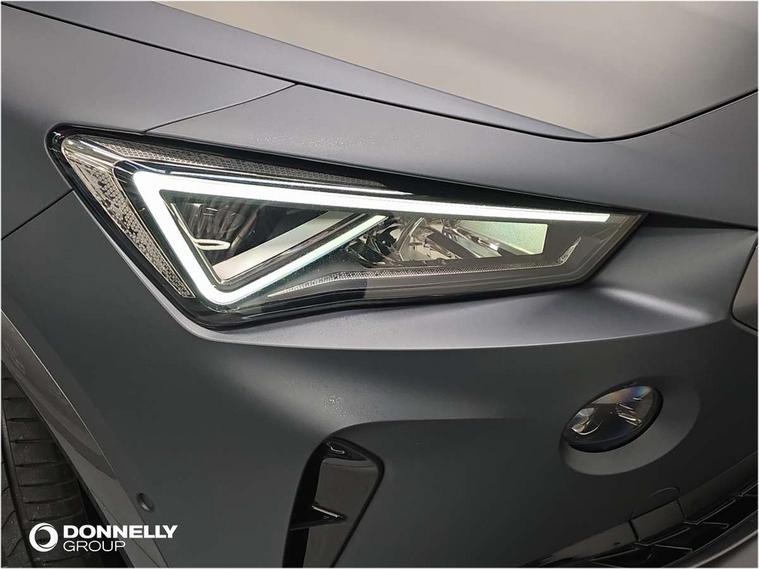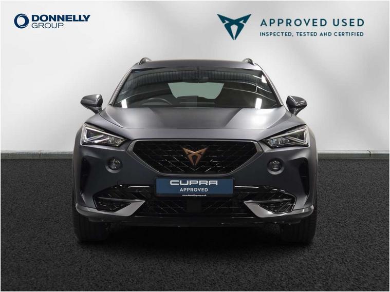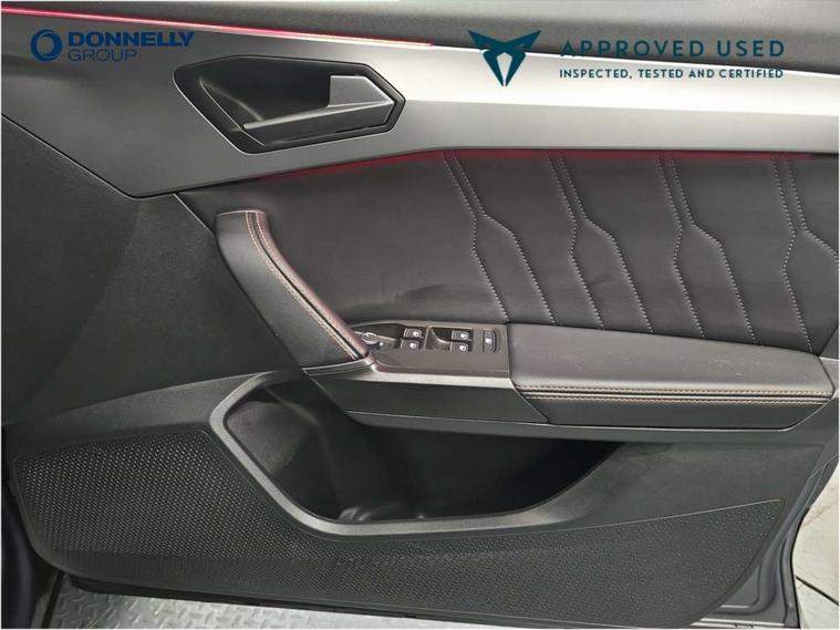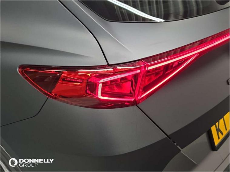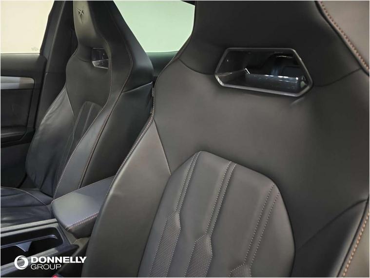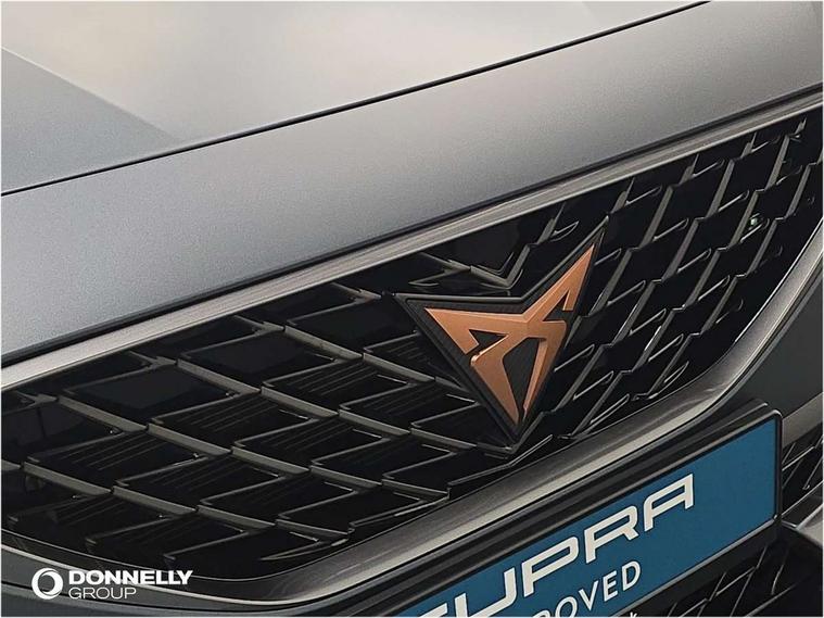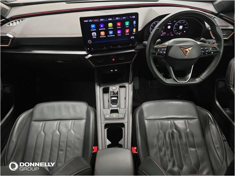 Digital cockpit and configurable dashboard, Driver alert system, Driving profile selection, Forward collision warning with automatic braking, Lane assist, Navigation system with 12'' Touchscreen Display, Park assist (inc front/rear parking sensors), PAS, Predictive adaptive cruise control with speed limiter, Rear view camera, RPM, trip computer, outside temp gauge, instrument light brightness, low fuel warning light, lights on reminder, gearshift indicator, Service interval indicator, Start/stop system with regenerative braking, Voice control system, Wireless apple carplay, Wireless phone charger, Electronic locking differential and dynamic traction support, Standard suspension, 2 front and 2 rear USB type C sockets, Auxiliary input socket, DAB radio, Auto dimming rear view mirror, Body colour door handles, Body coloured bumpers, Dark grey wing mirror, Daytime running light with automatic headlight control and coming home feature, Dynamic headlight range control, Electric front/rear windows, Electrically adjustable heated and folding door mirrors with memory function, Front fog lamps with cornering function, Gloss black roof rails and window surrounds, LED Headlights, LED Taillights with dynamic indicator, Rain sensing wipers, Rear diffuser with black simulated exhaust pipes, Rear side wing doors, Rear wash/wipe, Third brake light, Tinted rear windows, Welcome lights, 12v power supply in centre console, 12V socket, 12v socket in loadspace, 2 front and 2 rear reading lights, 230V socket, 3 seat bench in 2nd row, 60/40 split rear bench seat with armrest and mechanical seat release, Black headlining, Dust/pollen filter, Front and rear head restraints, Front centre armrest, Height/reach adjust steering wheel, Illuminated interior front door sills, Illuminated sunvisor with mirror, Isofix, Leather multi function heated steering wheel with gear shift paddles, Luggage tie-down hooks, Single front passenger seat, Three zone climate control with control panel in rear, Variable luggage/load compartment floor, Wraparound lighting, Genuine Nappa leather Pack - Cupra, 3 point seatbelts on all rear seats, ABS, Brake control system - ESC and brake booster, Child proof door locks, Driver and front passenger airbags with front passenger airbag de-activation, Electronic parking brake, Front and rear disc brakes, Front side curtain airbags, Hill hold control, Public e-call, Seat belt reminder for front and rear seats, Tyre pressure monitoring system, Anti theft alarm system, Keyless entry and start system (KESSY), Locking wheel bolts, Copper and aluminium interior detailing, 19" 'Exclusive' machined sport matte black and silver alloy wheels,