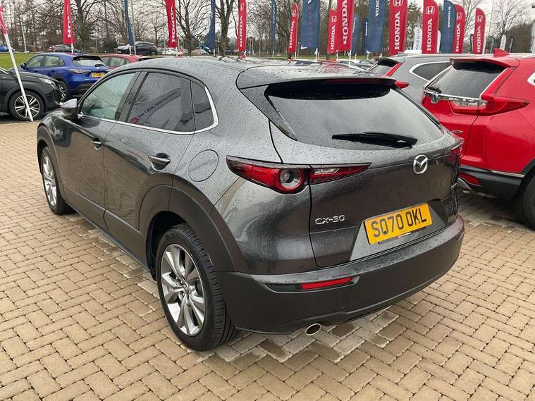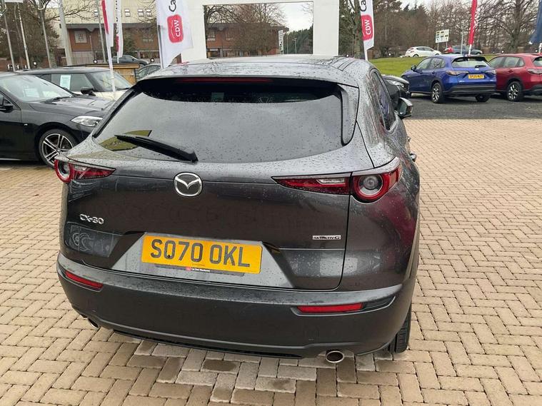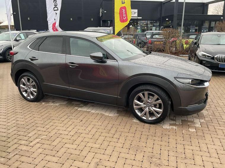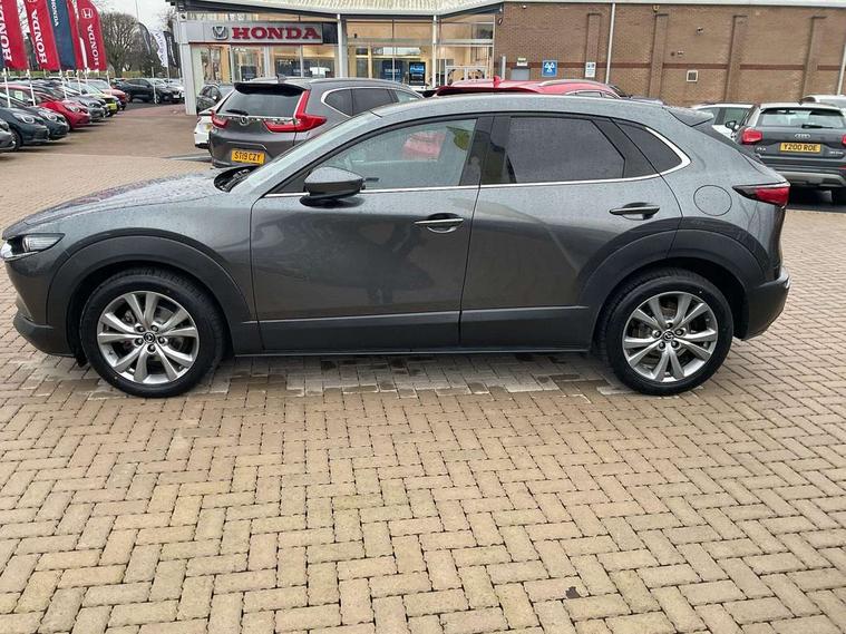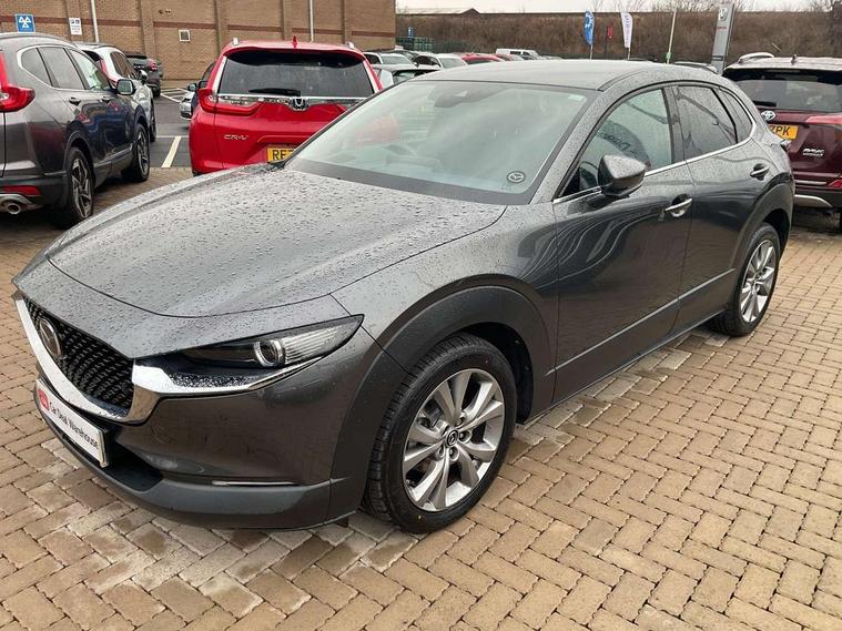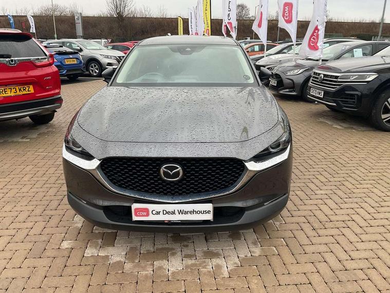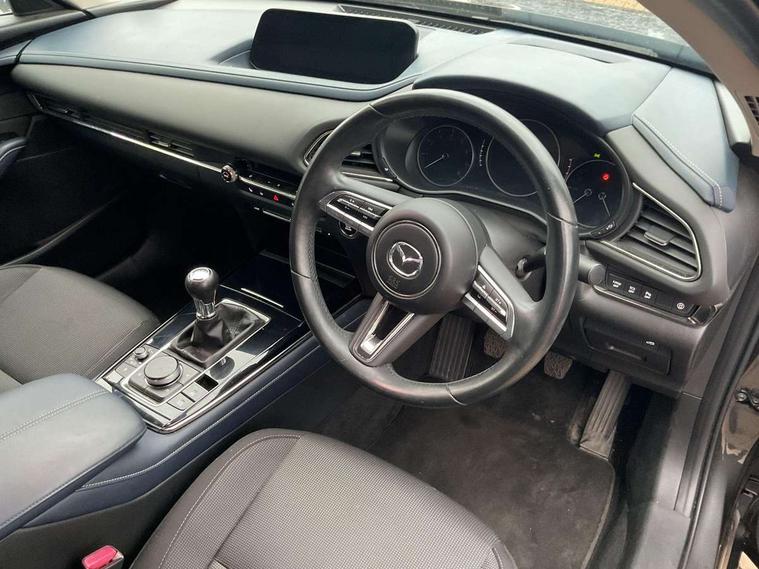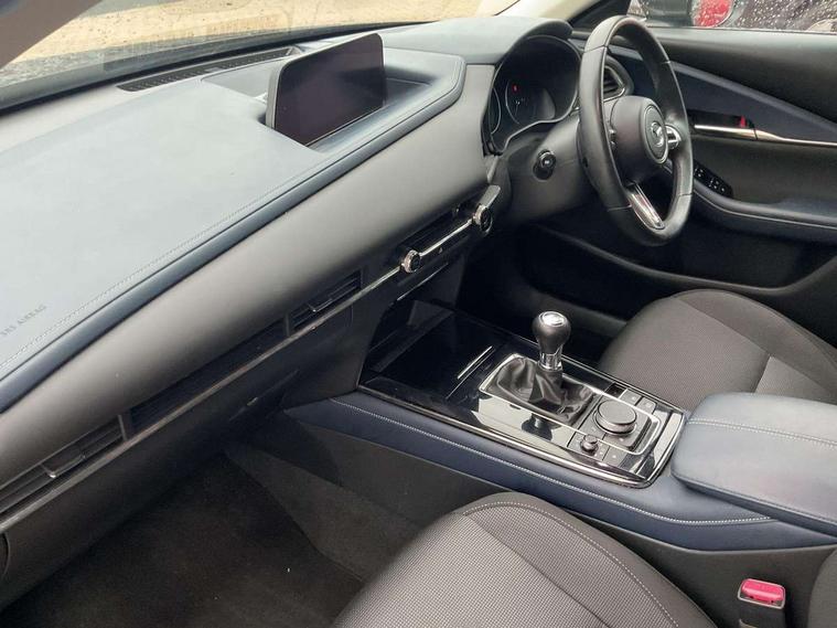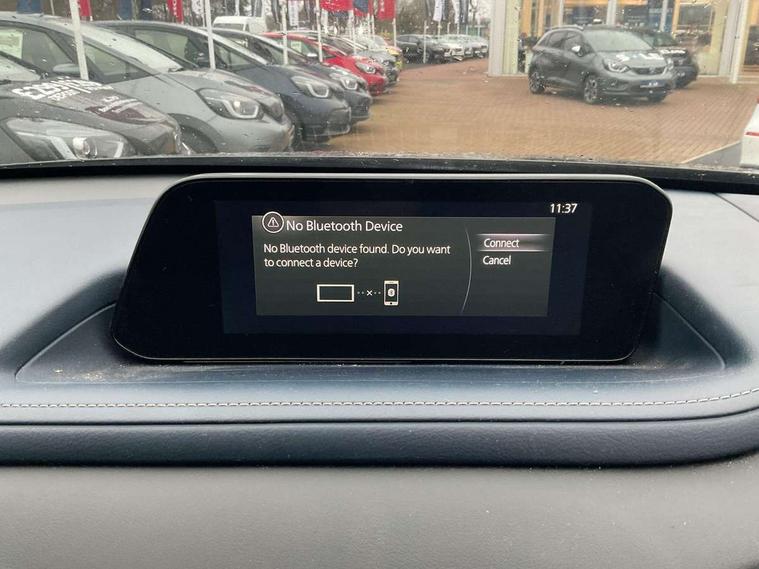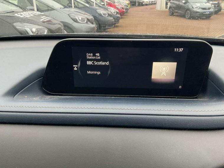 7" TFT Colour driver instrument panel display, 8.8" Colour centre touch screen display with Mazda Connect infotainment, Adaptive cruise control (Mazda radar cruise control) features stop and go, Apple car play/Android Auto, Blind spot monitoring with rear cross traffic alert, Driver attention alert system, E-call with GPS, Emergency stop signalling system, Engine start/stop button, Front and rear parking sensors, Integrated bluetooth, Integrated Mazda navigation system, Intelligent speed assist, Lane keep assist system (LAS) with Lane departure warning system (LDWS), PAS, Power lift gate, Reversing camera, Service indicator, Trip computer, Window projected colour active driving display (head up display) with traffic sign recognition, Cylinder Deactivation, i-stop, 2 USB charging ports, AM / FM / DAB radio with 8 speakers, CD player, Multimedia Commander including separate volume dial, Steering wheel mounted audio/bluetooth controls, Adaptive LED Headlights, Auto dimming driver's door mirror, B-pillar and C-pillar garnishes in gloss black finish, Body coloured, electrically adjustable, heated auto power folding door mirrors with integrated indicators, Coming/leaving home lighting function, Dual chrome exhaust, Dusk sensing headlights, Electric front/rear windows with one touch auto up/down, Frameless auto dimming interior rear view mirror, Front kodo turn signal, Gloss black front grille, Gloss black rear roof spoiler, High beam assist, LED headlamps with auto levelling, Privacy glass (rear side windows and rear screen), Rain sensing front wipers with adjustable speed and intermittent wipe, Rear fog lights, Rear wiper, Signature front LED daytime running lights, Signature LED rear combination lights with LED rear turn lights, 12V power outlet in centre console, 60/40 split fold down rear seats, Chrome horn pad ring, Cloth door panel inserts, Cloth upholstery with interior accents, Dashboard, door cards and front centre armrest in navy blue cloth, Driver and front passenger visors with covered vanity mirror and driver ticket holder, Driver seat manual slide, recline and height adjust, Driver, Front passenger and two rear grab handles with coathooks, Dual zone climate control air conditioning with rear air vents, Folding rear centre armrest with two cup holders, Front and rear (x3) head restraints, Front and rear door pockets, Front and rear LED lighting, Front armrest, Front centre storage with two cupholders, Front passengers seat manual slide, recline and height adjustment, Gear shift indicator, Glovebox illumination, Heated front seats with 3 stage setting, ISOFIX child seat anchorage points attached on outer rear seats, Leather wrapped gear shift knob, Leather wrapped steering wheel with telescopic and tilt adjustment, Luggage compartment light, Rear passenger seat map pockets, Roof mounted sunglasses holder, 3 point ELR front seat belts x2 with pretensioners, 3 point ELR rear seat belts, Anti-lock braking system (ABS), Driver/Front Passenger airbags, Drivers knee airbag, DSC - Dynamic Stability Control, Electronic parking brake with auto disengage function and auto hold function, Front and rear curtain airbags, Front passenger airbag cut-off switch, Front side airbags, Front smart city brake support, G-Vectoring control plus, Hill launch assist, Mild Hybrid system with regenerative braking, Seatbelt reminder for driver/front passenger and rear seats, Traction control system (TCS), Tyre pressure monitoring system (TPMS), Remote central locking with deadlocking and automatic door lock when driving, Smart keyless entry, Thatcham accredited alarm and immobiliser, 18" Silver metallic alloy wheels, Emergency tyre repair kit,