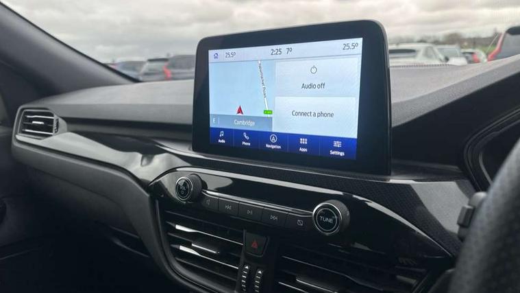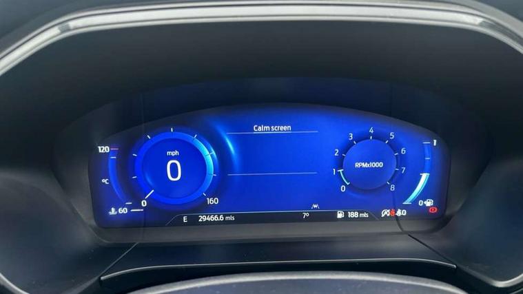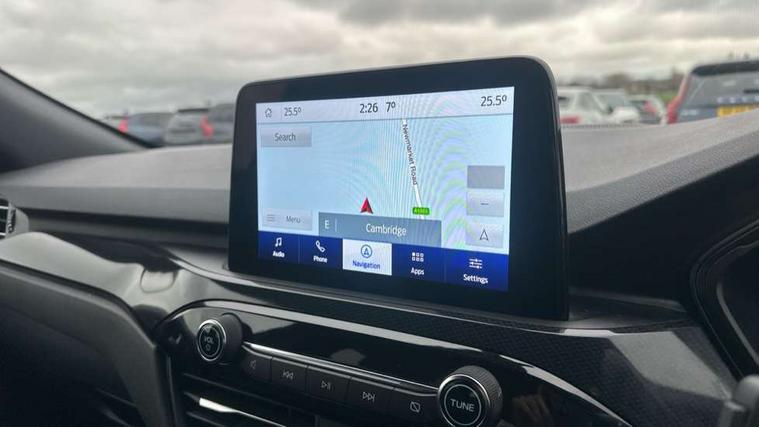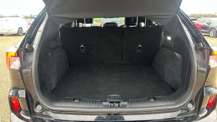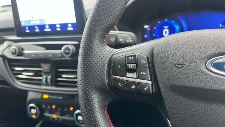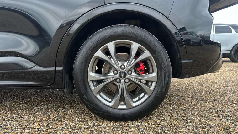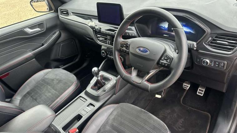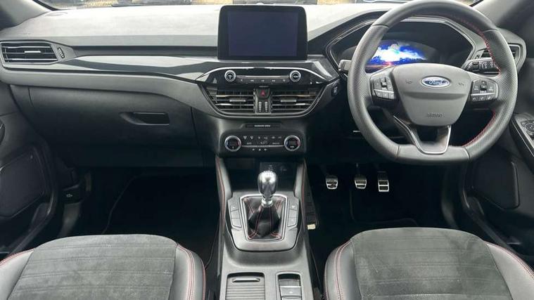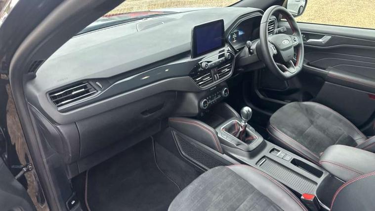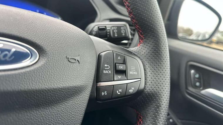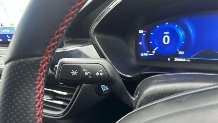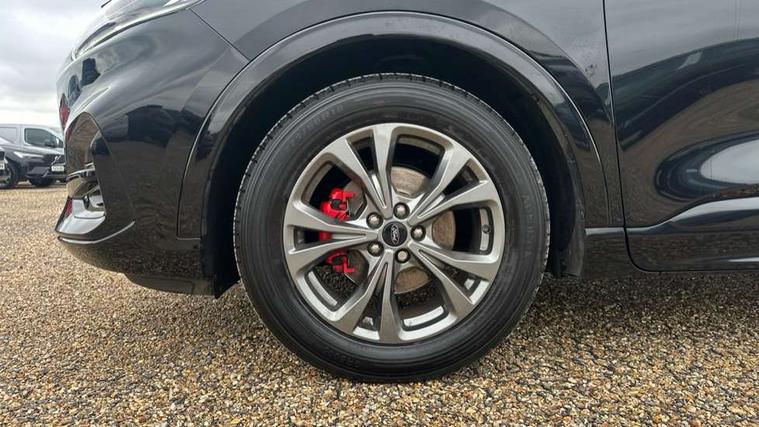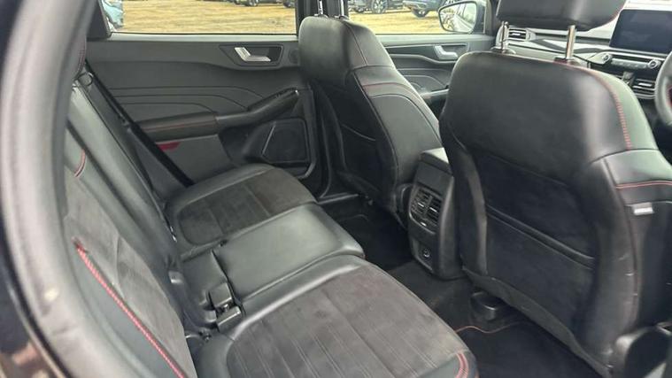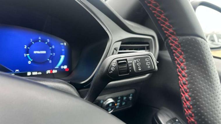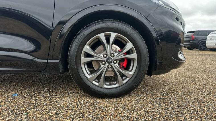 12.3" digital colour instrument cluster, Ford easy fuel, Ford SYNC 3 with 8" TFT LCD touchscreen, App Link, andriod auto/apple carPlay, emergency assistance and navigation with Ford pass connect, Front and rear parking sensors, Hands free power tailgate, Lane keeping aid with lane departure warning, Power assist steering, Rear view camera, Selectable drive modes, Service interval indicator, Sports suspension, Twist beam rear suspension, B&O premium audio system with 10 speakers and subwoofer, 2 USB ports, DAB radio/CD, Auto headlamps with high and low beam, Black roof rails, Day/night rear view mirror, Front LED fog lamps, Large rear spoiler, LED daytime running lights, LED rear lights, Power folding heated door mirrors with puddle lights, Power front/rear windows with global close, Privacy glass, Quickclear heated windscreen, Rear side wing doors, Rear wiper, ST Line body styling kit with unique front and rear fascia and bumper, rear painted diffuser, front painted skid plates, dark mesh upper grille, ST Line front scuff plates, Third brake light, Twin exhausts, 10 way power adjustable drivers seat, 2nd row sliding seats with 60:40 split, 8 way manual passenger seat including lumbar support and height adjust, Alloy pedals, Centre console with electronic parking brake, Dark headlining and pillars, Dual electronic automatic temperature control, Flat bottomed leather steering wheel in sensico with red stitching, Front and rear head restraints, Partial premium touch sensico leather upholstery with black cloth inserts and red stitching, Rear charging point, Single front passenger seat, Sports seats, ST Line front and rear floor mats, ST Line gear knob, 3x3 point rear seatbelts, Airbags - front driver/passenger, front and rear curtain, Drivers knee airbag, Electronic stability control (ESC) and ABS, Ford MyKey Gen 2 safety system, Manual child proof rear door locks, Post collision braking, Pre collision assist with autonomous emergency braking, Rear seat Occupancy alert, Red brake calipers, Tyre pressure monitoring system, Engine immobiliser, Keyless entry and Ford power start button (Keyless start), Locking wheel nuts, Remote powered central double locking doors, Thatcham category 1 alarm,
