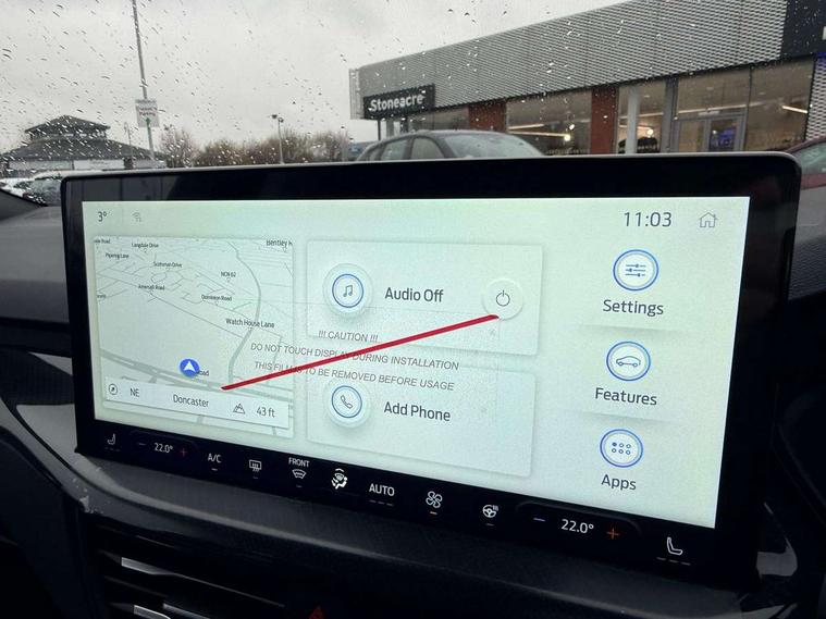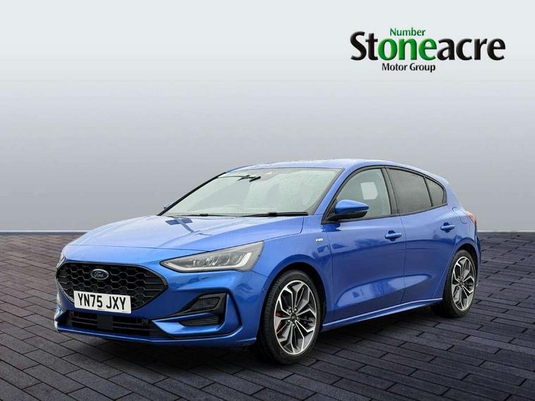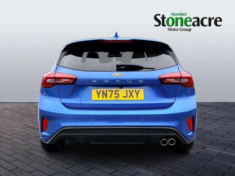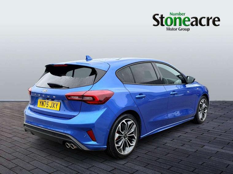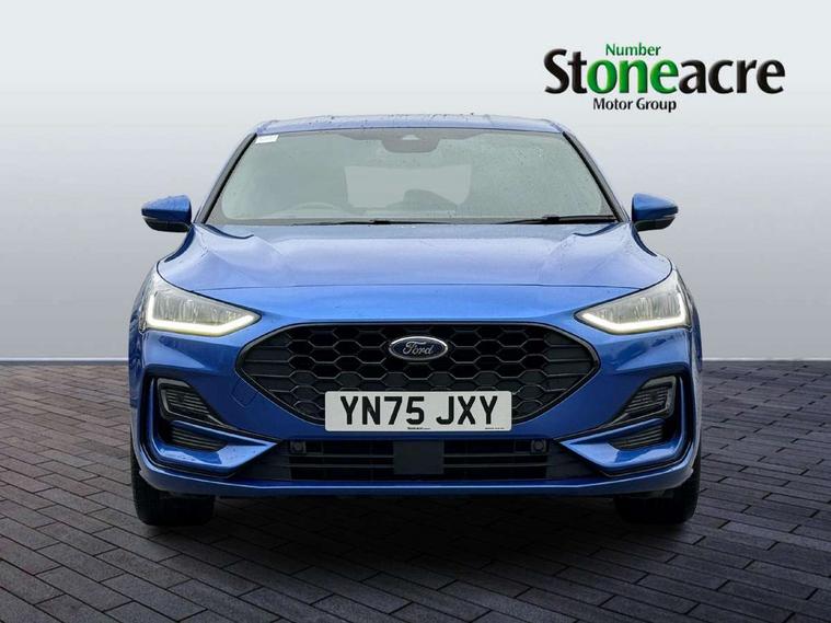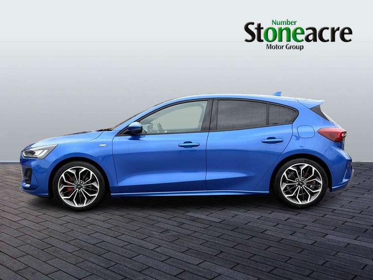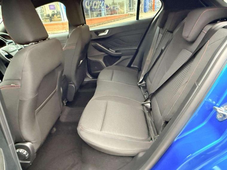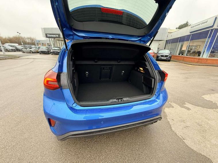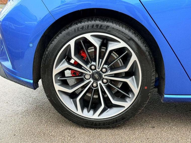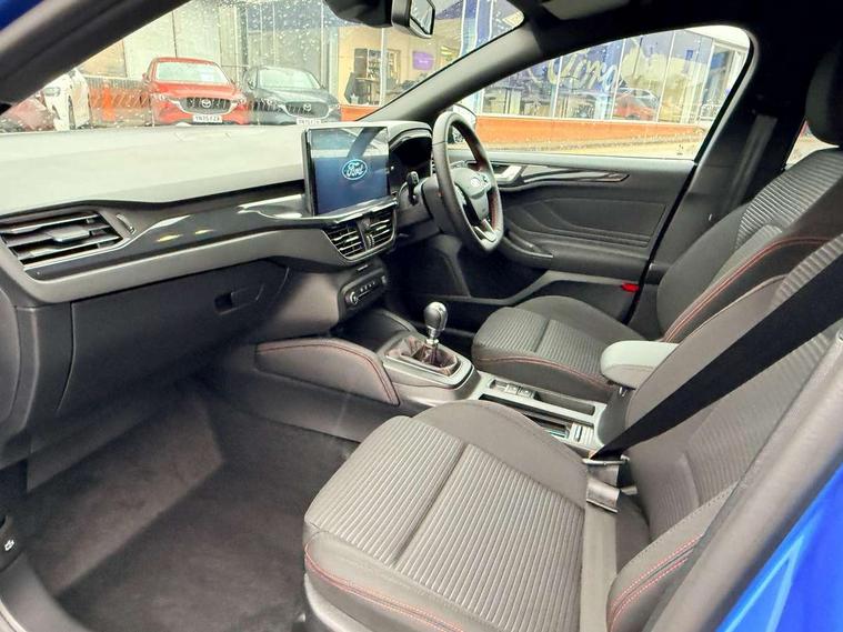 12.3" Digital instrument cluster, Bluetooth system, Digital clock, Easy fuel capless refuelling system, Eco mode, Ford SYNC4 Nav with 13.2'' touchscreen, DAB, Emergency Assistance, Apple Carplay & Android Auto, B&O Premium Audio with 10 speakers, FordPass Connect, Lane keeping system - lane keeping alert and lane keeping aid, PAS, Rev counter, Selectable drive mode, Service interval indicator, Trip computer, Wireless charging pad, Sports tuned suspension, 2 USB ports, Auto headlamps (on/off), Body coloured door handles, Electrically operated front and rear windows with one touch opening and closing, Electrically operated heated power fold door mirrors with puddle lamp with side indicators, Front variable intermittent wipers with electric wash, Heated rear window, LED daytime running lamp, LED rear lamps, LED third brake light, Polished twin tailpipe, Privacy glass, Quickclear heated windscreen, Rain sensor, Rear side wing doors, Tailgate wash/wipe, Unique ST-Line grille, full bodystyling kit, and large body coloured rear roof spoiler, 3 rear headrests, 3 seat bench in 2nd row, Dual zone electronic air temperature control, Full sensico premium upholstery, Height adjustable front headrests, Isofix child seat preparation, Load through ski hatch, Manual 2-way passenger seat adjust, Power 4-way driver seat adjust, with power lumbar adjust, Reach + rake adjustable steering column, Single front passenger seat, ST-Line Design pack - Focus, Winter pack - Focus, 3x3 point rear seatbelts, ABS+Electronic Brake force Distribution, Auto hold function, Driver airbag, EDL traction control, Electronic parking brake, Electronic stability control, Front and rear seatbelt reminder, Front inertia reel height adjustable seatbelts with pre-tensioners, Front passenger airbag, Front side airbags, Passenger airbag deactivate switch, Post collision braking, Pre collision assist with autonomous emergency braking and pedestrian/cyclist detection, Remote/power child rear door locks, Side curtain airbags, Three rear inertia reel lap/diagonal seatbelts, Tyre pressure monitoring system, Keyless entry and keyless start, MyKey system, Remote central locking & engine immobiliser, Thatcham alarm with power door dead locks, 18" 5x3 spoke pearl grey high gloss machined finish alloy wheels with mini spare wheel,