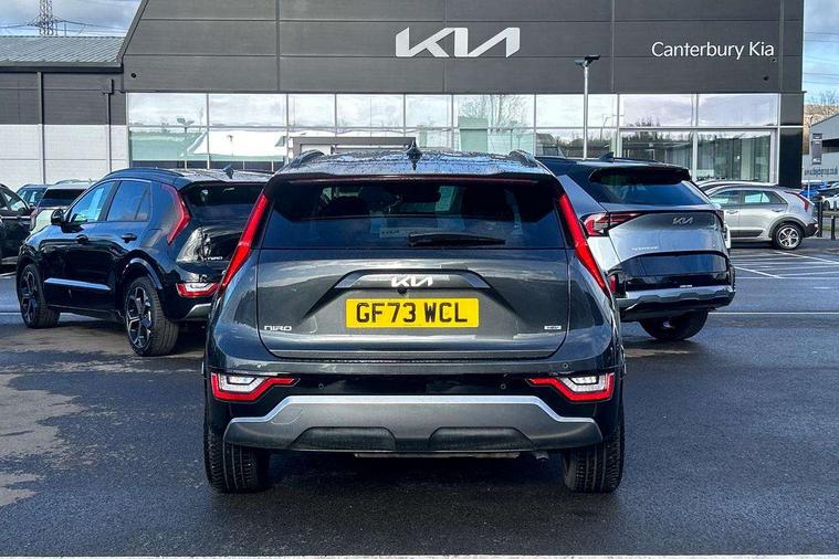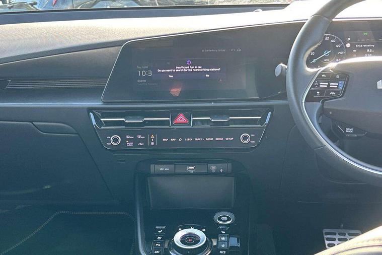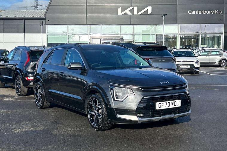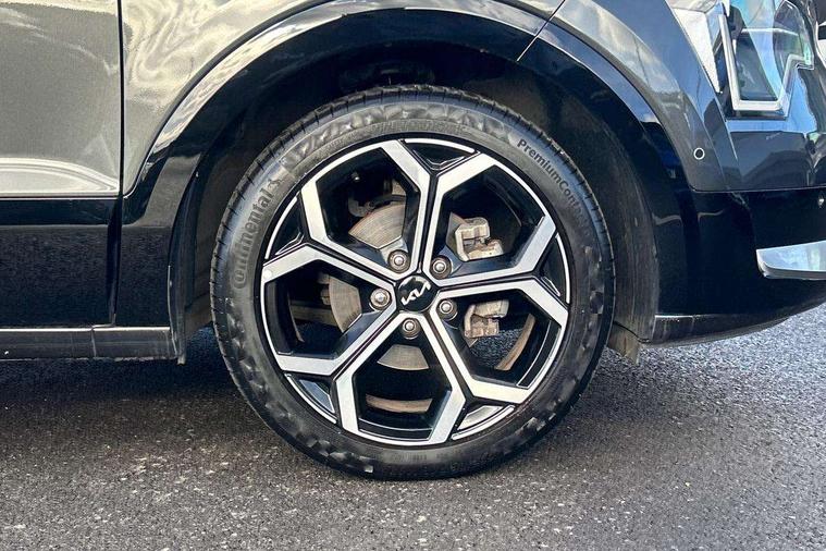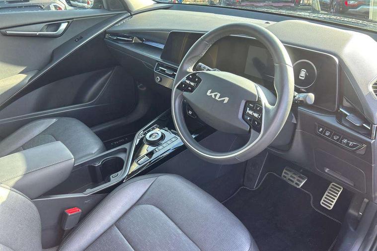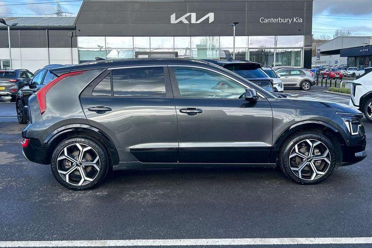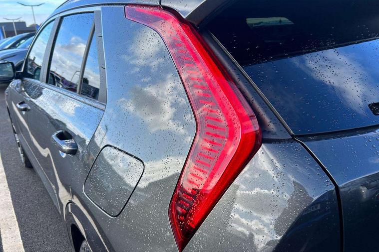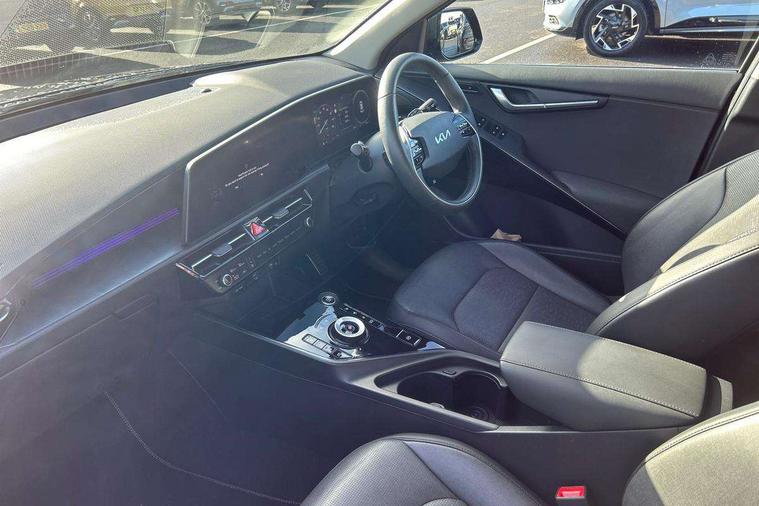 10.25" Supervision colour cluster display, 10.25" touchscreen satellite navigation, Adaptive smart cruise control function (SCC) with stop and go, Apple car play/Android Auto with voice control, Blind spot collision avoidance assist, Drive mode select (Eco, sport), E-call, Emergency stop signalling system, Forward Collision-Avoidance Assist (FCA) 1.5 - City/Pedestrian/Cyclist/Junction turning, Front parking sensors, Head up Display, Highway Driving Assist (HDA), Kia Connect (UVO), Lane Following Assist (LFA), Lane keep assist, Motor driven power steering, Parking collision avoidance assist (PCA), Power opening/closing tailgate, Rear cross traffic alert, Rear parking sensors, Remote smart parking assist, Reversing camera with dynamic guide lines, Safe exit warning (SEW), Speed limit assist, Trip computer with distance/fuel consumption/average speed, Wireless Smartphone charger, 220v AC Inverter, 'Shark fin' mobile antenna, 2 Front USB Charge port (one for C-type/one for USB), 2 type C USB ports on front seats, 6 speakers, Bluetooth with music streaming, DAB Digital radio, Steering wheel mounted controls, Acoustic windshield, All round electric windows with drivers and front passenger auto up/down and safety function, Auto dimming rear view mirror, Automatic defog system, Automatic headlight control system, Black grille with chrome surround, Body colour bumpers, Body colour exterior door handles, Deluxe door scuff plates, Dual LED headlights (low and high projection), Electric heated door mirrors, Electrically folding door mirrors, Front and rear chrome skid plates, Front fog lights, Heated rear window with timer, High gloss black cladding, High gloss black door mirrors, LED daytime running lights, LED rear combination lights, LED third brake light, One touch single tilting/sliding power sunroof, Privacy glass - Rear windows and tailgate, Rain sensing front wipers, Rear fog lights, Rear side wing doors, Rear spoiler, Rear wiper, Roof rails, Solar glass windscreen, Welcome and follow-me home light functionality, Windscreen Washer Level Warning, 12V socket in front, 12V socket in luggage compartment, 3 seat bench in 2nd row, 60:40 split remote folding rear seats, All-round height adjustable headrests, Aluminium pedals, Artificial leather centre console storage box, Artificial leather steering wheel, Centre console cupholder, Chrome coating interior door handles, Driver and front passenger power adjusted seat, Driver power adjusted memory seat, Driver/passenger sunvisors with illuminated vanity mirrors, Drivers seat power lumbar support, Dual zone automatic air conditioning, Front and rear door storage, Heated front seats, Heated outer rear seats, Heated steering wheel, Illuminated glovebox, Interior door lock/unlock function, ISOFIX Child seat top tethers and anchor fixings, LED overhead console, 2nd row and luggage lamp, Luggage area load cover, Luggage board, Paddle shifts, Passenger premium relaxation seat, Power adjustable lumbar support on front passenger seat, Rear armrest, Seatback pocket - driver, Seatback pocket - front passenger, Shift by wire SBW, Single front passenger seat, Tilt/telescopic adjustable steering wheel, Vegan leather upholstery, Ventilated front seats, Ventiliation ducts to rear compartment, Towing pack - Niro, 3 point seatbelts on all seats, ABS, Automatic unlocking of doors in case of impact, Centre side front airbags, Curtain and side airbags, Drivers knee airbag, Dual shell horn, Electric parking brake with auto hold function, Electronic stability control, Front passenger airbag deactivation, Height adjustable front seatbelts, Hill start assist control (HAC), Manual rear child locks, Rear seat alert system, Traction control, Tyre pressure monitoring system, Alarm system and engine immobiliser, Deadlocks, Engine Start/Stop Button with Smart Entry System, Locking wheel nuts, Visible vehicle identification number, Warranty - 7 Years/ 100, 000 miles, Centre fascia chopped carbon, 18" Alloy wheels, Tyre mobility kit,
