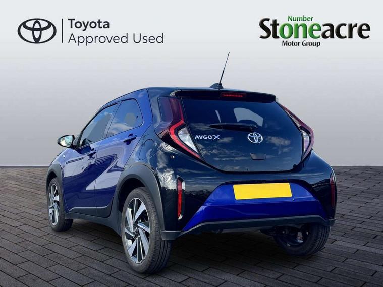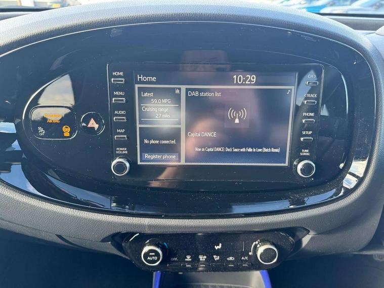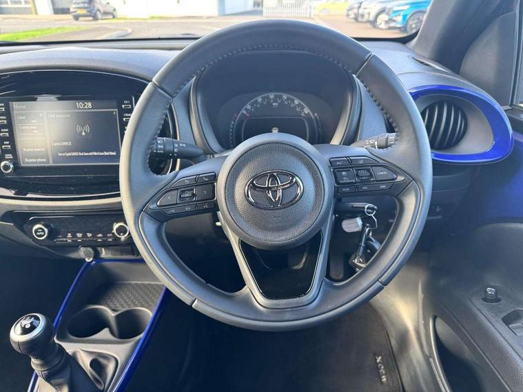 4.2" TFT colour screen, Adjustable speed limiter, Analogue speedometer, Bluetooth connectivity, Digital tachograph, Driver attention alert system, eCall emergency call system, Electric power steering, Intersection turn assist, Key reminder warning, Noise reduction kit, Pre collision system with emergency steering assist, Reversing camera with static guide lines, Smart phone integration with Apple car play/Android Auto, Speed limit display, Start and stop, Vehicle Stability Control (VSC), 4 speakers, 9" HD multimedia display touch screen with Toyota smart connect, DAB digital audio broadcast, USB connector, Auto headlights, Auto wipers, Automatic headlights cut-off, Bicycle towing hook, Black contrast roof, Black side protection mouldings, Black wheel arch mouldings, Body colour door handles, Body coloured front bumper, Boot door scuff plate, Eclipse black rear bumper, Electric heated door mirrors, Follow me home headlights, Front fog lights, Front power windows, Gloss black door mirrors, Gloss black upper front grille, Headlight cut-off reminder, LED daytime running lights, LED front light guide, LED High mounted stop lamp, Manual day/night rear view mirror, Manual headlight levelling, Pagoda roof, Power adjustable door mirrors, Power back door, Privacy glass, Projector halogen headlights, Rain sensor, Rear combination lights LED bulb type, Rear side wing doors, Rear windscreen defogger, Rear windscreen wiper, Short antenna, Variable intermittent windscreen wipers, 12v power outlet - front, 2 seat bench in 2nd row, 3 spoke leather steering wheel, 50/50 split folding rear seat, Adhesive roof headlining, Adjustable speed limiter switch on steering wheel, Audio and telephone switches on steering wheel, Auto air conditioning, Black insert on steering wheel, Black roof lining, Boot light, Centre room light, Chrome interior door handles, Chrome surround on air conditioning buttons, Clean air filter, Console box storage in body color, Fabric upholstery, Floor mats, Front and rear cup holders, Front head rest deco art, Front head restraints, Height adjustable driver seat, Intelligent adaptive cruise control switch on steering wheel, ISOFIX child restraint system on rear seats, Lane departure alert switch on steering wheel, Leather gearshift knob, Manual tilt steering wheel, Manually reclining and sliding driver seat, Manually reclining and sliding front passenger seat, Multimedia switches on steering wheel, Pollen filter, Rear door pockets, Rear head restraints, Satin silver insert on gear shift knob, Single compartment glovebox with lights, Single front passenger seat, Soft tonneau cover, Sun visors with mirror on driver and passenger side, Voice recognition switch on steering wheel, Toyota safety sense pack - Aygo X, Anti lock braking system + Electronic brake force distribution, Child safety door lock, Emergency brake light signal (EBS), Hill start assist control (HAC), Passenger airbag on/off switch, Seat belt reminder for front and rear seats, Supplement restraints system (SRS) - 6 airbags, Traction control, Tyre pressure warning system, Immobiliser, Remote power door locks, Black wheel centre caps, Tyre repair kit,