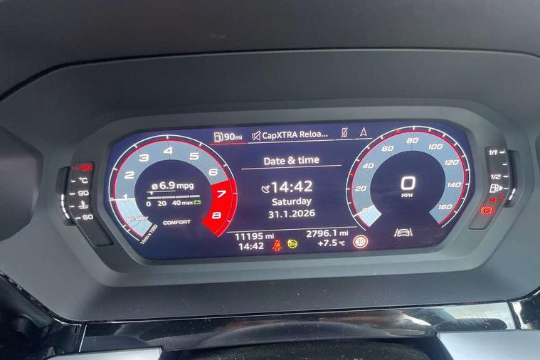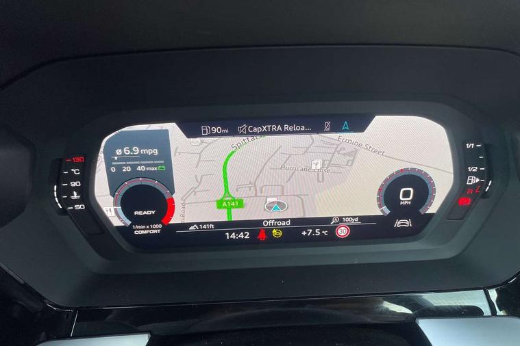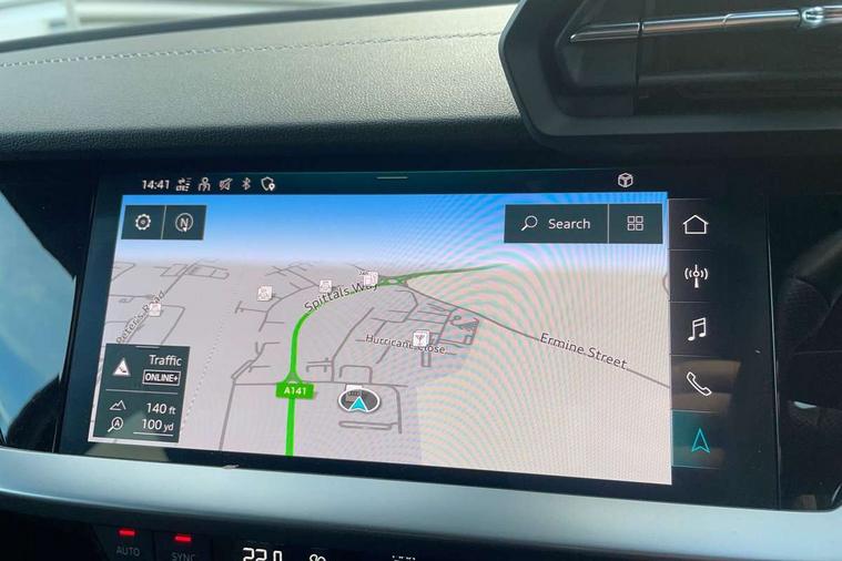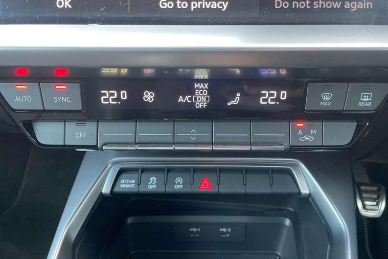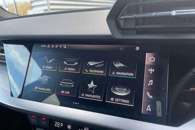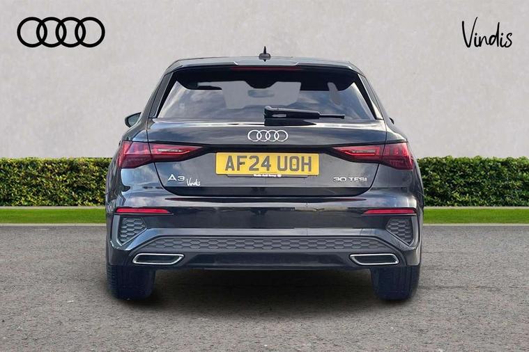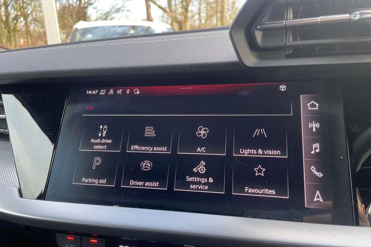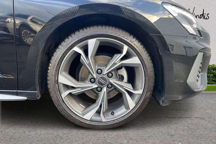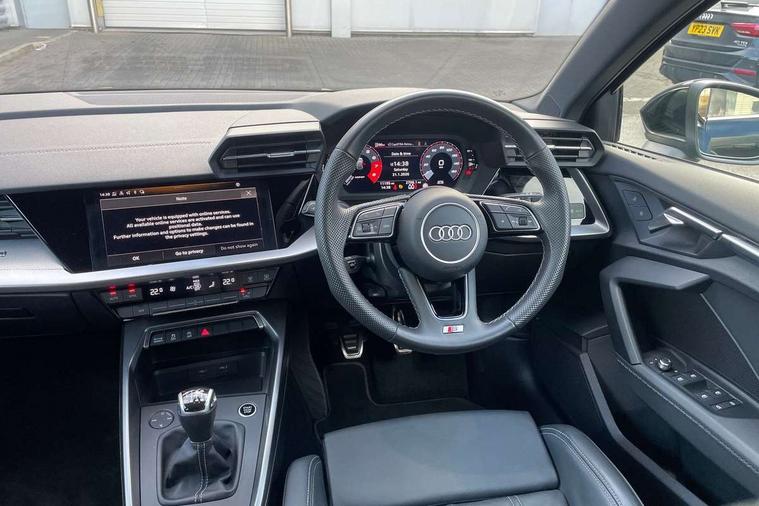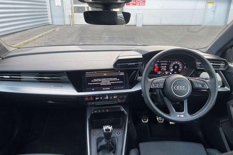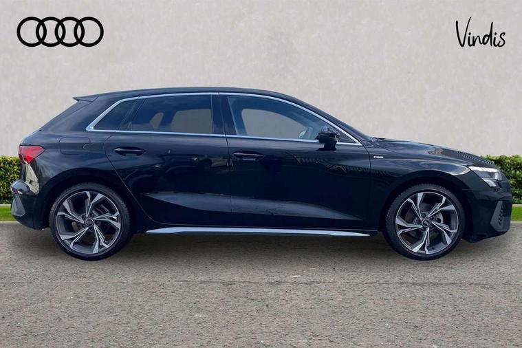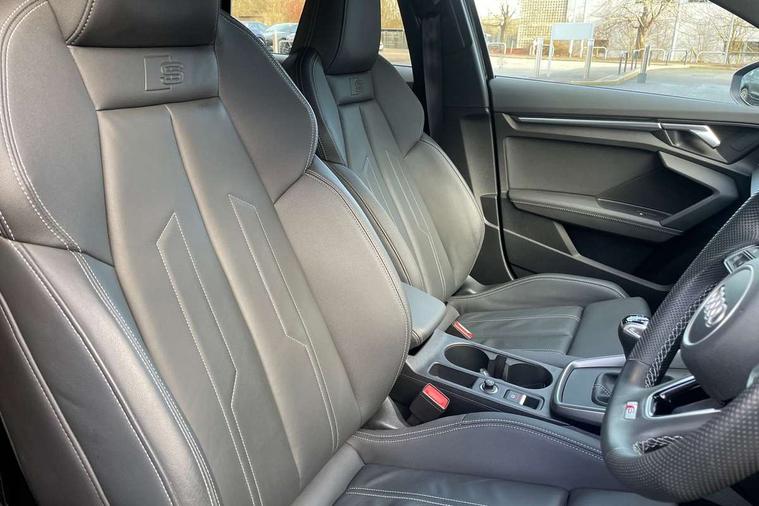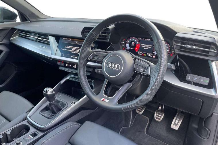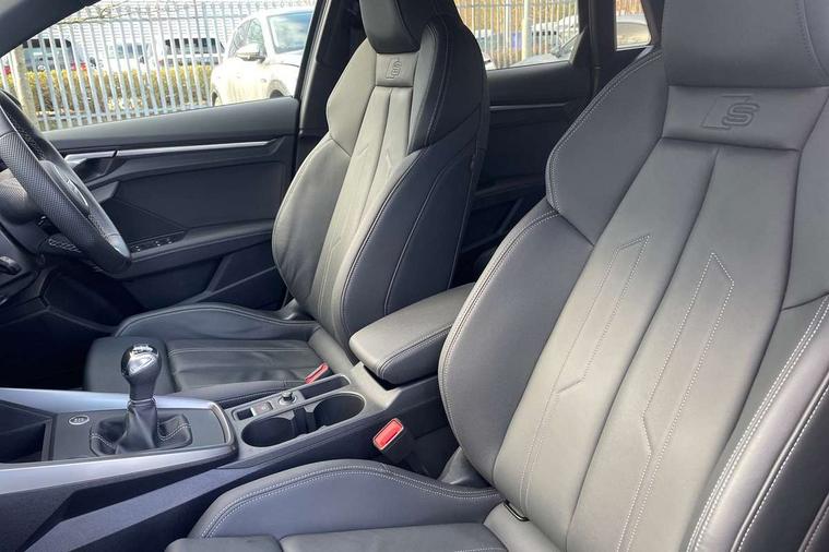 Audi drive select (Auto, Comfort, Dynamic and Individual), Audi smartphone interface, Audi Virtual Cockpit - 10.25" digital and colour instrument cluster, Automatic start/stop system with recuperation, Bluetooth interface, Camera based traffic sign recognition, Collision avoidance assistant, Cruise control, e-Call (emergency call), Electromechanical power speed sensitive steering, Lane departure warning system, MMI Navigation Plus with high resolution 10.1" colour touch screen display, Rear parking sensors, Service indicator, Trip computer, Voice control system with natural language interaction, Sports suspension, 2xUSB-C connection with data and charging functions, 6 passive loudspeakers, DAB Digital radio, 3rd brake light, Acoustic glass windscreen, Aluminium window trim, Auto dimming frameless rear view mirror, Body colour exterior mirrors, Electrically adjustable/heated/folding/dimming door mirrors with kerb view includes integrated LED indications + kerb view function for passenger side, Front electric windows, Illuminated door sills with aluminium inserts at the front with S logo, LED daytime running lights, LED headlights with LED rear lights and dynamic rear indicators, Light and rain sensors, Privacy glass - dark tinted rear window, rear door and side windows, Rear electric windows, Rear side air outlets in grained matt black, Rear side wing doors, Rear wiper, S line bumpers, S roof spoiler, 12V socket and storage compartment in front centre console, 3 seat bench in 2nd row, 3 spoke leather multifunction steering wheel, 4 way electrically adjustable lumbar support for driver and front passenger, 60/40 split folding rear seat bench, Black cloth headlining, Dual zone electronic climate control, Front and rear centre armrest in artificial leather, Front and rear headrests, Front/rear floor mats, Height and reach adjustable steering wheel, Interior lighting - glove compartment light and right hand side, Luggage compartment floor covering, Manual boot compartment lid, Manually adjustable front seats, Seat side bolsters, Single front passenger seat, Stainless steel pedals and front footrest in black, Twin leather upholstery with front sports seats S embossed logo, Aluminium interior elements pack - A3 Sportback, LED interior lighting pack - A3 Sportback, S line styling pack - A3 Sportback, 3x3 point rear seat belts, Driver and front passenger airbag with passenger airbag deactivation, Electronic Stabilisation Control (ESC) including ABS, ASR and EDL, First aid kit with warning triangle and 2 safety vests, Front side airbags with head airbags and interaction airbag, Pre-sense front with pedestrian and cyclist detection, Seatbelt monitoring, Tyre pressure loss indicator, Anti theft alarm, Anti-theft wheel bolts, Electronically operated child locks, Immobiliser, Remote control central locking, Dark spectrum aluminium inlays, accent surfaces in the dashboard and centre console in platinum grey silk effect paint finish,