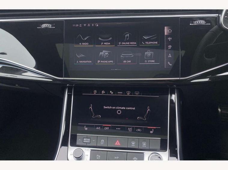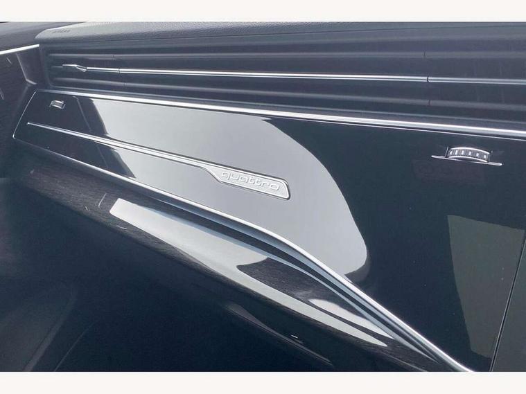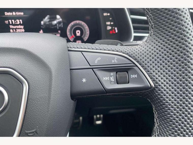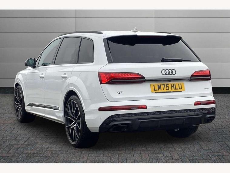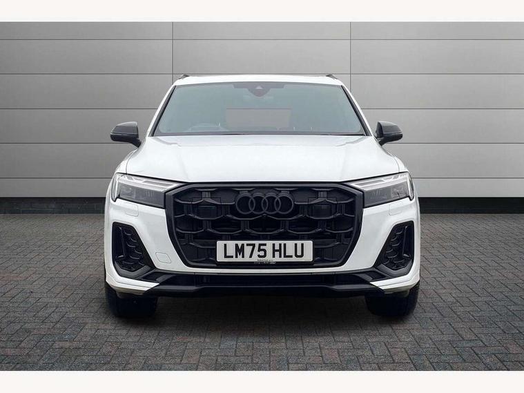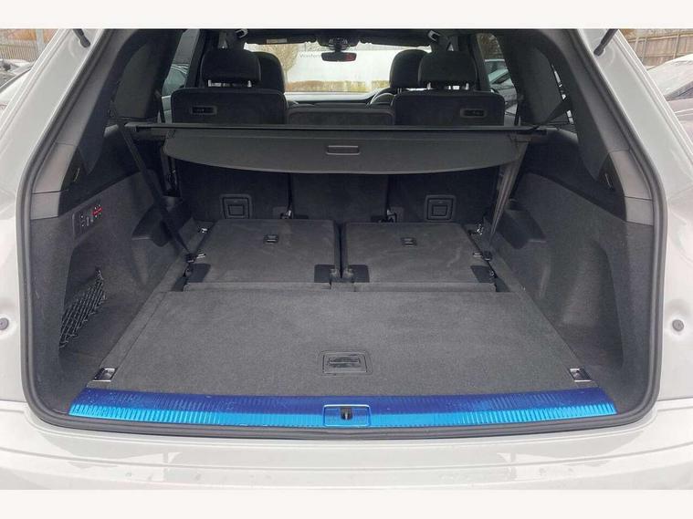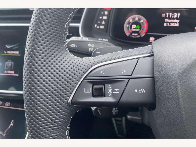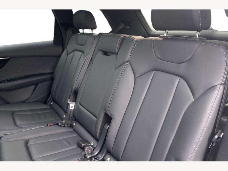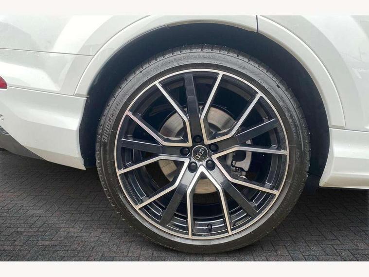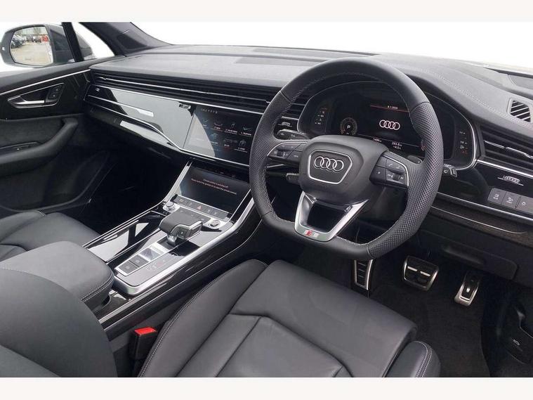 Audi connect safety and service (e-call), Audi connect with Amazon Alexa Integration, Audi drive select (Auto, Comfort, Dynamic, Efficiency, Individual, Off-road and All road), Audi phone box light with wireless charging, Audi virtual cockpit - 12.3" high-resolution LCD display with fully customisable instrument cluster, Bluetooth interface, Camera based traffic sign recognition, Electromechanical power steering, MMI navigation plus with MMI touch screens includes 10.1" and 8.6" screens with haptic feedback, Natural voice recognition, Operating buttons in Matte black, Parking system plus with 360 degree display (front, rear and side sensors) - acoustic and visual park assist system, Power operated tailgate, Rear view camera, Smartphone interface includes wireless Apple carplay/Android Auto, Start/stop system, 48V Mild hybrid technology, Adaptive air sports suspension, Quattro all wheel drive with self locking centre differential, Audi music interface - front 2 USB-C ports with charger and data functions, Audi sound system with 6 channel amplifier, 180 watt amplifying capacity and 10 loudspeakers including subwoofer, DAB digital radio module, Aluminium window trim, Audi Beam uses LEDs to project S emblem with red rhombus onto the ground when opening the side doors (front/rear), Auto dimming frameless rear view mirror, Black exhausts, Black roof rails, Electrically adj heated/folding + automatically dimming exterior mirrors with memory + automatic kerb side function for passenger side exterior mirror, Heat insulating glass in windshield, Integrated LED indications in door mirrors, LED 3rd brake light, LED daytime running lights, LED rear tail lights, Loading edge protection in stainless steel, Matrix LED headlights with dynamic front and rear indicators, Privacy glass - dark tinted rear and rear side windows from B-pillar backwards, Rear side wing doors, Rear wiper, 2 seat bench in 3rd row, 2 zone automatic climate control, 3 seat bench in 2nd row, 7 seat layout with ISOFIX points for the front passenger seat and rear passenger seat, Black carpets, Black cloth headlining, Comfort front centre armrest, Electric adjustable front seat with 4 way lumbar support, driver memory functionality, Folding rear seats, Front head restraints, Front/rear floor mats, Heated front seats, Illuminated door sill trims with S logo, ISOFIX child seat mounting for front passenger seat and 2 outer rear seats with top tether child seat mounting for all 3 rear seats, LED interior ambient lighting, Luggage compartment cover, Luggage compartment sill protection in stainless steel, Rear head restraints, Rear seat bench plus for the second row, with forwards/backwards sliding adjustment and backrest angle adjustment, Single front passenger seat, Stainless steel pedals, Sunvisors with illuminated vanity mirrors, Black styling pack plus - Q7, 3 point seatbelts on all rear seats, Audi pre sense basic, Audi pre sense front, Child locks on rear doors, Convenience key with safelock and gesture tailgate, Driver and front passenger, front side and curtain airbags, Electromechanical parking brake, Electronic Stabilisation Control (ESC) including ABS, ASR and EDL, Extended pedestrian protection measures, Hill hold assist, Seatbelt reminder, Tyre pressure loss indicator, Warning triangle and first aid kit, Anti theft alarm with tow away protection, Anti-theft wheel bolts and wheel loosening detection, Keyless Go, Remote central locking, Black dashboard, Polished oak trim with grey finish inlay, Tool kit, Tyre repair kit,