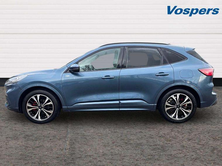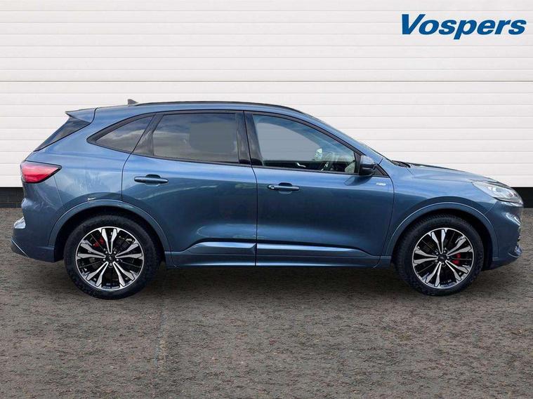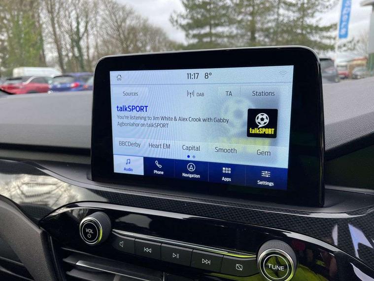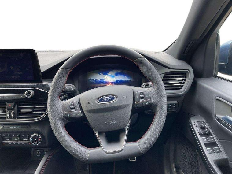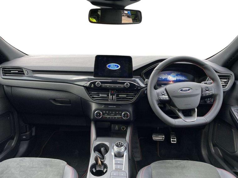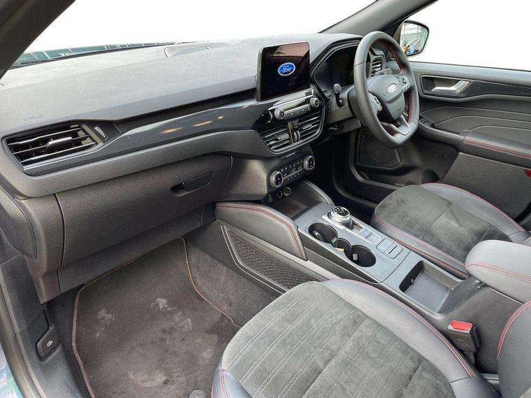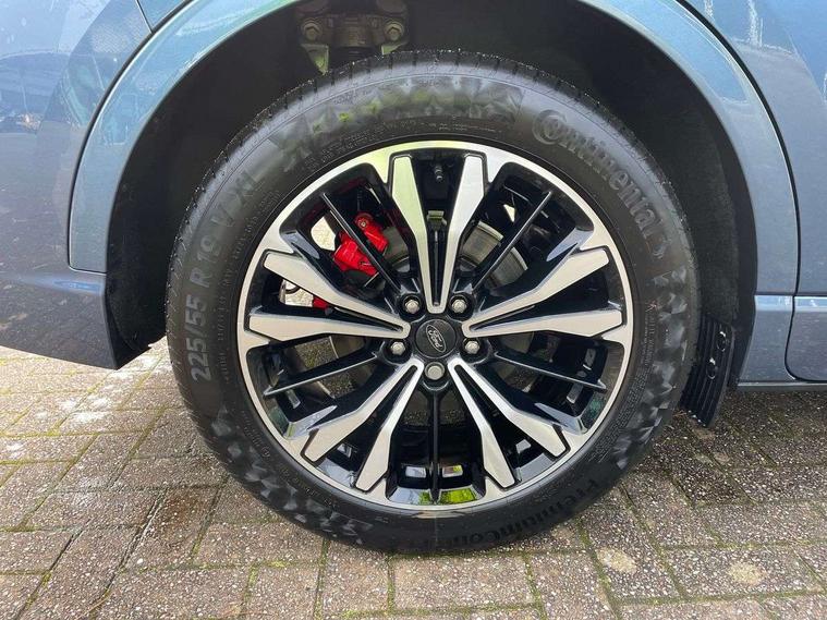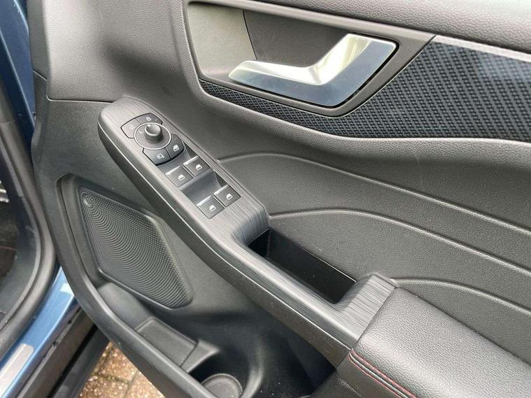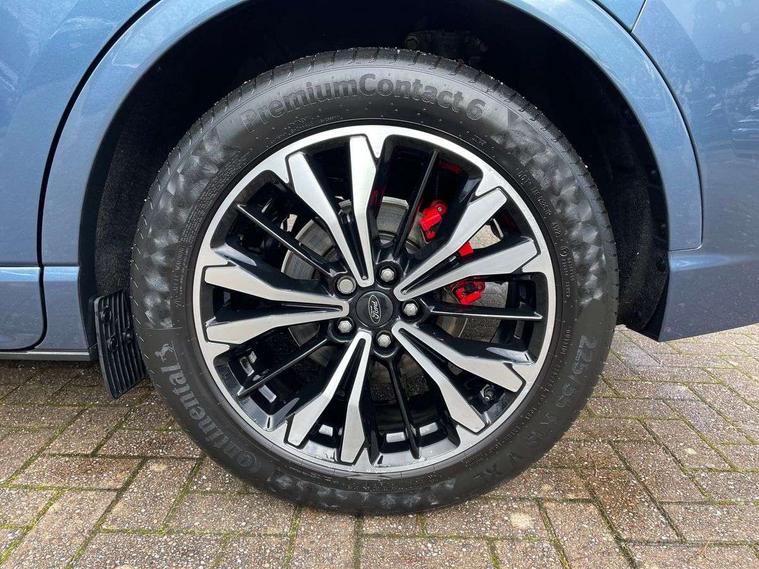 12.3" digital colour instrument cluster, Ford easy fuel, Ford SYNC 3 with 8" TFT LCD touchscreen, App Link, andriod auto/apple carPlay, emergency assistance and navigation with Ford pass connect, Front and rear parking sensors, Hands free power tailgate, Lane keeping aid with lane departure warning, Power assist steering, Rear view camera, Selectable drive modes, Service interval indicator, Sports suspension, Twist beam rear suspension, B&O premium audio system with 10 speakers and subwoofer, 2 USB ports, DAB radio/CD, Auto headlamps with high and low beam, Black roof rails, Day/night rear view mirror, Front LED fog lamps, Large rear spoiler, LED daytime running lights, LED rear lights, Power folding heated door mirrors with puddle lights, Power front/rear windows with global close, Power opening panoramic roof, Privacy glass, Quickclear heated windscreen, Rear side wing doors, Rear wiper, ST Line body styling kit with unique front and rear fascia and bumper, rear painted diffuser, front painted skid plates, dark mesh upper grille, ST Line front scuff plates, Third brake light, Twin exhausts, 10 way power adjustable drivers seat, 2nd row sliding seats with 60:40 split, 8 way manual passenger seat including lumbar support and height adjust, Alloy pedals, Centre console with electronic parking brake, Dark headlining and pillars, Electronic automatic temperature control (EATC), Flat bottomed leather steering wheel in sensico with red stitching, Front and rear head restraints, Heated passenger and driver seats, Heated rear seats, Heated steering wheel, Partial premium touch sensico leather upholstery with black cloth inserts and red stitching, Rear charging point, Single front passenger seat, Sports seats, ST Line front and rear floor mats, 3x3 point rear seatbelts, Airbags - front driver/passenger, front and rear curtain, Drivers knee airbag, Electronic stability control (ESC) and ABS, Ford MyKey Gen 2 safety system, Manual child proof rear door locks, Post collision braking, Pre collision assist with autonomous emergency braking, Rear seat Occupancy alert, Red brake calipers, Tyre pressure monitoring system, Engine immobiliser, Keyless entry and Ford power start button (Keyless start), Locking wheel nuts, Remote powered central double locking doors, Thatcham category 1 alarm,
