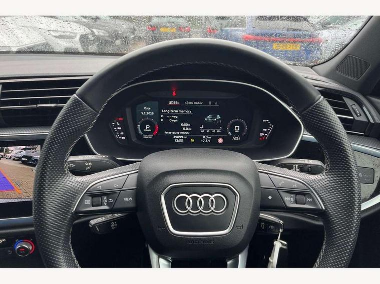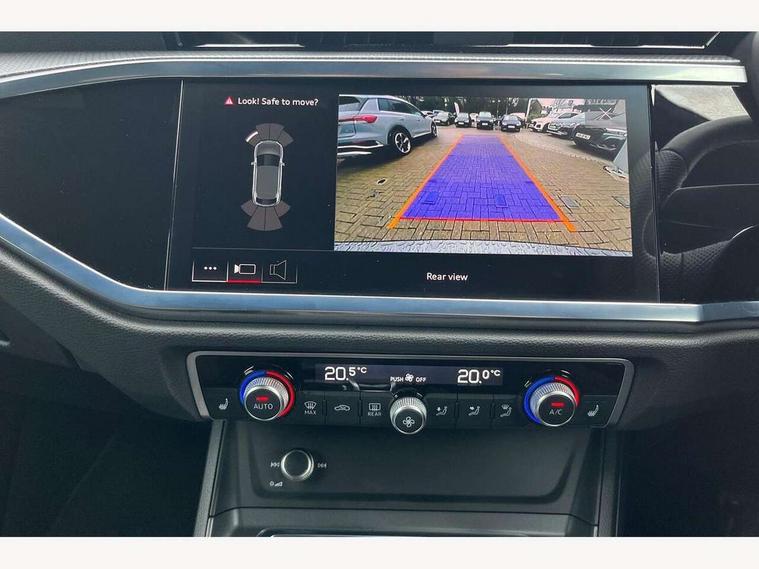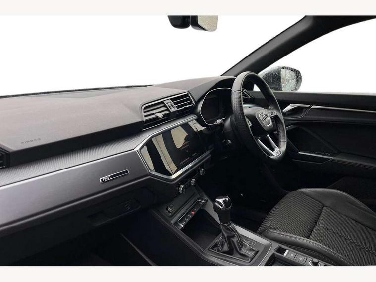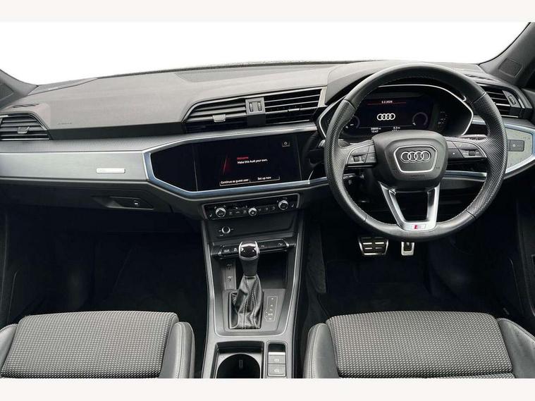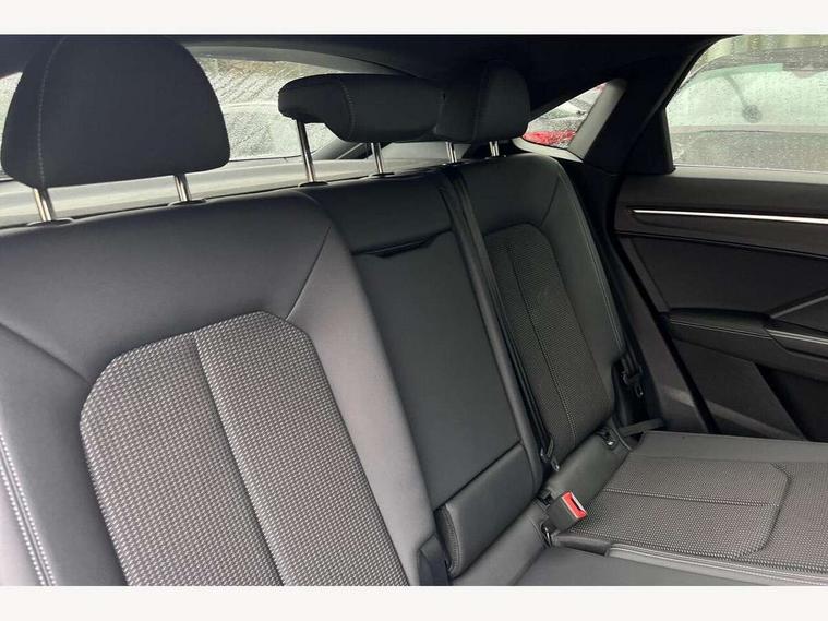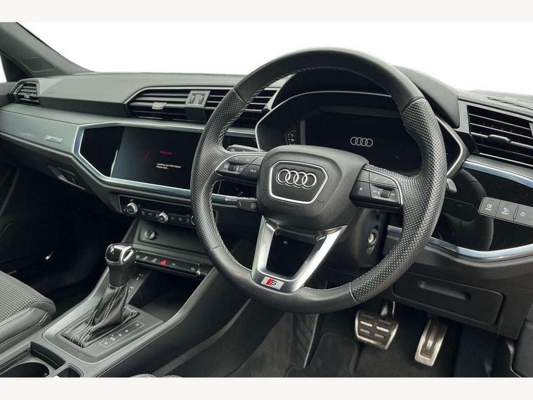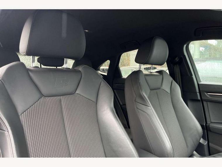 Audi drive select, Audi lane departure warning, Audi Virtual Cockpit - 10.25" display, Bluetooth interface, Camera based traffic sign recognition, Legal emergency call, MMI Navigation Plus with high resolution 10.1 inch touchscreen colour display, Power operated tailgate, Progressive steering, Service interval indicator, Smartphone interface includes wireless Apple carplay/Android Auto, Start stop system with recuperation, Voice control system with natural language interaction, Sports suspension, 2 USB-C ports with charge and data functions, 6 passive loudspeakers, DAB digital radio module, Acoustic windscreen, Aluminium window trim, Auto dimming frameless rear view mirror, Diffuser grille in grained matt black, Diffuser trim in selenite silver, Electrically folding, adjustable and heated door mirrors with integrated LED side indicators and kerb view function for passenger side, Front and rear electric windows, Front fog lights, Front side air inlets in selenite silver, Front underbody protection in manhattan grey paint finish, Grille surround in aluminium silver matt, High gloss black finish B and C pillars, LED Dynamic rear indicators, LED headlights with LED daytime running lights, LED rear lights, LED third brake light, Privacy glass dark tinted rear and rear-side windows (from B-pillar backwards), Radiator grille in anthracite black with inlay in matt aluminium silver, Rain and light sensors, Rear side wing doors, Rear underbody protection in matt black, Rear wiper, S line badges on front wings, S line front and rear bumpers and side skirts in contrasting Manhattan grey paint finish, Side skirt insert in matt Platinium grey, Variable front intermittent wipers, 12V socket in rear centre console, 3 seat bench in 2nd row, 3 spoke leather multifunction steering wheel features S badging and grips in perforated leather with contrast stitching, 40:20:40 folding with manual adjustment for 60:40 forwards/backwards position and backrest angle, Adjustable rear seat bench/backrest with centre armrest and cupholder, Black cloth headlining, Dual zone electronic climate control, Front and rear black floor mats with contrast stitching, Front and rear headrests, Front and rear roof module including reading lights, Front centre armrest, Glove compartment lighting, Height and reach adjustable steering wheel, Illuminated door sill trims with S logo, ISOFIX child seat mounting for front passenger with airbag deactivation and outer rear seat including top tether attachment point for outer rear seats, Luggage compartment light right in white, Luggage compartment sill protection in stainless steel, Manual front seats with height adjustment, Perforated leather gearknob, Single front passenger seat, Stainless steel pedals, Ambient lighting pack - Q3, Non smoking pack - Q3, 3x3 point rear seatbelts, 6 airbags - Driver, front passenger, curtain and side windows, Audi pre-sense front with pedestrain and cyclist recognition, Electrically operated child locks on rear doors, Electromechanical parking brake, Electronic stabilisation control including ABS, ASR and EDL, Front seatbelt reminder, Hill descent control, Hill hold assist, Pre sense basic, Seatbelt monitoring, Tyre pressure warning, Warning triangle and first aid kit, Anti theft alarm, Anti theft wheel bolts, Immobiliser, Remote central locking, Aluminium look interior elements, Black dashboard, Dark matt brushed aluminium inlay, Detail dashboard around MMI touch colour display in glass look, black with surround in aluminium look, Leatherette door armrest,