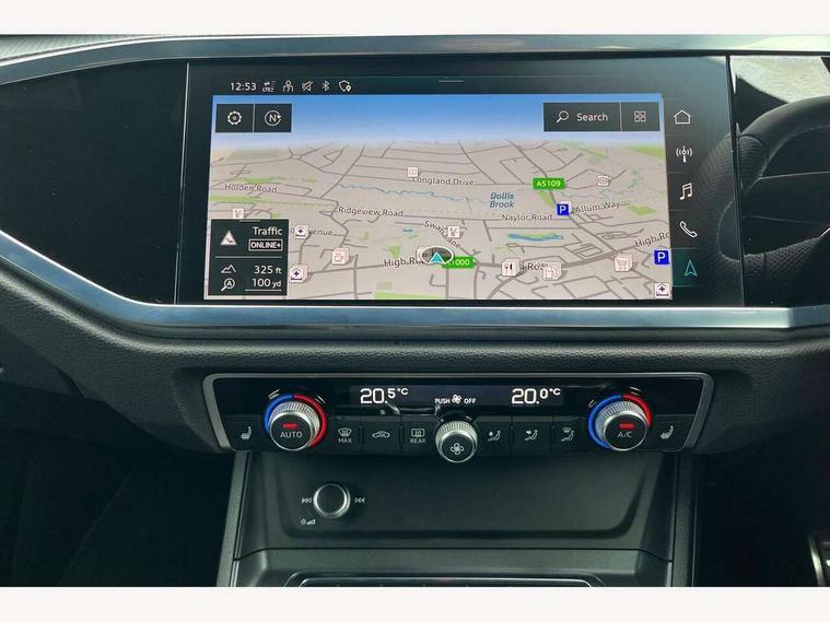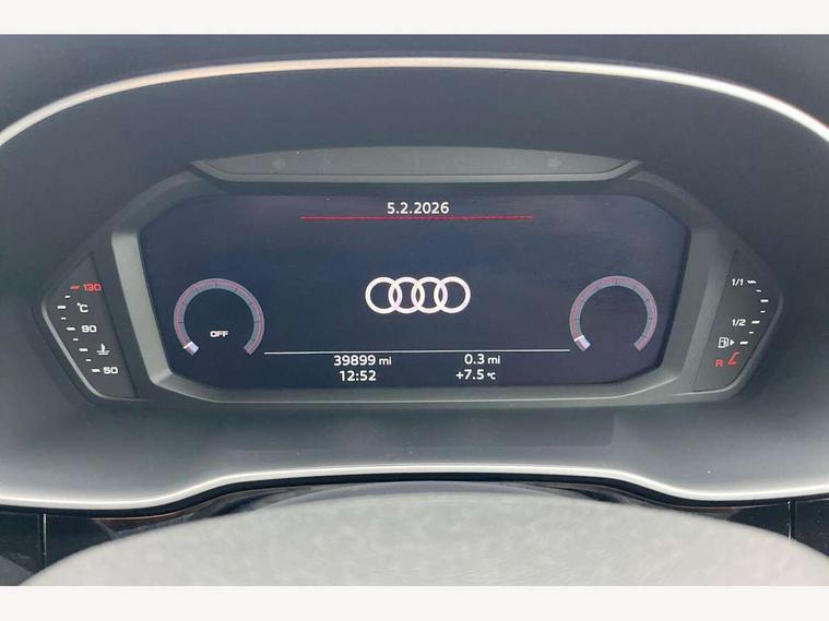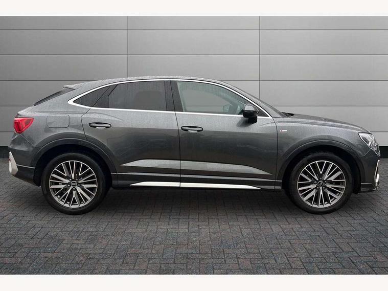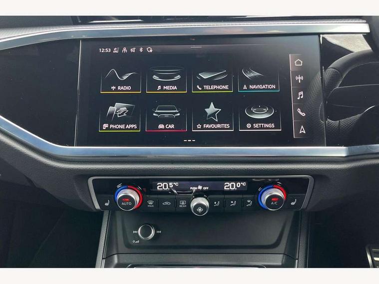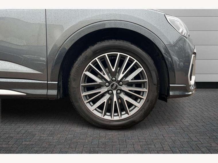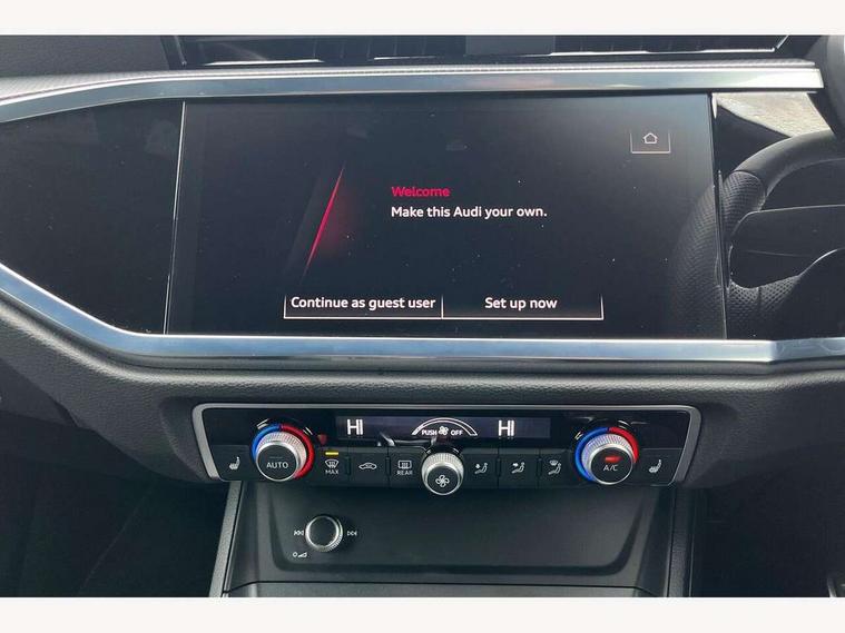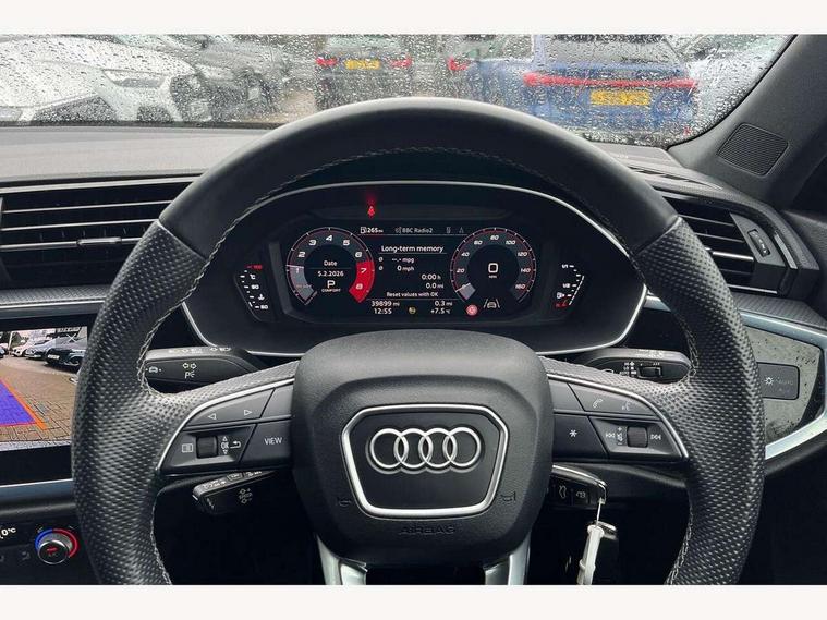 Audi drive select, Audi lane departure warning, Audi Virtual Cockpit - 10.25" display, Bluetooth interface, Camera based traffic sign recognition, Legal emergency call, MMI Navigation Plus with high resolution 10.1 inch touchscreen colour display, Power operated tailgate, Progressive steering, Service interval indicator, Smartphone interface includes wireless Apple carplay/Android Auto, Start stop system with recuperation, Voice control system with natural language interaction, Sports suspension, 2 USB-C ports with charge and data functions, 6 passive loudspeakers, DAB digital radio module, Acoustic windscreen, Aluminium window trim, Auto dimming frameless rear view mirror, Diffuser grille in grained matt black, Diffuser trim in selenite silver, Electrically folding, adjustable and heated door mirrors with integrated LED side indicators and kerb view function for passenger side, Front and rear electric windows, Front fog lights, Front side air inlets in selenite silver, Front underbody protection in manhattan grey paint finish, Grille surround in aluminium silver matt, High gloss black finish B and C pillars, LED Dynamic rear indicators, LED headlights with LED daytime running lights, LED rear lights, LED third brake light, Privacy glass dark tinted rear and rear-side windows (from B-pillar backwards), Radiator grille in anthracite black with inlay in matt aluminium silver, Rain and light sensors, Rear side wing doors, Rear underbody protection in matt black, Rear wiper, S line badges on front wings, S line front and rear bumpers and side skirts in contrasting Manhattan grey paint finish, Side skirt insert in matt Platinium grey, Variable front intermittent wipers, 12V socket in rear centre console, 3 seat bench in 2nd row, 3 spoke leather multifunction steering wheel features S badging and grips in perforated leather with contrast stitching, 40:20:40 folding with manual adjustment for 60:40 forwards/backwards position and backrest angle, Adjustable rear seat bench/backrest with centre armrest and cupholder, Black cloth headlining, Dual zone electronic climate control, Front and rear black floor mats with contrast stitching, Front and rear headrests, Front and rear roof module including reading lights, Front centre armrest, Glove compartment lighting, Height and reach adjustable steering wheel, Illuminated door sill trims with S logo, ISOFIX child seat mounting for front passenger with airbag deactivation and outer rear seat including top tether attachment point for outer rear seats, Luggage compartment light right in white, Luggage compartment sill protection in stainless steel, Manual front seats with height adjustment, Perforated leather gearknob, Single front passenger seat, Stainless steel pedals, Ambient lighting pack - Q3, Non smoking pack - Q3, 3x3 point rear seatbelts, 6 airbags - Driver, front passenger, curtain and side windows, Audi pre-sense front with pedestrain and cyclist recognition, Electrically operated child locks on rear doors, Electromechanical parking brake, Electronic stabilisation control including ABS, ASR and EDL, Front seatbelt reminder, Hill descent control, Hill hold assist, Pre sense basic, Seatbelt monitoring, Tyre pressure warning, Warning triangle and first aid kit, Anti theft alarm, Anti theft wheel bolts, Immobiliser, Remote central locking, Aluminium look interior elements, Black dashboard, Dark matt brushed aluminium inlay, Detail dashboard around MMI touch colour display in glass look, black with surround in aluminium look, Leatherette door armrest,