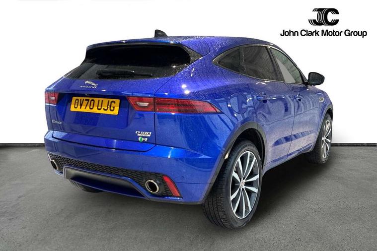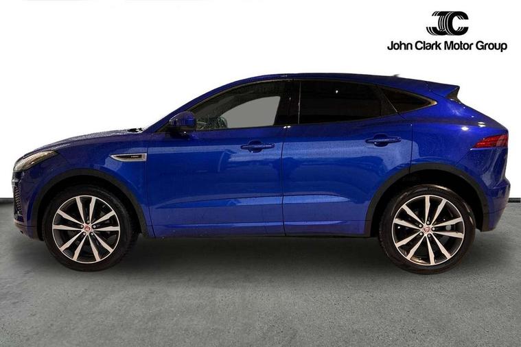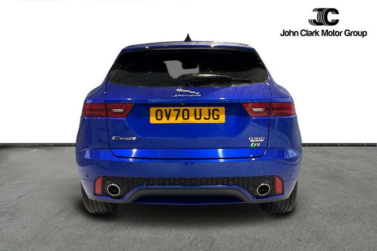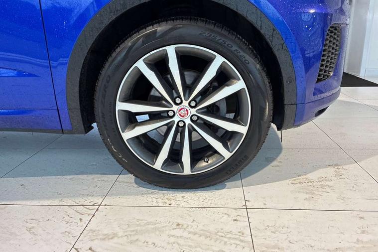 Driver condition monitor, Eco driving style assistant, Electric power assisted steering, InControl remote, InControl Touch navigation pro, Interactive Driver display instrument cluster, Lane keep assist, Misfuelling protection device, Outside temperature gauge, Push button starter, Speed proportional steering, Start up sequence with movement in dials and lighting, Traffic sign recognition with adaptive speed limiter, Trip computer, Voice control system, Diesel particulate filter, Efficient Driveline, Passive suspension, AM/FM DVD MP3 radio, Bluetooth connectivity including audio streaming, DAB Digital radio, Dynamic volume control, 3 flash lane change indicators, Approach Illumination, Auto dimming rear view mirror, Auto high beam assist, Automatic headlights, Body colour side cladding, Electric folding auto dimming and heated door mirrors with memory + Signature approach lamp, Electric front/rear windows with one touch/auto up/down, Front fog lights, Heated front windscreen, Heated rear window with timer, Heated washer jets, Jaguar script and leaper, R Dynamic badge, R Dynamic body colour bumpers, Rain sensor windscreen wipers, Rear fog lights, Tailgate/boot lid spoiler, Twin tailpipes with finishers, 12V power socket in rear, 2nd row 60/40 split/fold, 2nd row air vents, 3 seat bench in 2nd row, 4 Load area hooks, Black gearshift paddles, Bright metal pedals, Centre armrest console, Centre headrest in row 2, Elasticated loadspace side strap, Front head restraints, ISOFIX on outer rear seats, JaguarDrive selector, LED lighting in overhead console, Loadspace cover, Loadspace lamp, Passive front headrests, R branded leather steering wheel, Storage net in luggage compartment, Sunvisors with illuminated vanity mirrors, Tie down hooks in luggage area, Twin front cupholders, Two zone climate control, Windsor leather upholstery with front sports seats, Connect pro pack - E-Pace, Drive pro pack - E-Pace, Park pro pack - E-Pace, Smartphone pack - E-Pace, 3x3 point rear seatbelts, ABS, All surface progress control (ASPC), Customer configurable autolock, DSC - Dynamic Stability Control, Electronic brake force distribution, Electronic parking brake, Emergency brake assist, Front airbags with passenger seat occupant detector, Front and rear curtain airbags, Front and rear seatbelt reminder, Front side airbags, Hill start assist, Low friction launch, Power child locks, Torque vectoring brake, Tyre pressure monitoring system, Intrusion sensor and alarm, Keyless entry, Locking wheel nuts,