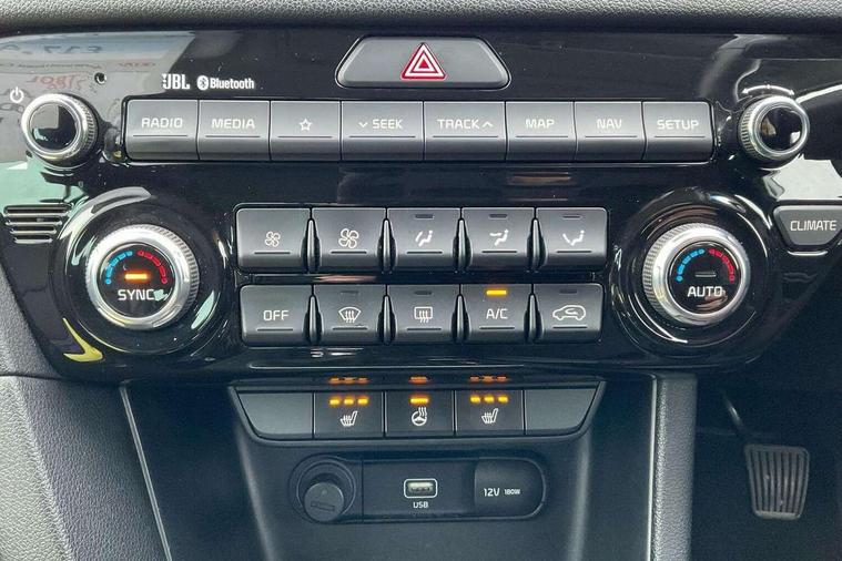 360 degree around view monitor, 4.2" supervision colour cluster display, 8" touchscreen satellite navigation with European mapping and traffic messaging channel, Android auto with voice control, Apple car play with voice control, Blind spot collision warning, Bluetooth connectivity with voice control, Cruise control + speed limiter, Driver attention warning, Emergency stop signalling system, Forward collision avoidance assist, Front parking sensor, Kia connected services featuring TomTom live, Lane keep assist, Rear parking sensor, Reversing camera, Speed limit information, Speed sensitive power steering, Trip computer, Windscreen washer level indicator, Intelligent Stop and Go, Bluetooth audio streaming, DAB Radio with MP3, JBL Premium sound system with 8 speakers, external amp, subwoofer and front centre speaker, Rear USB port, Steering wheel mounted audio controls, USB/iPod/auxiliary input connections, All round electric windows with drivers auto up/down function, Auto dimming rear view mirror, Automatic headlights, Automatic lighting control, Black wheel arch body mouldings and side sills with chrome insert, Body colour door handles with chrome inserts, Body colour door mirrors, Chrome front bumper insert, Chrome grille surround, Chrome window surround, Electric panoramic glass sunroof (Electric one touch with safety function), Electrically adjustable/heated/folding door mirrors with LED indicators, Front wiper de-icer, High beam assist, High gloss black diamond mesh radiator grille, LED Bi-Function headlights, LED daytime running lights, LED rear lights, Privacy glass (rear side windows and rear screen), Projection front fog lights, Rain sensing front wipers, Rear spoiler, Rear wiper, Roof rails, Shark fin antenna, Silver painted front and rear skid plates, Speed sensitive front wipers, Tinted glass, Trailer stability assist, Welcome and follow-me home light functionality, Wide view drivers door mirror, Windscreen wiper de-icer, 10 way driver/8 way passenger electrically power adjustable seats, 12V power in front and rear centre console, 3 x passenger assist grips, 60/40 split folding rear seat, Air filter, All-round height adjustable headrests, Aluminium door scuff plates, Centre console storage box, Door armrest in leather, Driver and front passenger side sunvisors with illuminated vanity mirrors, Drivers seat power lumbar support, Dual zone automatic air conditioning, Front and rear door storage, Front cabin LED map light with sunglasses case, Front door courtesy reflectors, Front seat and rear pockets, Front/rear centre armrests, Gear shift indicator, Glovebox illumination, Heated front and outer rear seats, Heated steering wheel, Interior door lock/unlock function, ISOFIX Child seat top tethers and anchor fixings, Leather steering wheel, Leather trimmed gearshift, Leather upholstery, Light grey headlining, Luggage area LED light, Luggage area load cover, Luggage net hooks, Rear centre armrest with cupholder, Rear coat hooks, Satin chrome interior door handles, Side cabin LED lights, Tilt/telescopic adjustable steering wheel, Ventilation ducts to rear compartment, Active front headrests, All round 3-point seatbelts, Anti-lock braking system with electronic brakeforce distribution, Dual front side airbags, Electronic parking brake, Electronic stability control with downhill brake control, ESP + traction control, Front passenger airbag cut-off switch, Front seatbelt pretensioners + load limiters, Height adjustable front seatbelts, Hill start assist control (HAC), Impact sensing auto door unlocking, Rear door child safety locks, Twin curtain airbags with roll over sensor, Twin front airbags, Tyre pressure monitoring system, Advanced anti-theft system including immobiliser and alarm, Door deadlocks, Engine Start/Stop Button with Smart Entry System, Locking wheel nuts, Speed sensitive auto door locking, Visible vehicle identification number, High gloss black centre fascia, 19" alloy wheels, Tyre mobility kit,