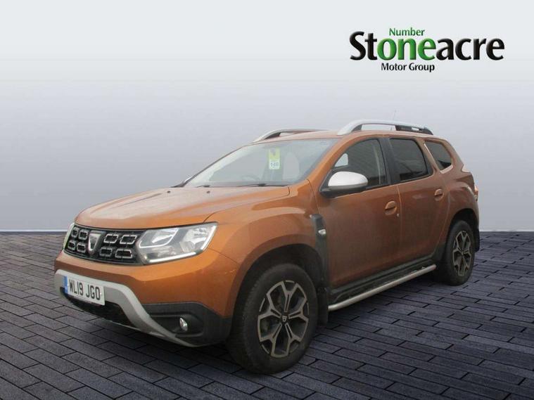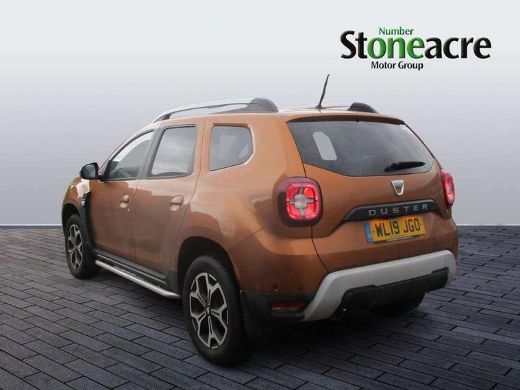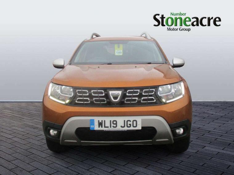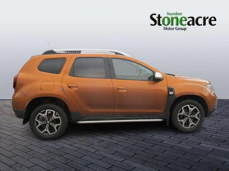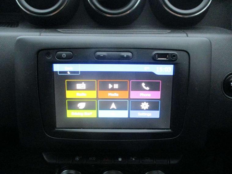 Blind spot monitoring, Bluetooth connectivity, Cruise control, Dusk sensor, Eco mode, Electric power assisted steering, MediaNav Evolution 7" touchscreen multimedia system with satellite navigation with Apple car play and Android auto, Multi view camera, On board computer, odometer, trip computer, average fuel consumption, average speed, service indicator, outside temperature gauge, Rear parking camera, Rear parking sensors, Rev counter, Speed limiter, Stop/start system, 4x 20W FM/AM/DAB tuner with steering column mounted fingertip controls, Aux-in socket, USB connection for MP3 players, 3 speed windscreen wipers, Black side sills, Body coloured door handles, Body coloured front and rear bumpers, Chrome front grille, Dark metal door mirrors in grey, Dark tinted windows, Daytime running lights, Double optic headlights, Electric adjustable/heated door mirrors, Electric front windows, Electric rear windows, Front door sill protection strip, Front fog lights, Heated rear window, High level third rear brake light, Rear wash/wipe, Satin chrome front and rear skid plates, Satin chrome longitudinal roof bars, Tailgate trim with satin chrome Duster inscription in black background, 3 rear height adjustable headrests, 4 speed heating and ventilation with air recirculation, 60/40 split folding rear seat, Boot light, Climate control, Driver seat lumbar adjustment, Fabric decorative insert on door panels, Front passenger reading light, Front seat armrests, Front under seat storage, Gear shift indicator, Glovebox light, Height adjustable driver seat, Height adjustable front headrests, Height adjustable steering wheel, Isofix points for child seats in both outer rear seats, Map pocket on front seat backs, Passenger sunvisor with vanity mirror, Rear passenger reading light, Satin chrome gear lever cap insert, Satin chrome interior door handles, Satin chrome lower steering wheel insert, Soft feel steering wheel, 3x3 point rear seatbelts, ABS and Emergency brake assist, ASR traction control with Electronic stability control, Child locks on rear doors, Door open warning, Driver airbag, Driver and passenger seatbelt not fastened - visual and audible warning, Front passenger airbag deactivation, Front seatbelt pretensioners, Front side airbags, Height adjustable front seatbelts, Tyre pressure monitor, Keyless entry, Remote central locking, Thatcham approved engine immobiliser, Dark carbon central console surround, Matt black central console fascia, Piano black decorative insert on door panels, Satin chrome air vent surround, Satin chrome instrument dial surrounds, 17" diamond cut alloy wheels,