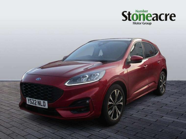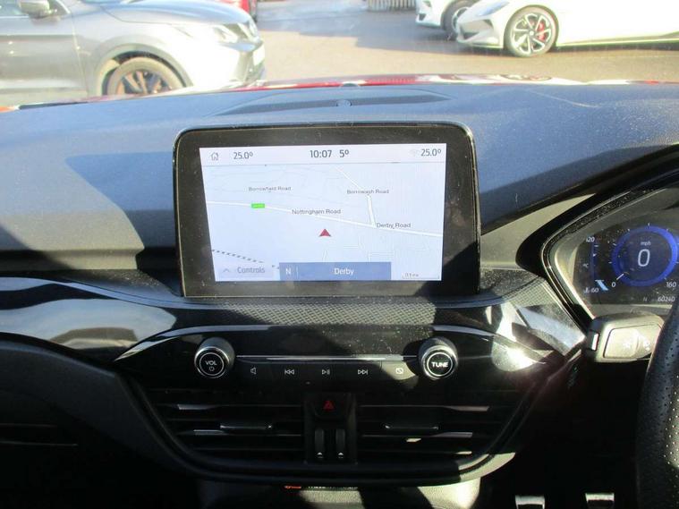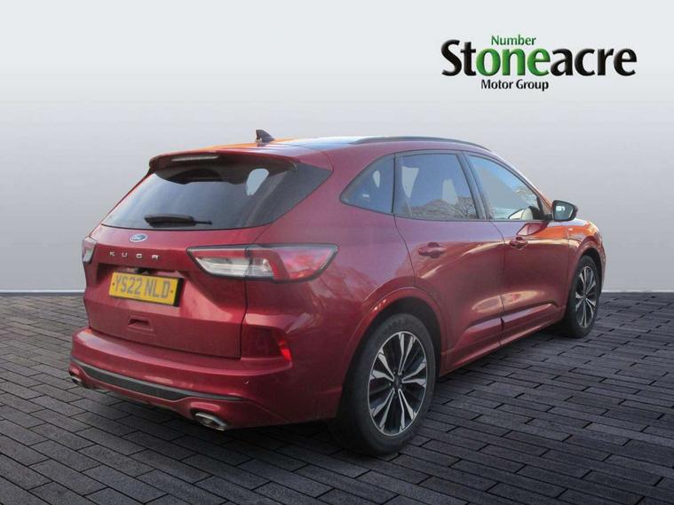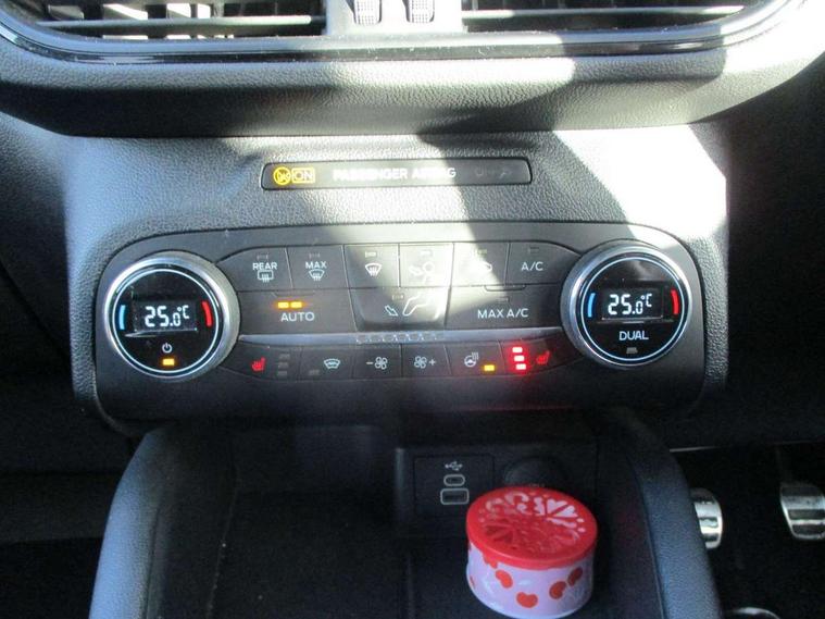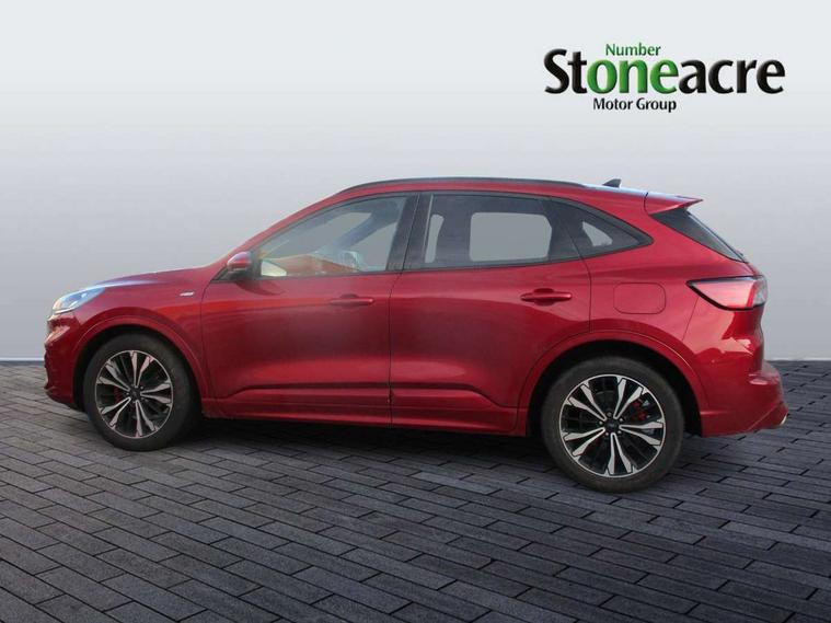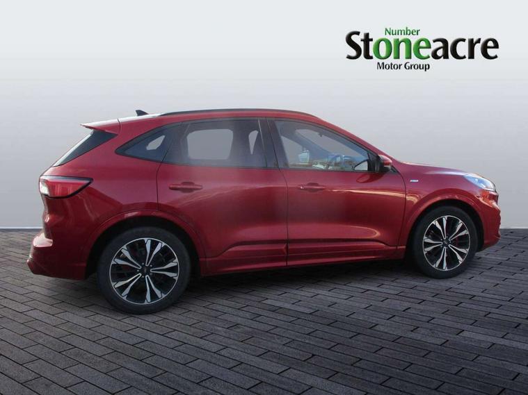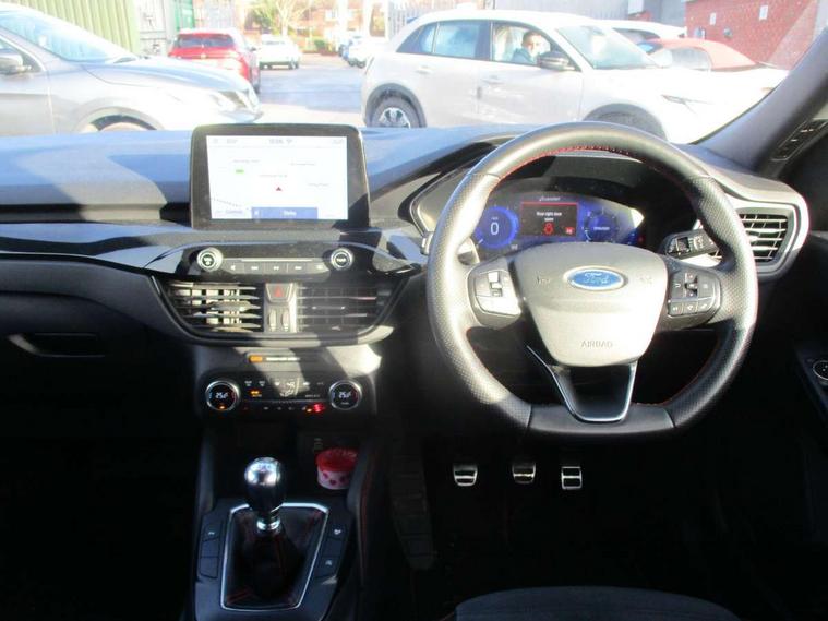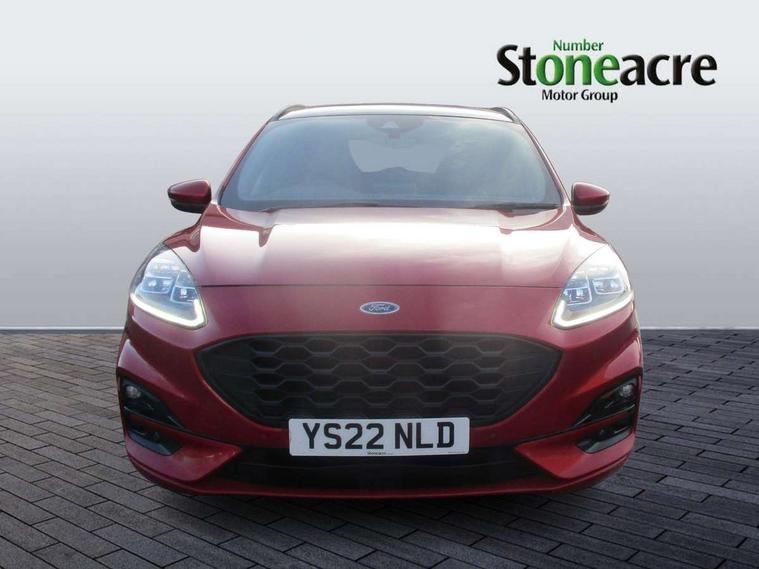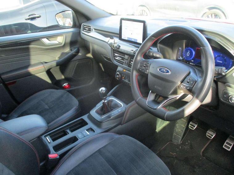 Driver impairment monitor, Ford easy fuel, Ford SYNC 3 with 8" colour touchscreen, App Link, andriod auto/apple carPlay and navigation with Ford pass connect, Front and rear parking sensors, Hands free power tailgate, Intelligent speed assist, Lane keeping aid with lane departure warning, Mobile phone wireless charging pad, Power assist steering, Selectable drive modes, Sports suspension, Auto dimming rear view mirror, Auto headlamps with high and low beam, Auto wipers, Black roof rails, Front LED fog lights with cornering function, Full LED headlamps, Large rear spoiler, LED daytime running lights, LED rear lights, Power folding heated door mirrors with puddle lights, Power front/rear windows with global close, Power opening panoramic roof, Privacy glass, Quickclear heated windscreen, ST Line body styling kit with unique front and rear fascia and bumper, rear painted diffuser, front painted skid plates, dark mesh upper grille, ST Line front scuff plates, Twin exhausts, 10 way power adjustable drivers seat, 2nd row sliding seats, 8 way manual passenger seat including lumbar support and height adjust, Alloy pedals, Ambient lighting, Centre console with electronic parking brake, Dark headlining and pillars, Dual electronic automatic temperature control, Flat bottomed leather steering wheel in sensico with red stitching, Front and rear head restraints, Heated passenger and driver seats, Rear charging point, Sensico partial premium leather upholstery, Sports seats, ST Line front and rear floor mats, Unique ST Line leather gear knob, B&O with large instrument cluster pack - Kuga, 3x3 point rear seatbelts, Airbags - front driver/passenger, front and rear curtain, Drivers knee airbag, Electronic stability control (ESC) and ABS, Ford MyKey Gen 2 safety system, Post collision braking, Powered child proof rear door locks, Pre collision assist with autonomous emergency braking, Red brake calipers, Tyre pressure monitoring system, Engine immobiliser, Keyless entry, Keyless start with 'Ford Power' starter button, Locking wheel nuts, Remote powered central double locking doors, Thatcham category 1 alarm,