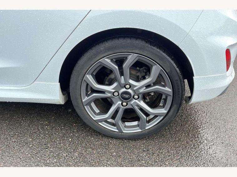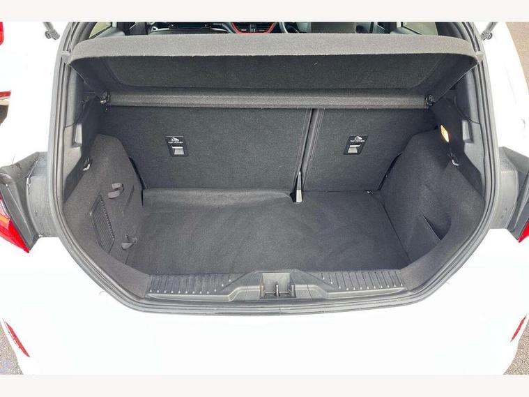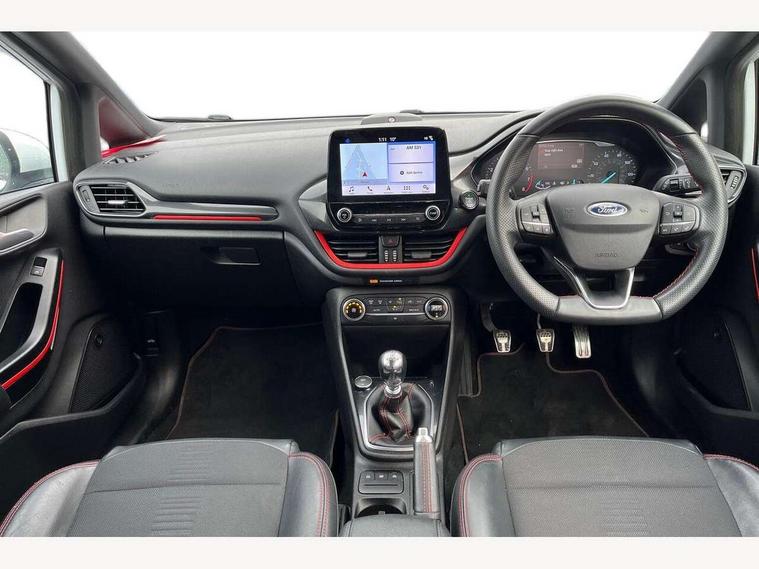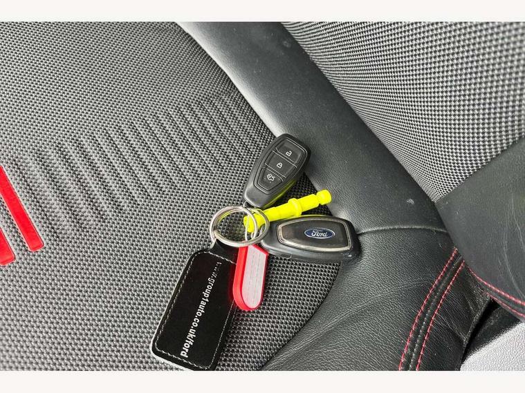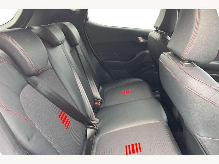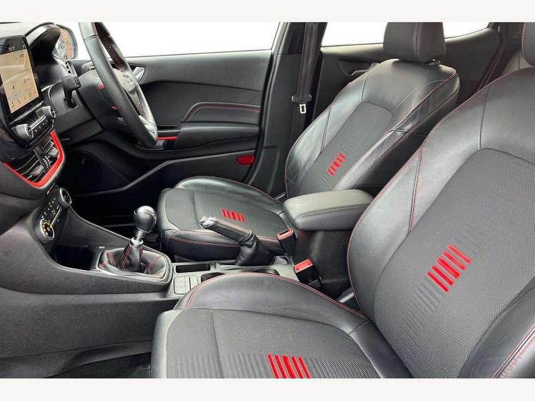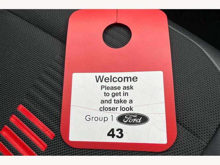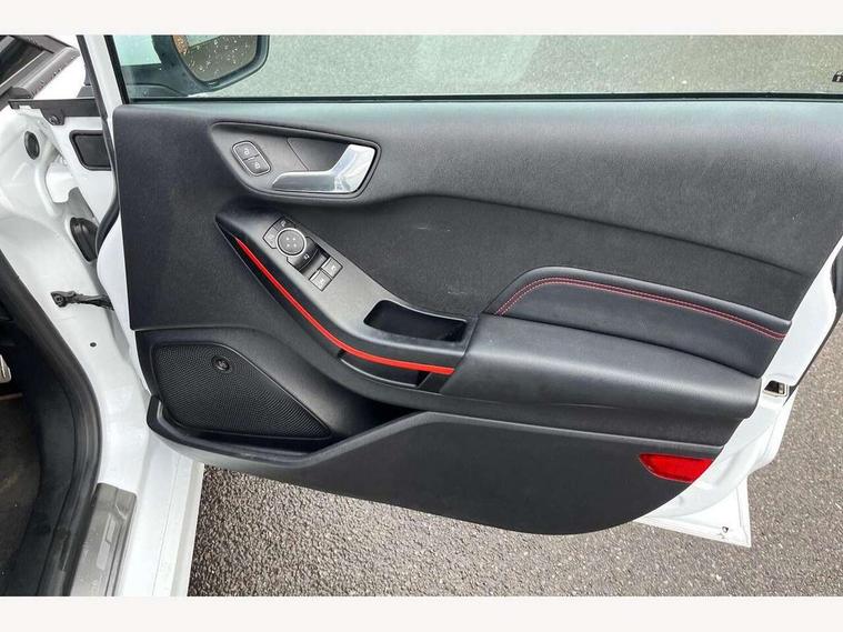 Bluetooth system, Electric power steering, Ford easy fuel, Trip computer, Sports suspension, 2 USB ports, Auxiliary input socket, DAB Digital radio, Steering wheel mounted controls, Auto dimming rear view mirror, Body colour bumpers, Body colour door handles, Body colour large rear spoiler, Chrome door handles, Chrome lower window surround, Cornering front fog lights, Electric front windows/one touch facility, LED Night signature to rear lights, LED rear lights, Power foldable door mirrors with puddle lights, Privacy glass, Quickclear heated windscreen, Rain sensing wipers and auto dimming rear view mirror, Rear privacy glass, Rear wiper, Rugged body styling kit with active front wing badges, Tinted glass, Unique ST-Line upper grille & full bodystyling kit with ST-Line wing badges, 12V Accessory socket in centre console, 3 spoke flat bottomed leather steering wheel, 60/40 split folding rear seat, Adjustable head restraints, Black headlining, Boot carpet, Centre console with armrest and illuminated cupholders, Chrome inner door handles, Drivers and Passenger lumbar support, EATC - Electronic Auto Temperature control, Footwell illumination, Front and rear velour floor mats, Front map reading lights, Front seat and rear pockets, Illuminated glovebox, Leather gear knob, Leather trimmed handbrake handle, Load area light, Overhead console with sunglasses holder, Pollen filter, Rake/reach adjustable steering wheel, Rear centre head restraint, Sports front seats, Sports pedals, Driver assistance pack - Fiesta/Titanium/Titanium X/Active B+O/Active X/ST-Line X, NCAP Pack - Fiesta, Red pack - Fiesta ST-Line X, 3 point seatbelts on all rear seats, ABS+EBA, Curtain airbags, Driver and passenger airbags, Drivers knee airbag, Electronic stability control with hill start assist, Front passenger airbag deactivation, Front side airbags, Seatbelt warning, Tyre pressure monitoring system, MyKey system, Remote central locking & engine immobiliser, Thatcham Cat.1 alarm,
