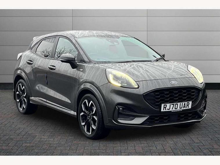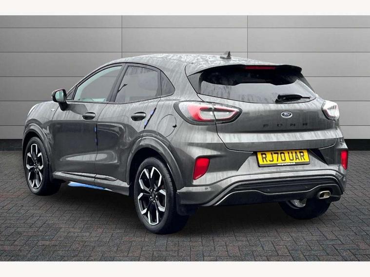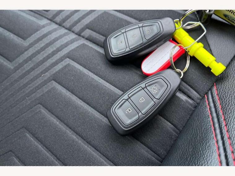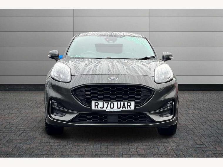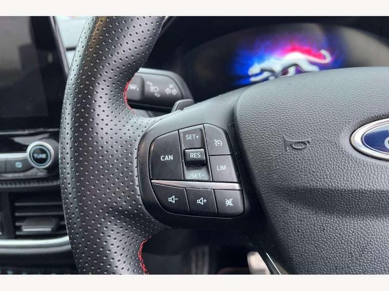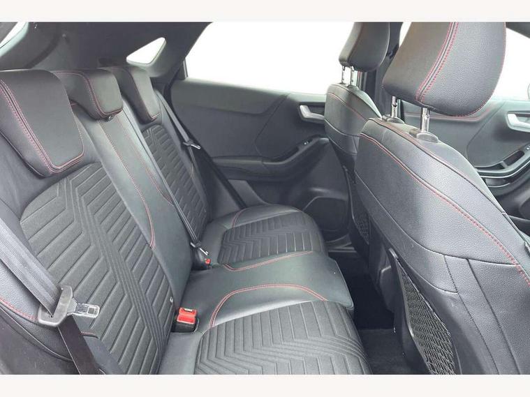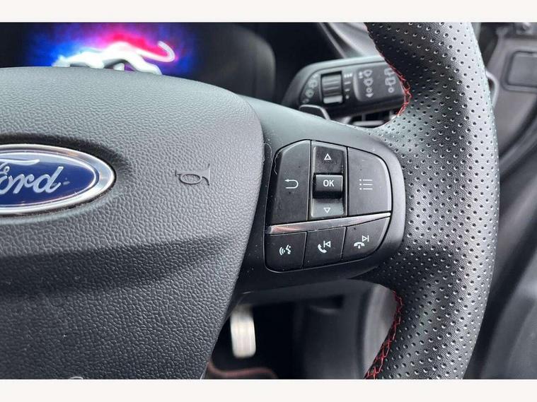 Ford easy fuel, Full digital 12.3" instrument cluster, Lane keeping aid with lane departure warning, Power assist steering, Rear parking sensor, Selectable drive modes(Normal, Eco, Sport, Slippery and Trail), Wireless charging pad, Automatic headlights with rain sensing wipers and auto high beam, Body coloured door mirrors, Front fog lights with cornering lights and LED rear lamps, Power foldable heated door mirrors with puddle lamps, Privacy glass to side rear windows and tailgate glass, Quickclear heated windscreen, Rear wiper, ST-Line body kit with large rear spoiler wth sports suspension, Centre console with armrest and stowage, Driver and passenger seat lumbar and height adjust, Ford megabox extended bootspace, Front and rear floor mats, Front and rear head restraints, Manual air conditioning, Sensico partial premium upholstery, ST-Line flat bottomed sensico leather steering wheel with leather handbrake, B&O Premium Audio system + Ford SYNC 3 navigation pack - Puma, 3 rear seatbelts, Electronic stability control (ESC) and hill start assist, Pre-collision assist with autonomous emergency braking, pedestrian/cyclist detection & post-collision braking, Tyre pressure monitoring system (TPMS), Thatcham alarm, Carbon look interior deco spears,
