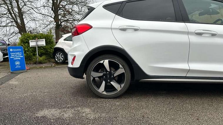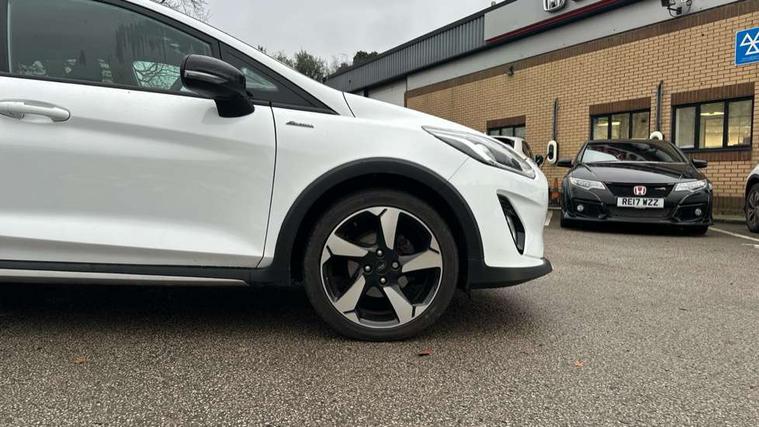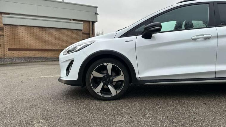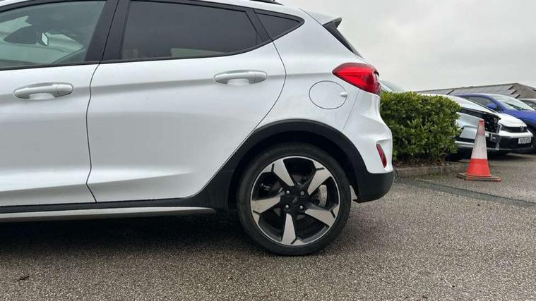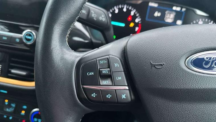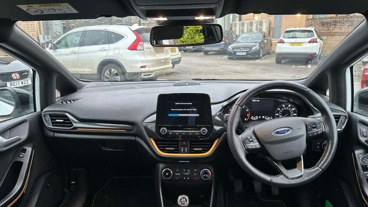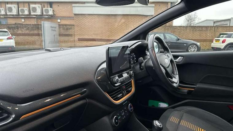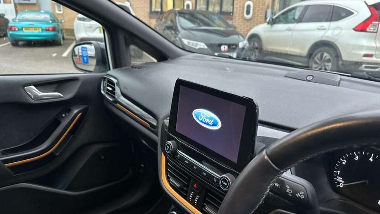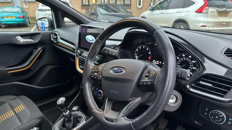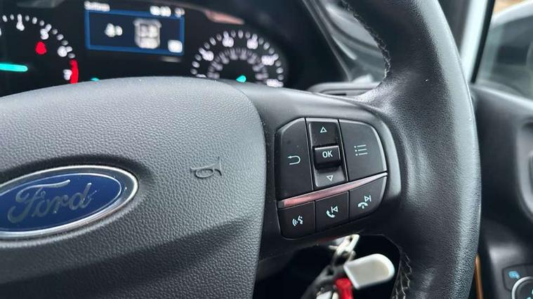 Bluetooth system, Cruise control, Drive mode selector, Driver alert system, Electric power steering, Lane keep assist, Speed limiter, SYNC Emergency Assistance, Traffic sign recognition, Trip computer, 2 USB ports, Auxiliary input socket, Bang and Olufsen premium sound with 10 speakers, Ford SYNC 3 DAB radio, apple car play and android auto with voice control, Steering wheel mounted controls, Auto dimming rear view mirror, Auto high beam, Automatic headlights, Black electric adjustable heated door mirrors, Black roof, Black roof rails, Body colour bumpers, Body colour door handles, Body colour rear spoiler, Chrome beltline trim, Chrome door handles, Cornering front fog lights, Electric front windows/one touch facility, Electric rear windows, LED daytime running lights, LED rear lights, Privacy glass, Quickclear heated windscreen, Rear wiper, Tinted glass, Upper front grille chrome surround, 12V Accessory socket in centre console, 3 spoke leather steering wheel, 60/40 split folding rear seat, Adjustable head restraints, Ambient lighting, Black headlining, Boot carpet, Centre console with armrest, Chrome inner door handles, Cloth upholstery, Driver's lumbar support, Footwell illumination, Front map reading lights, Front seat and rear pockets, Front/rear floor mats, Height adjustable driver's seat, Illuminated cup holders, Illuminated glovebox, Leather gear knob, Leather trimmed handbrake handle, Load area light, Manual air conditioning, Overhead console with sunglasses holder, Pollen filter, Rake/reach adjustable steering wheel, Rear centre head restraint, Yellow pack - Fiesta, 3 point seatbelts on all rear seats, ABS+EBA, Curtain airbags, Driver and passenger airbags, Drivers knee airbag, ESP + traction control, Front passenger airbag deactivation, Front side airbags, Hill start assist, Seatbelt warning, Tyre pressure monitoring system, Immobiliser, MyKey system, Remote central locking, Thatcham Cat.1 alarm, 17" 5 spoke alloy wheels with shadow black machined finish, Tyre repair kit,