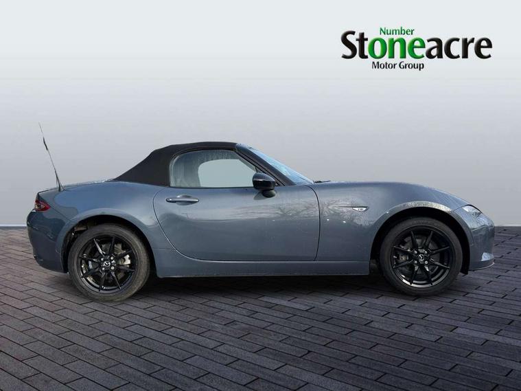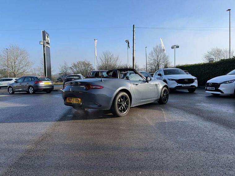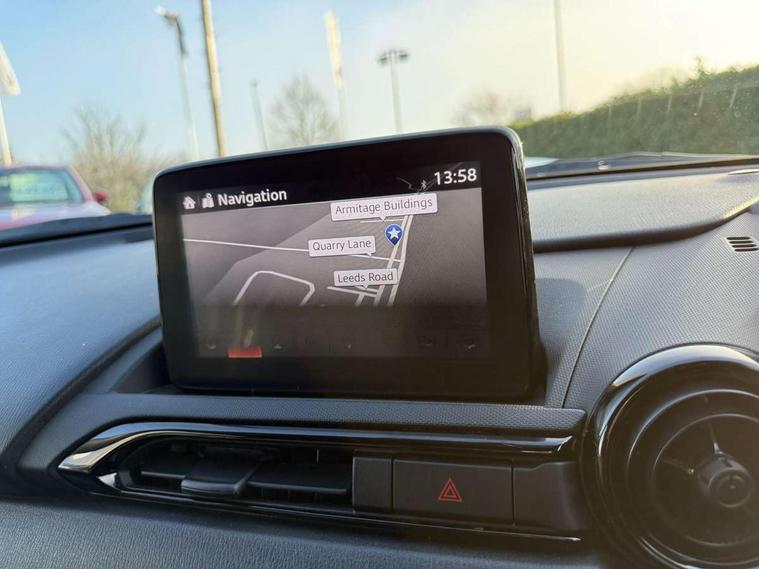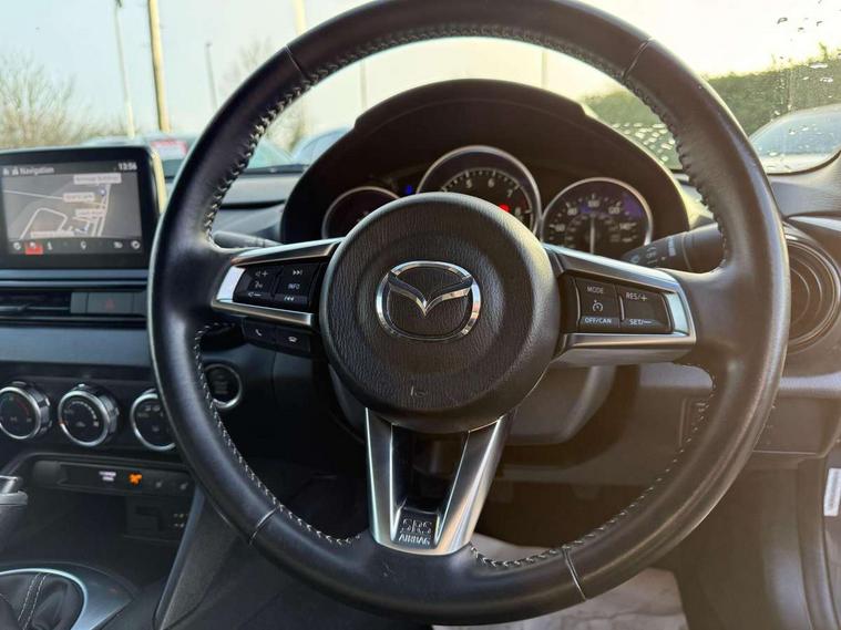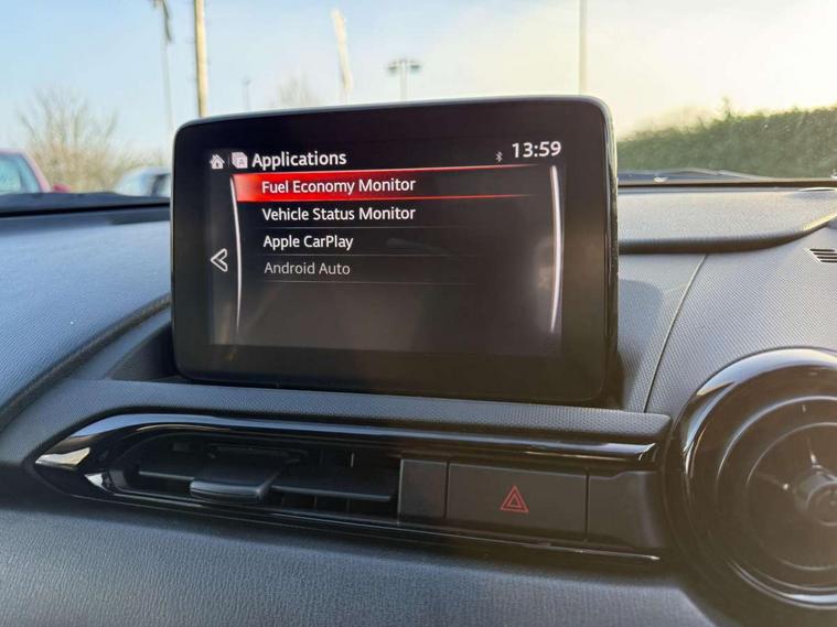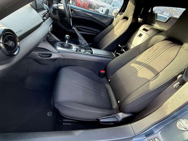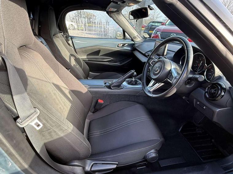 7" colour touch screen with Mazda connect infotainment, Aha and stitcher app, Analogue speedometer, Apple car play/Android Auto, Cruise control + speed limiter, eCall emergency call system, Electronic odometer, Emergency stop signalling system, Engine start/stop button, Hands free phone preparation, Integrated bluetooth with hands-free calling, bluetooth audio and easy access to phone contacts, Integrated navigation system, PAS, Service indicator, Tachometer, Trip computer, Water temperature gauge, I-ELOOP, i-stop, 2 USB/aux input socket, Audio system with 6 speakers with 2 in driver headrest, AM/FM/DAB radio and MP3, Multimedia Commander including separate volume dial, Steering wheel mounted audio/bluetooth controls, Automatic headlamp levelling, Body colour bumpers, Body colour co ordinated interior upper door trim, Coming/leaving home lighting function, Dual exhaust pipes, Electric front windows/one touch facility, Front intermittent wipers, High mounted rear brake light with Black coloured cover, LED 3rd brake light, LED daytime running lights, LED Headlights, LED indicator lights, LED rear lights, Manually operated black premium cloth soft top with heated rear glass window, Piano black electric/heated door mirrors, Piano Black fashion bars, Plastic black scuff plates, Rear boot, 12V socket, Centre console storage box, Chrome Air conditioning dials, Climate control air conditioning, Cloth upholstery, Coin Box, Driver and front passenger sunvisors with covered vanity mirror and driver ticket holder, Driver seat manual slide, recline and tilt adjustment, Front centre armrest, Front head restraints, Gear shift indicator, Heated front seats, in 3 heat levels, Interior courtesy light, ISOFIX front passenger seat child seat compliance, Leather gear knob, Leather handbrake lever, Leather steering wheel, Lockable rear centre box with lid, Passenger seat + manual slide/recline adjust, Side door trim in black vinyl with silver stitching, Single front passenger seat, Sports seats, Tilt/telescopic steering column, Two cupholders, Windblocker, 3 point ELR front seatbelts with pretensioners, ABS+Electronic Brake force Distribution, Deployable Hood System (DHS), Driver and front passenger airbags, Driver and passenger seatbelt reminder audible warning, Front dynamic yaw stability control, Hill hold assist, Passenger airbag deactivate switch, Side airbags, Traction control, Tyre pressure monitor, Remote central locking with deadlocking and remote boot release, Superlocking, Thatcham category 1 alarm + immobiliser, Black air vent surround, Black dash trim, Chrome meter rings, 16" black metallic alloy wheels, Tyre puncture repair kit,