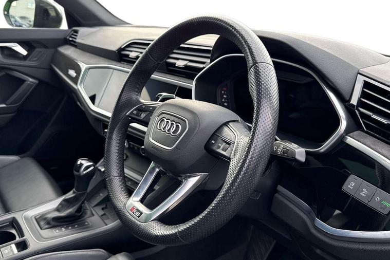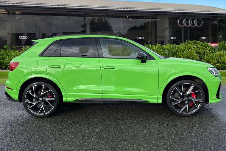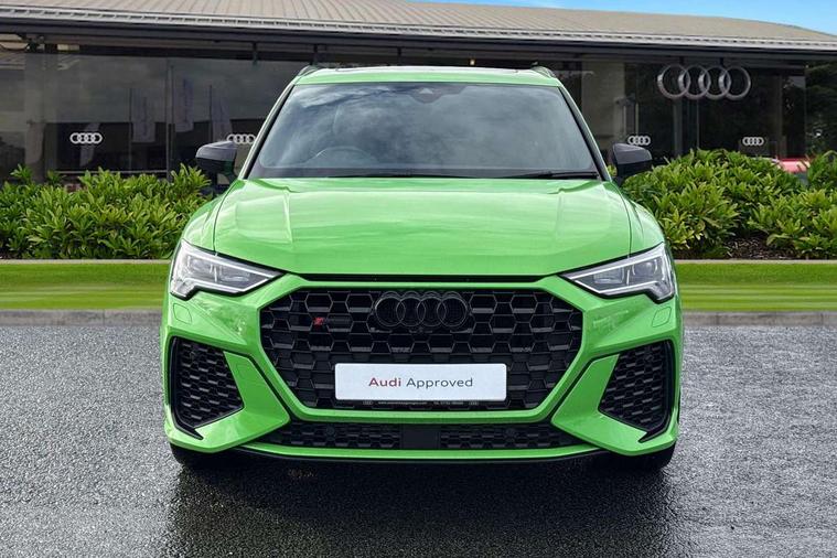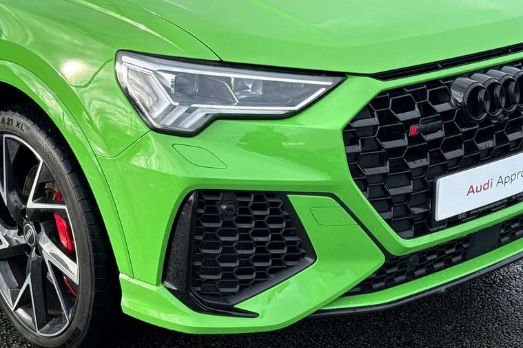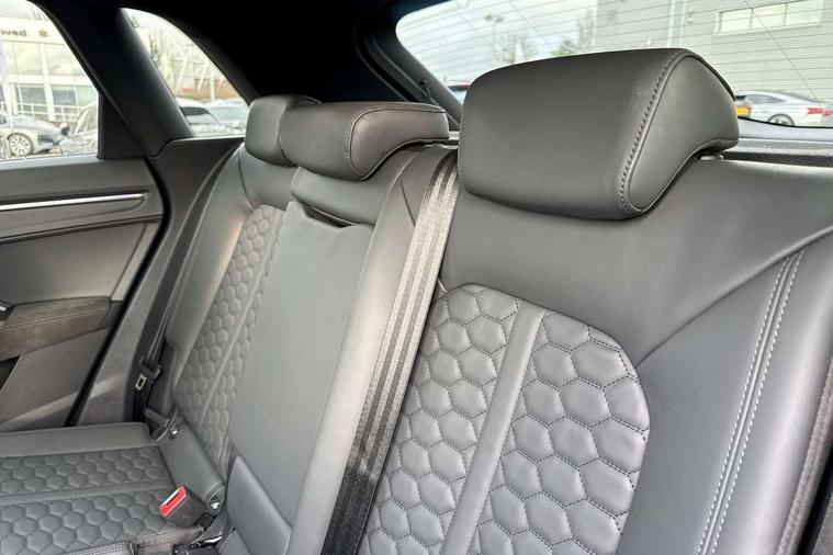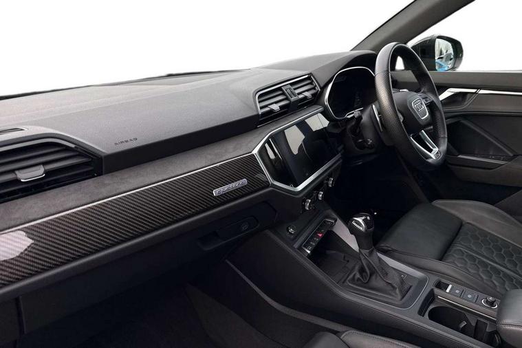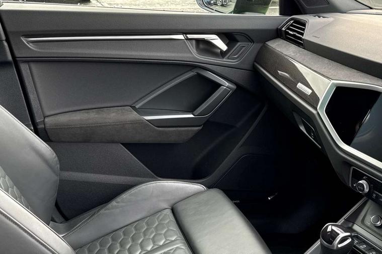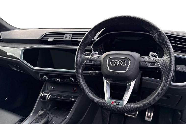 360 degree parking camera, Audi drive select with new RS modes, Audi lane departure warning, Audi parking system plus with front and rear sensors, Audi phone box with wireless charging, Audi virtual cockpit plus - 12.3 inch display, Bluetooth interface, Camera based traffic sign recognition, Emergency e-call, MMI Navigation Plus with high resolution 10.1 inch touchscreen colour display, Power operated tailgate, Progressive steering, Rear cross traffic assist, Smartphone interface includes wireless Apple carplay/Android Auto, Start stop system with recuperation, Voice control system with natural language interaction, Quattro all wheel drive, RS sports suspension plus, 2 USB-C ports with charge and data functions, Bang + Olufsen 3D sound system, DAB digital radio module, Acoustic windscreen, Audi Beam uses LEDs to project the Audi Sport logo, Auto dimming door mirrors, Auto dimming frameless rear view mirror, Black roof rails, Body colour rear spoiler, Carbon door mirror housings, Dark tinted Matrix LED headlights with dynamic front and rear indicators, Electrically folding, adjustable and heated door mirrors with integrated LED side indicators and kerb view function for passenger side, Flared wheel arches, Flat slits on single frame grille, Headlight washers, High gloss black finish B and C pillars, Honeycomb radiator grille in gloss black, Illuminated door sill trims with RS logo, LED daytime running lights, LED rear lights, LED third brake light, Panoramic glass sunroof, Privacy glass dark tinted rear and rear-side windows (from B-pillar backwards), Rain and light sensors, Rear side wing doors, Rear wiper, RS specific bumpers with large front air inlets in black, RS Sport exhaust system, dual branch with exhaust flap control and gloss black oval tailpipe trims, Tinted rear windows, Variable front intermittent wipers, 3 seat bench in 2nd row, 3 zone electronic climate control, 4 way electric lumbar support for driver and front passenger, Adjustable rear seat bench/backrest with centre armrest and cupholder, Black cloth headlining, Black dinamica elements - dashboard and the armrests in the front and rear doors, Electrically adjustable front seats, Front and rear floor mats, Front and rear head restraints, Front centre armrest, Heated front seats, ISOFIX child seat mounting for front passenger with airbag deactivation and outer rear seat including top tether attachment point for outer rear seats, Leather steering wheel (Round) in 3-spoke design with multifunction plus and shift paddles, Microfibre dinamica upholstery with front sports seats + honeycomb stitching and RS embossed logo, Single front passenger seat, Stainless steel luggage compartment sill finisher, Stainless steel pedals, Black styling pack - RS Q3, Driver assistance pack with side assist - RS Q3, Multi-coloured extended ambient lighting pack - RS Q3, Non smoking pack - RS Q3, 3x3 point rear seatbelts, 6 airbags - Driver, front passenger, curtain and side windows, Audi pre-sense front with pedestrain and cyclist recognition, Electrically operated child locks on rear doors, Electromechanical parking brake, Electronic stabilisation control including ABS, ASR and EDL, Front seatbelt reminder, Hill descent control, Hill hold assist, Pre sense basic, RS brake system, Seatbelt monitoring, Tyre pressure warning, Warning triangle and first aid kit, Advanced key, Anti theft alarm, Anti theft wheel bolts, Immobiliser, Aluminium look interior elements, Carbon twill inlays, Detail dashboard around MMI touch colour display in glass look, black with surround in aluminium look, Tool kit, Tyre repair kit,