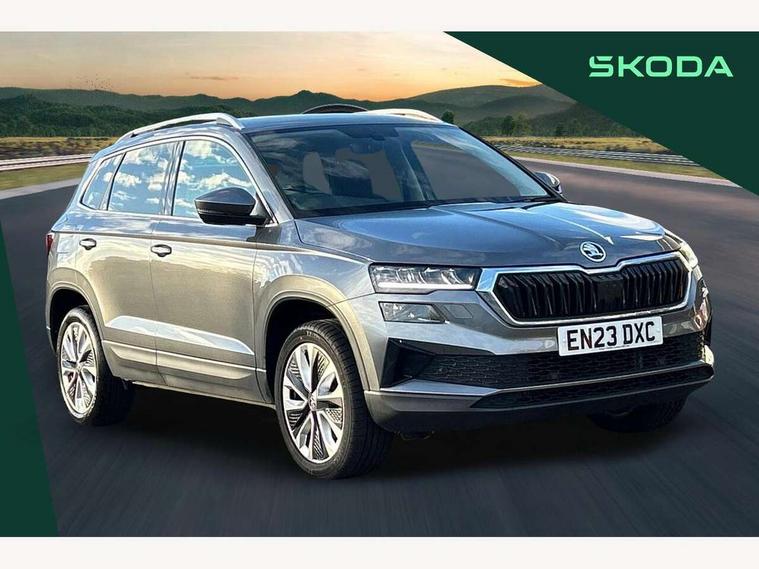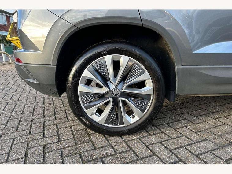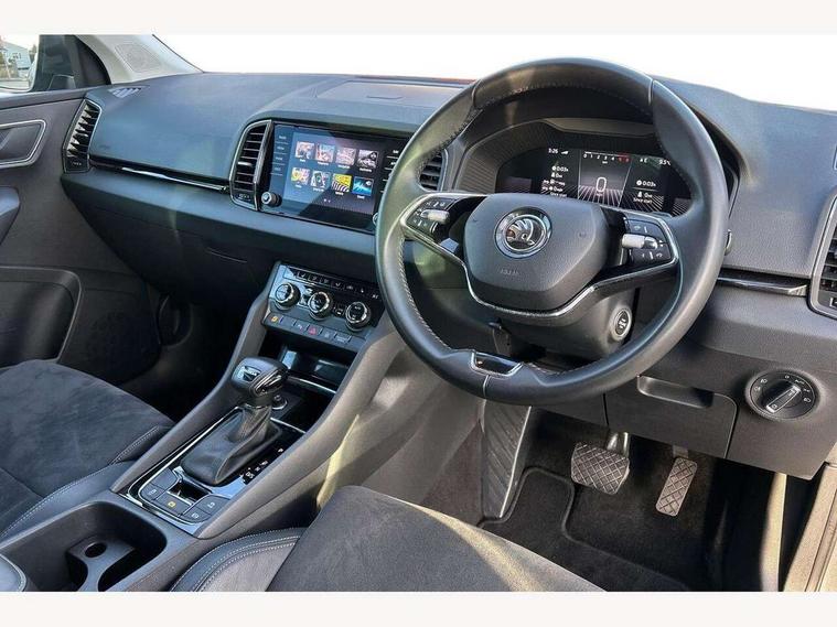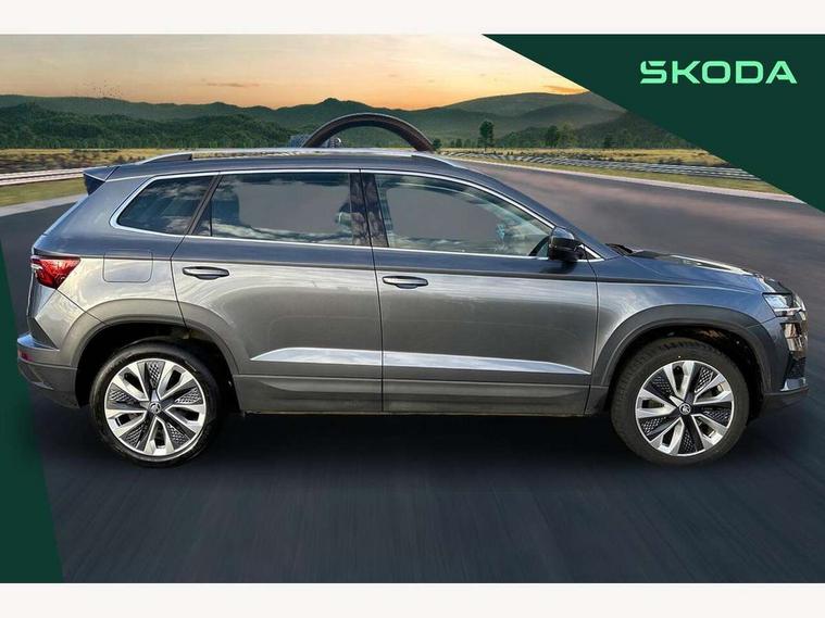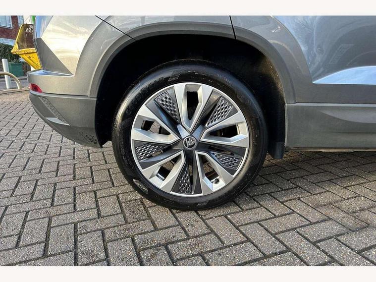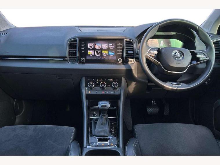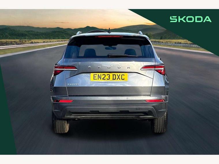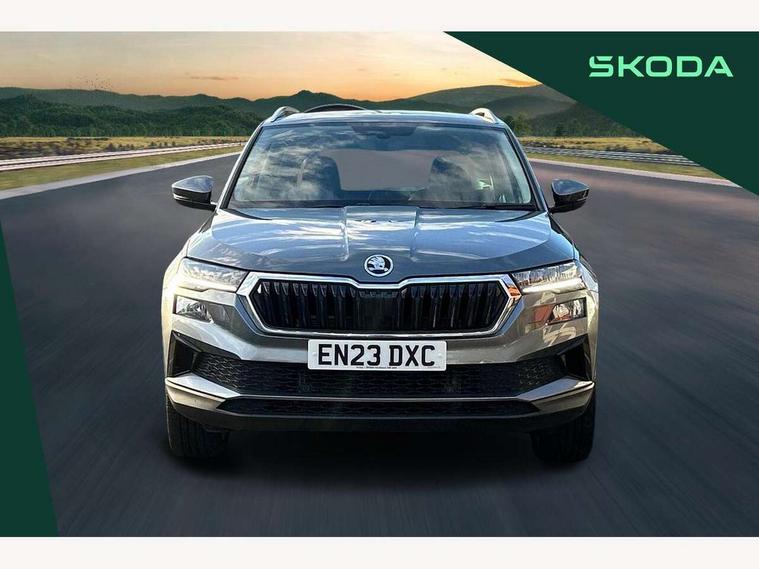 8" Digital display, Care connect, Driver fatigue sensor, Emergency services call system, Outside temperature gauge, Service interval indicator, SmartLink wireless for Apple and wired for Android, Start/stop system with regenerative braking, USB C Port x 2 in front centre console, 8 speakers, DAB radio with Bluetooth, USB connection, Acoustic glass, Aero front windscreen wipers with intermittent function, Auto dimming rear view mirror with light and rain sensors, Black electric window control buttons, Body colour door mirrors and handles, Dynamic headlight range control with cornering light function, Electric front and rear windows with child proof lock, Heated rear windscreen, LED daytime running lights, LED rear lights with high functionality welcome effect and dynamic indicators, Light assistant (coming/leaving home/tunnel light), Plastic scuff plates, Privacy glass, Rear side wing doors, Rear spoiler, Rear window wiper with washer system and intermittent control, Safety reflectors on front doors, 1.5 litre bottle holders in driver and front passenger door panels, 12V socket in boot, 12v socket in front centre armrest with storage compartment and rear air vents, 2 spoke leather heated multifunction steering wheel with DSG paddles, 2 x Tablet holder, 3 rear height adjustable headrests, 3 seat bench in 2nd row, 4 foldable roof handles with rear coat hooks, Black floor carpet, Chrome inner door handles, Decorative door sills with KAROQ badging, Double sided boot floor, Foldable hooks in the boot, Front head restraints, Height adjustable front three point seats belts with tensioners, Height/reach adjust steering wheel, Ice scraper, Illuminated glovebox, Illuminated luggage compartment, Isofix child seat preparation for front passenger seat, Isofix child seat preparation outer rear, Manual lumbar support for front seats, Pen holder, Pollen filter, Rear boot cover, Rear reading lights, Rubbish bin door, Safety vest holder, Single front passenger seat, Storage box in upper central dashboard closed, Sunvisors with illuminated vanity mirrors, Textile floor mats, Ticket holder, Tool kit, VarioFlex seats with standard rear seat release, Boot pack - Karoq, Chrome roof rails + chrome pack - Karoq, Parking pack - Karoq, Automatic door unlocking in case of crash, Automatic fuel cut off in case of crash, Child locks on rear doors, Driver airbag, Electronic parking brake with auto hold function, Emergency rear braking signal, ESC including ABS, MSR, ASR, EDS, HBA, DSR, RBS, MKB and traction control, Front side airbags, Hill hold control, Knee airbags, Passenger airbag with switch-off function, Pedestrian monitor, Seatbelt reminder signalisation and pretensioner for all seats, Three point seatbelts rear, Two tone horn, Tyre pressure display, Tyre pressure monitor, Alarm with interior monitoring, back up horn and tilt sensor with safe function, Electronic engine immobiliser, Keyless entry and start/stop, Remote central locking with 2 remote folding keys, Chrome framed air vents, 18" Procyon silver alloy wheels with anthracite aero inserts, Anti-theft wheel bolts protection, Storage on wheel cover,